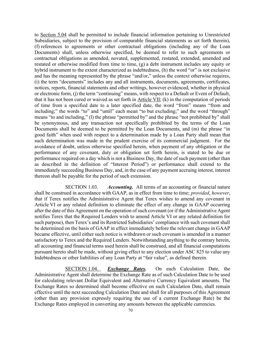 70 to Section 5.04 shall be permitted to include financial information pertaining to Unrestricted Subsidiaries, subject to the provision of comparable financial statements as set forth therein), (f) references to agreements or other contractual obligations (including any of the Loan Documents) shall, unless otherwise specified, be deemed to refer to such agreements or contractual obligations as amended, novated, supplemented, restated, extended, amended and restated or otherwise modified from time to time, (g) a debt instrument includes any equity or hybrid instrument to the extent characterized as indebtedness, (h) the word “or” is not exclusive and has the meaning represented by the phrase “and/or,” unless the context otherwise requires, (i) the term “documents” includes any and all instruments, documents, agreements, certificates, notices, reports, financial statements and other writings, however evidenced, whether in physical or electronic form, (j) the term “continuing” means, with respect to a Default or Event of Default, that it has not been cured or waived as set forth in Article VII; (k) in the computation of periods of time from a specified date to a later specified date, the word “from” means “from and including;” the words “to” and “until” each mean “to but excluding;” and the word “through” means “to and including,” (l) the phrase “permitted by” and the phrase “not prohibited by” shall be synonymous, and any transaction not specifically prohibited by the terms of the Loan Documents shall be deemed to be permitted by the Loan Documents, and (m) the phrase “in good faith” when used with respect to a determination made by a Loan Party shall mean that such determination was made in the prudent exercise of its commercial judgment. For the avoidance of doubt, unless otherwise specified herein, when payment of any obligation or the performance of any covenant, duty or obligation set forth herein, is stated to be due or performance required on a day which is not a Business Day, the date of such payment (other than as described in the definition of “Interest Period”) or performance shall extend to the immediately succeeding Business Day, and, in the case of any payment accruing interest, interest thereon shall be payable for the period of such extension. SECTION 1.03. Accounting. All terms of an accounting or financial nature shall be construed in accordance with GAAP, as in effect from time to time; provided, however, that if Terex notifies the Administrative Agent that Terex wishes to amend any covenant in Article VI or any related definition to eliminate the effect of any change in GAAP occurring after the date of this Agreement on the operation of such covenant (or if the Administrative Agent notifies Terex that the Required Lenders wish to amend Article VI or any related definition for such purpose), then Terex’s and its Restricted Subsidiaries’ compliance with such covenant shall be determined on the basis of GAAP in effect immediately before the relevant change in GAAP became effective, until either such notice is withdrawn or such covenant is amended in a manner satisfactory to Terex and the Required Lenders. Notwithstanding anything to the contrary herein, all accounting and financial terms used herein shall be construed, and all financial computations pursuant hereto shall be made, without giving effect to any election under ASC 825 to value any Indebtedness or other liabilities of any Loan Party at “fair value”, as defined therein. SECTION 1.04. Exchange Rates. On each Calculation Date, the Administrative Agent shall determine the Exchange Rate as of such Calculation Date to be used for calculating relevant Dollar Equivalent and Alternative Currency Equivalent amounts. The Exchange Rates so determined shall become effective on such Calculation Date, shall remain effective until the next succeeding Calculation Date and shall for all purposes of this Agreement (other than any provision expressly requiring the use of a current Exchange Rate) be the Exchange Rates employed in converting any amounts between the applicable currencies.