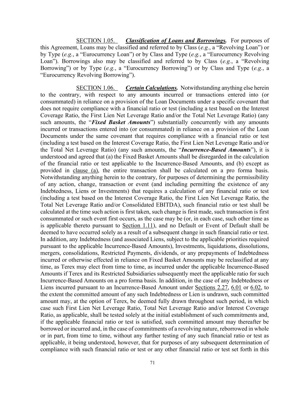 71 SECTION 1.05. Classification of Loans and Borrowings. For purposes of this Agreement, Loans may be classified and referred to by Class (e.g., a “Revolving Loan”) or by Type (e.g., a “Eurocurrency Loan”) or by Class and Type (e.g., a “Eurocurrency Revolving Loan”). Borrowings also may be classified and referred to by Class (e.g., a “Revolving Borrowing”) or by Type (e.g., a “Eurocurrency Borrowing”) or by Class and Type (e.g., a “Eurocurrency Revolving Borrowing”). SECTION 1.06. Certain Calculations. Notwithstanding anything else herein to the contrary, with respect to any amounts incurred or transactions entered into (or consummated) in reliance on a provision of the Loan Documents under a specific covenant that does not require compliance with a financial ratio or test (including a test based on the Interest Coverage Ratio, the First Lien Net Leverage Ratio and/or the Total Net Leverage Ratio) (any such amounts, the “Fixed Basket Amounts”) substantially concurrently with any amounts incurred or transactions entered into (or consummated) in reliance on a provision of the Loan Documents under the same covenant that requires compliance with a financial ratio or test (including a test based on the Interest Coverage Ratio, the First Lien Net Leverage Ratio and/or the Total Net Leverage Ratio) (any such amounts, the “Incurrence-Based Amounts”), it is understood and agreed that (a) the Fixed Basket Amounts shall be disregarded in the calculation of the financial ratio or test applicable to the Incurrence-Based Amounts, and (b) except as provided in clause (a), the entire transaction shall be calculated on a pro forma basis. Notwithstanding anything herein to the contrary, for purposes of determining the permissibility of any action, change, transaction or event (and including permitting the existence of any Indebtedness, Liens or Investments) that requires a calculation of any financial ratio or test (including a test based on the Interest Coverage Ratio, the First Lien Net Leverage Ratio, the Total Net Leverage Ratio and/or Consolidated EBITDA), such financial ratio or test shall be calculated at the time such action is first taken, such change is first made, such transaction is first consummated or such event first occurs, as the case may be (or, in each case, such other time as is applicable thereto pursuant to Section 1.11), and no Default or Event of Default shall be deemed to have occurred solely as a result of a subsequent change in such financial ratio or test. In addition, any Indebtedness (and associated Liens, subject to the applicable priorities required pursuant to the applicable Incurrence-Based Amounts), Investments, liquidations, dissolutions, mergers, consolidations, Restricted Payments, dividends, or any prepayments of Indebtedness incurred or otherwise effected in reliance on Fixed Basket Amounts may be reclassified at any time, as Terex may elect from time to time, as incurred under the applicable Incurrence-Based Amounts if Terex and its Restricted Subsidiaries subsequently meet the applicable ratio for such Incurrence-Based Amounts on a pro forma basis. In addition, in the case of any Indebtedness or Liens incurred pursuant to an Incurrence-Based Amount under Sections 2.27, 6.01 or 6.02, to the extent the committed amount of any such Indebtedness or Lien is undrawn, such committed amount may, at the option of Terex, be deemed fully drawn throughout such period, in which case such First Lien Net Leverage Ratio, Total Net Leverage Ratio and/or Interest Coverage Ratio, as applicable, shall be tested solely at the initial establishment of such commitments and, if the applicable financial ratio or test is satisfied, such committed amount may thereafter be borrowed or incurred and, in the case of commitments of a revolving nature, reborrowed in whole or in part, from time to time, without any further testing of any such financial ratio or test as applicable, it being understood, however, that for purposes of any subsequent determination of compliance with such financial ratio or test or any other financial ratio or test set forth in this