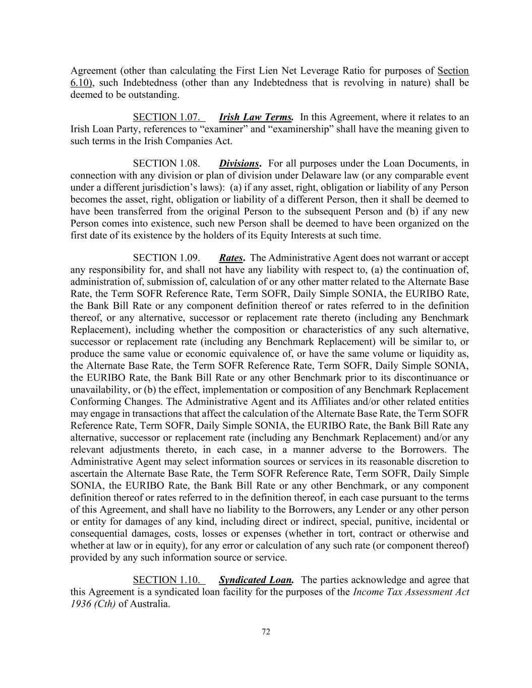 72 Agreement (other than calculating the First Lien Net Leverage Ratio for purposes of Section 6.10), such Indebtedness (other than any Indebtedness that is revolving in nature) shall be deemed to be outstanding. SECTION 1.07. Irish Law Terms. In this Agreement, where it relates to an Irish Loan Party, references to “examiner” and “examinership” shall have the meaning given to such terms in the Irish Companies Act. SECTION 1.08. Divisions. For all purposes under the Loan Documents, in connection with any division or plan of division under Delaware law (or any comparable event under a different jurisdiction’s laws): (a) if any asset, right, obligation or liability of any Person becomes the asset, right, obligation or liability of a different Person, then it shall be deemed to have been transferred from the original Person to the subsequent Person and (b) if any new Person comes into existence, such new Person shall be deemed to have been organized on the first date of its existence by the holders of its Equity Interests at such time. SECTION 1.09. Rates. The Administrative Agent does not warrant or accept any responsibility for, and shall not have any liability with respect to, (a) the continuation of, administration of, submission of, calculation of or any other matter related to the Alternate Base Rate, the Term SOFR Reference Rate, Term SOFR, Daily Simple SONIA, the EURIBO Rate, the Bank Bill Rate or any component definition thereof or rates referred to in the definition thereof, or any alternative, successor or replacement rate thereto (including any Benchmark Replacement), including whether the composition or characteristics of any such alternative, successor or replacement rate (including any Benchmark Replacement) will be similar to, or produce the same value or economic equivalence of, or have the same volume or liquidity as, the Alternate Base Rate, the Term SOFR Reference Rate, Term SOFR, Daily Simple SONIA, the EURIBO Rate, the Bank Bill Rate or any other Benchmark prior to its discontinuance or unavailability, or (b) the effect, implementation or composition of any Benchmark Replacement Conforming Changes. The Administrative Agent and its Affiliates and/or other related entities may engage in transactions that affect the calculation of the Alternate Base Rate, the Term SOFR Reference Rate, Term SOFR, Daily Simple SONIA, the EURIBO Rate, the Bank Bill Rate any alternative, successor or replacement rate (including any Benchmark Replacement) and/or any relevant adjustments thereto, in each case, in a manner adverse to the Borrowers. The Administrative Agent may select information sources or services in its reasonable discretion to ascertain the Alternate Base Rate, the Term SOFR Reference Rate, Term SOFR, Daily Simple SONIA, the EURIBO Rate, the Bank Bill Rate or any other Benchmark, or any component definition thereof or rates referred to in the definition thereof, in each case pursuant to the terms of this Agreement, and shall have no liability to the Borrowers, any Lender or any other person or entity for damages of any kind, including direct or indirect, special, punitive, incidental or consequential damages, costs, losses or expenses (whether in tort, contract or otherwise and whether at law or in equity), for any error or calculation of any such rate (or component thereof) provided by any such information source or service. SECTION 1.10. Syndicated Loan. The parties acknowledge and agree that this Agreement is a syndicated loan facility for the purposes of the Income Tax Assessment Act 1936 (Cth) of Australia.