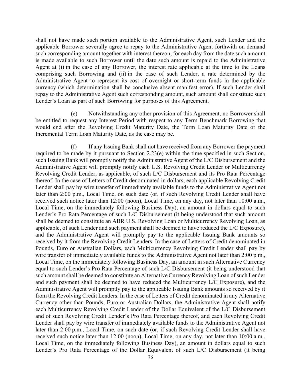 114 Revolving Credit Commitments that are the same Class as the Incremental Revolving Loans and shall not apply to any other Class of Revolving Loans. (e) Notwithstanding anything to the contrary herein, this Section 2.27 shall supersede any provisions in Sections 2.17 or 9.08 to the contrary. SECTION 2.28. Defaulting Lenders. (a) Notwithstanding any provision of this Agreement to the contrary, if any Lender becomes a Defaulting Lender, then, until such time as such Lender is no longer a Defaulting Lender, to the extent permitted by applicable law: (i) Such Defaulting Lender’s right to approve or disapprove any amendment, waiver or consent with respect to this Agreement shall be restricted as set forth in the definition of Required Lenders. (ii) Any payment of principal, interest, fees or other amounts received by the Administrative Agent for the account of such Defaulting Lender (whether voluntary or mandatory, at maturity, pursuant to Article VII or otherwise) or received by the Administrative Agent from a Defaulting Lender pursuant to Section 9.06 shall be applied at such time or times as may be determined by the Administrative Agent as follows: first, to the payment of any amounts owing by such Defaulting Lender to the Administrative Agent hereunder; second, to the payment on a pro rata basis of any amounts owing by such Defaulting Lender to any Issuing Bank or U.S. Swingline Lender hereunder; third, to cash collateralize, in accordance with Section 2.23(j), the Issuing Banks’ Fronting Exposure with respect to such Defaulting Lender; fourth, as the applicable Borrower may request (so long as no Default or Event of Default exists), to the funding of any Loan in respect of which such Defaulting Lender has failed to fund its portion thereof as required by this Agreement, as determined by the Administrative Agent; fifth, if so determined by the Administrative Agent and the applicable Borrower, to be held in a deposit account and released pro rata in order to (A) satisfy such Defaulting Lender’s potential future funding obligations with respect to Loans under this Agreement and (B) cash collateralize, in accordance with Section 2.23(j), the Issuing Banks’ future Fronting Exposure with respect to such Defaulting Lender with respect to future Letters of Credit issued under this Agreement; sixth, to the payment of any amounts owing to the Lenders, the Issuing Banks or the U.S. Swingline Lenders as a result of any judgment of a court of competent jurisdiction obtained by any Lender, Issuing Bank or U.S. Swingline Lender against such Defaulting Lender as a result of such Defaulting Lender’s breach of its obligations under this Agreement; seventh, so long as no Default or Event of Default exists, to the payment of any amounts owing to a Borrower as a result of any judgment of a court of competent jurisdiction obtained by a Borrower against such Defaulting Lender as a result of such Defaulting Lender’s breach of its obligations under this Agreement; and eighth, to such Defaulting Lender or as otherwise directed by a court of competent jurisdiction; provided that if (x) such payment is a payment of the principal amount of any Loans or L/C Disbursements in respect of which such Defaulting Lender has not fully funded its appropriate share and (y) such Loans were made or the related Letters of Credit were issued at a time when the conditions set forth in Section 4.02 were satisfied or waived, such payment shall be applied solely to pay the Loans of, and L/C Disbursements owed to, all Non-Defaulting Lenders on a pro rata basis prior to being applied to the payment of any