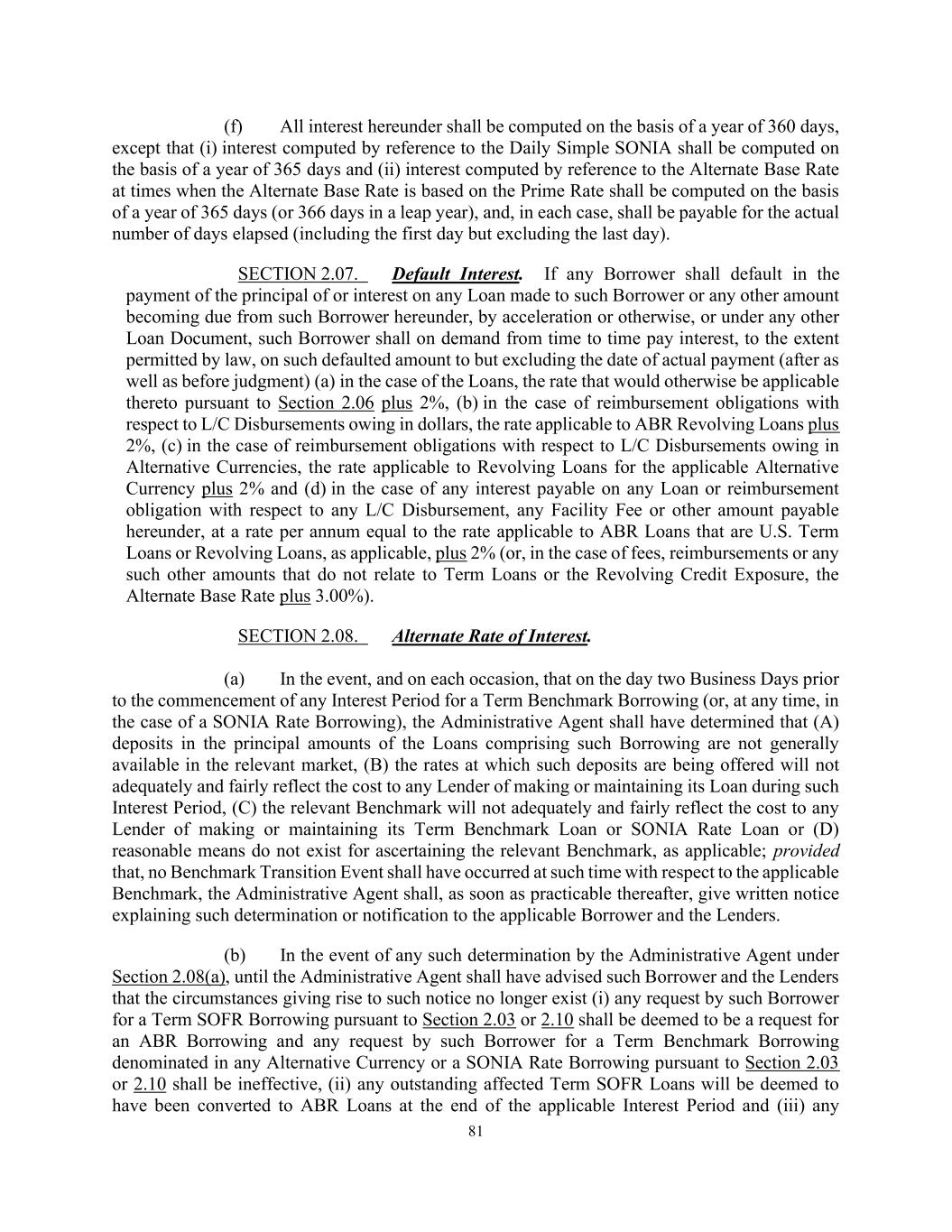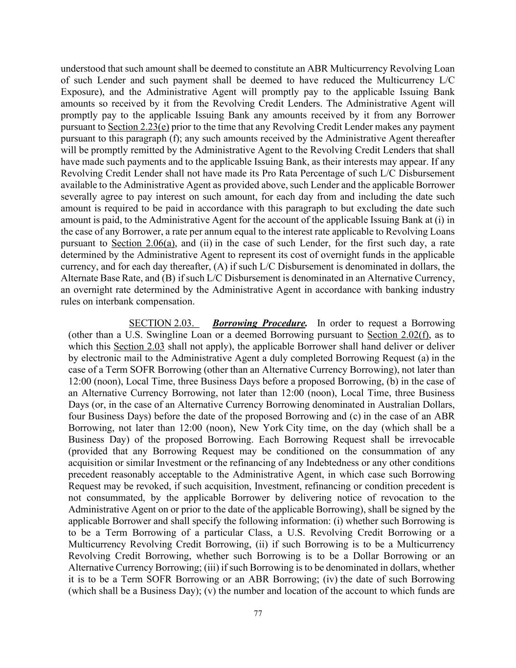 3 “Administrative Agent” shall have the meaning assigned to such term in the introductory paragraph to this Agreement. “Administrative Agent Fees” shall have the meaning assigned to such term in Section 2.05(b). “Administrative Questionnaire” shall mean an Administrative Questionnaire in the form of Exhibit A, or such other form as shall be supplied by the Administrative Agent. “Affected Class” shall have the meaning assigned to such term in Section 2.30(a). “Affected Financial Institution” shall mean (a) any EEA Financial Institution or (b) any U.K. Financial Institution. “Affiliate” shall mean, when used with respect to a specified person, another person that directly, or indirectly through one or more intermediaries, Controls or is Controlled by or is under common Control with the person specified. “Agents” shall have the meaning assigned to such term in Article VIII. “Aggregate Australian Dollar Revolving Credit Exposure” shall mean the aggregate amount of the Lenders’ Multicurrency Revolving Credit Exposure in respect of Borrowings and Letters of Credit denominated in Australian Dollars. “Aggregate Contract Loan Exposure” shall mean the sum of the U.S. Contract Loan Exposure and the Multicurrency Contract Loan Exposure. “Aggregate Multicurrency Revolving Credit Exposure” shall mean the aggregate amount of the Lenders’ Multicurrency Revolving Credit Exposures. “Aggregate Revolving Credit Exposure” shall mean the sum of the Aggregate U.S. Revolving Credit Exposure and the Aggregate Multicurrency Revolving Credit Exposure. “Aggregate U.S. Revolving Credit Exposure” shall mean the aggregate amount of the Lenders’ U.S. Revolving Credit Exposures. “Agreement” shall have the meaning assigned to such term in the introductory paragraph to this Agreement. “Agreement Currency” shall have the meaning assigned to such term in Section 9.16(b). “AHYDO” shall have the meaning assigned to such term in Section 6.09. “Alternate Base Rate” shall mean, for any day, a rate per annum equal to the greatest of (a) the Prime Rate (or in the case of a Dollar Loan to a Subsidiary Borrower, the applicable U.S. Base Rate) in effect on such day, (b) the Federal Funds Effective Rate in effect on such day plus ½ of 1% and (c) Term SOFR for a one-month tenor in effect on such day plus 1.00%; provided that in no event shall the Alternate Base Rate as so determined ever be less than 1.00%. If the