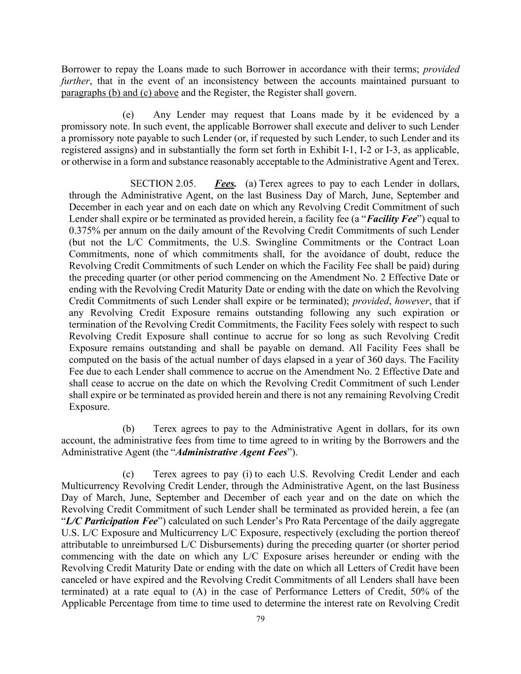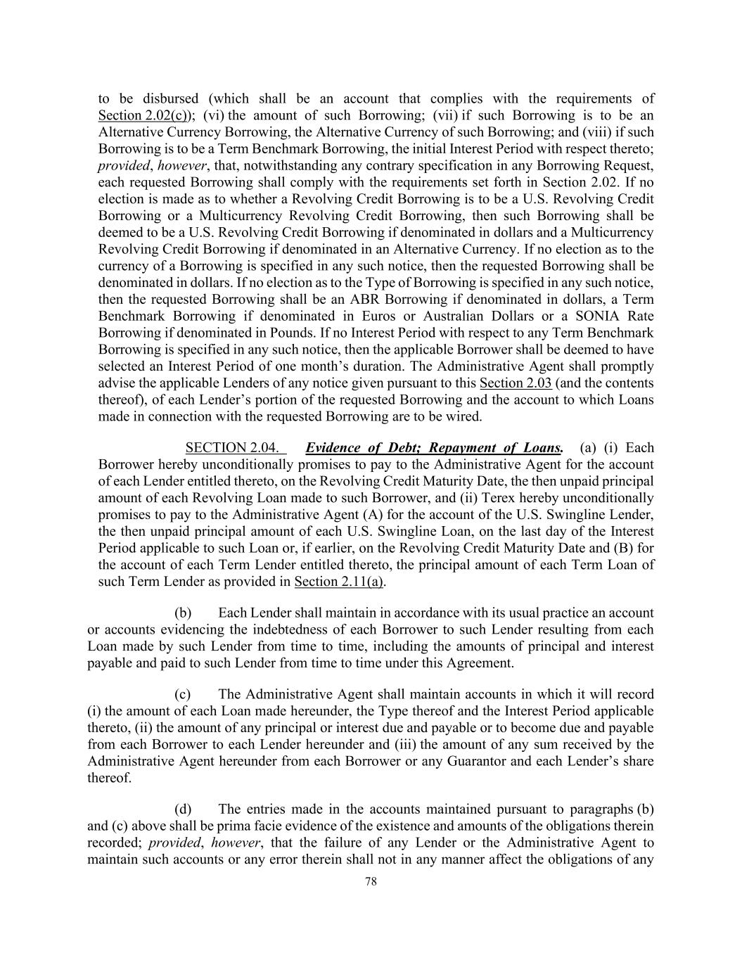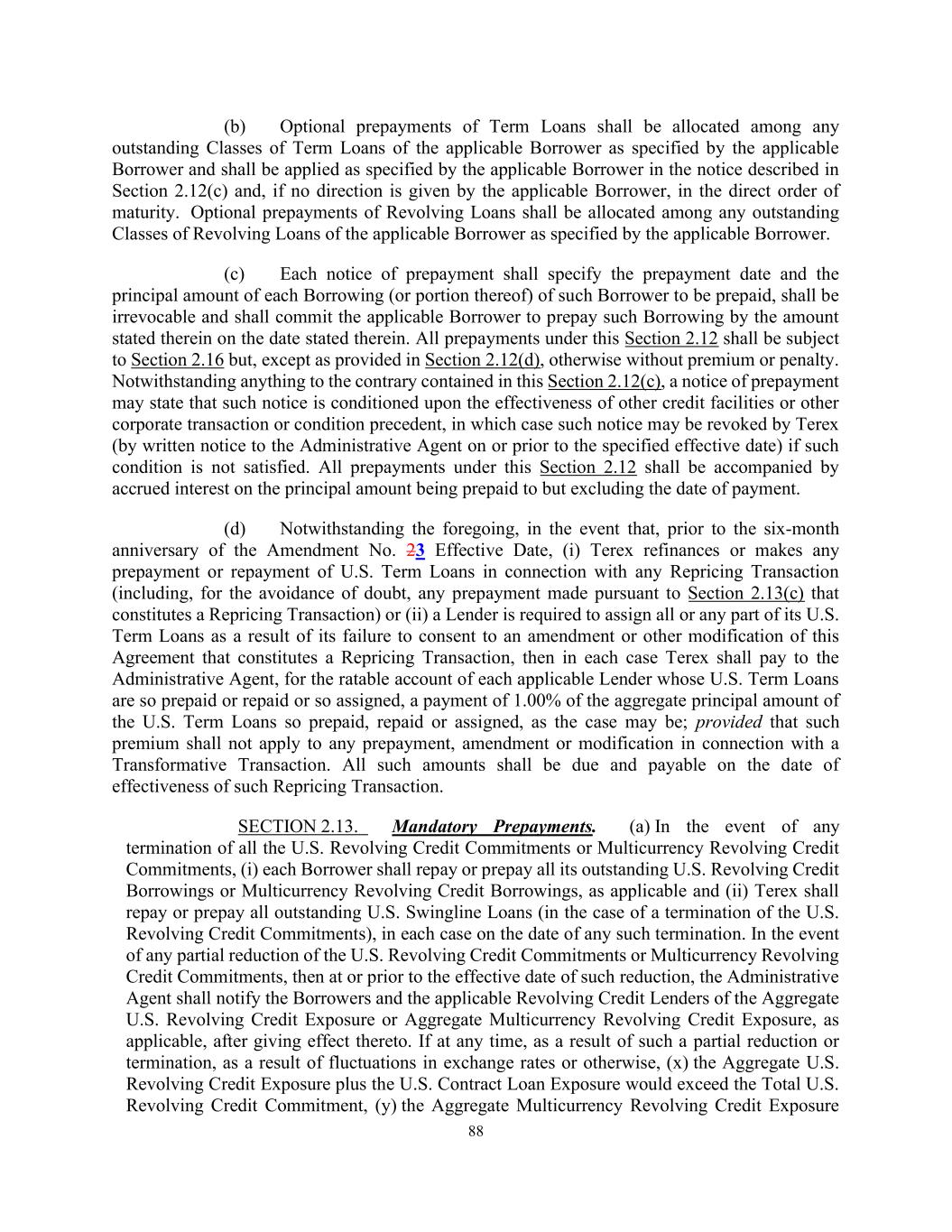 117 availability under such Revolving Credit Lender’s U.S. Revolving Credit Commitments or Multicurrency Revolving Credit Commitments, as applicable, hereunder, except to the extent expressly provided in Section 2.17. (b) At least two Business Days prior to its entry into a Contract Loan Facility with a Revolving Credit Lender, the applicable Borrower shall deliver to the Administrative Agent written notice thereof, signed by such Borrower, that specifies the following information: (i) the Revolving Credit Lender counterparty to such Contract Loan Facility, (ii) the aggregate principal amount of such Revolving Credit Lender’s Contract Loan Commitment thereunder, (iii) whether the Contract Loan Commitments under such Contract Loan Facility shall be U.S. Contract Loan Commitments or Multicurrency Contract Loan Commitments, (iv) the interest rate applicable to the Contract Loans thereunder and (v) the maturity date of such Contract Loan Facility; provided that no Contract Loan shall mature on a date later than the Revolving Credit Maturity Date. Not later than 12:00 (noon), Local Time, one Business Day prior to making a borrowing under any Contract Loan Facility, the applicable Borrower shall deliver to the Administrative Agent written notice thereof, signed by such Borrower, that specifies (i) the amount of such borrowing and (ii) the date of such borrowing and, unless notified by the applicable Borrower prior to 9:00 a.m., Local Time, on the proposed date of such borrowing that the request for such borrowing has been revoked or the requested Contract Loan otherwise was not made by the Lender thereunder, the available U.S. Revolving Credit Commitments or Multicurrency Revolving Credit Commitments, as applicable, shall be deemed to have been used in an aggregate amount equal to the amount of such requested borrowing. The Administrative Agent shall promptly thereafter notify each Revolving Credit Lender of the amount by which its U.S. Revolving Credit Commitments or Multicurrency Revolving Credit Commitments, as applicable, shall be deemed utilized as a result of such Contract Loan. (c) Upon receipt by the Administrative Agent from the applicable Borrower of notice satisfactory to the Administrative Agent that an outstanding Contract Loan has been repaid in full, the U.S. Revolving Credit Commitments or Multicurrency Revolving Credit Commitments, as applicable, deemed utilized in connection with the incurrence of such Contract Loan shall be deemed immediately available (subject in all respects to the other requirements for availability under this Agreement), and the Administrative Agent shall promptly thereafter notify each Revolving Credit Lender of the applicable Class thereof; provided that the failure of the Administrative Agent to so notify the Revolving Credit Lenders of such availability shall not affect the applicable Borrower’s ability to make use thereof in accordance with this Agreement. SECTION 2.30. Loan Modification Offers. (a) Terex may, by written notice to the Administrative Agent from time to time, make one or more offers (each, a “Loan Modification Offer”) to all the Lenders of one or more Classes of Loans and/or Commitments (each Class subject to such a Loan Modification Offer, an “Affected Class”) to make one or more Permitted Amendments pursuant to procedures reasonably specified by the Administrative Agent and reasonably acceptable to Terex. Such notice shall set forth (i) the terms and conditions of the requested Permitted Amendment(s) and (ii) the date on which such Permitted Amendment(s) is requested to become effective (which shall not be less than five Business Days nor more than 30 Business Days after the date of such notice, unless otherwise agreed to by the Administrative Agent). Permitted Amendments shall become effective only with respect to the Loans or Commitments of the Lenders of the Affected Class that accept the applicable Loan