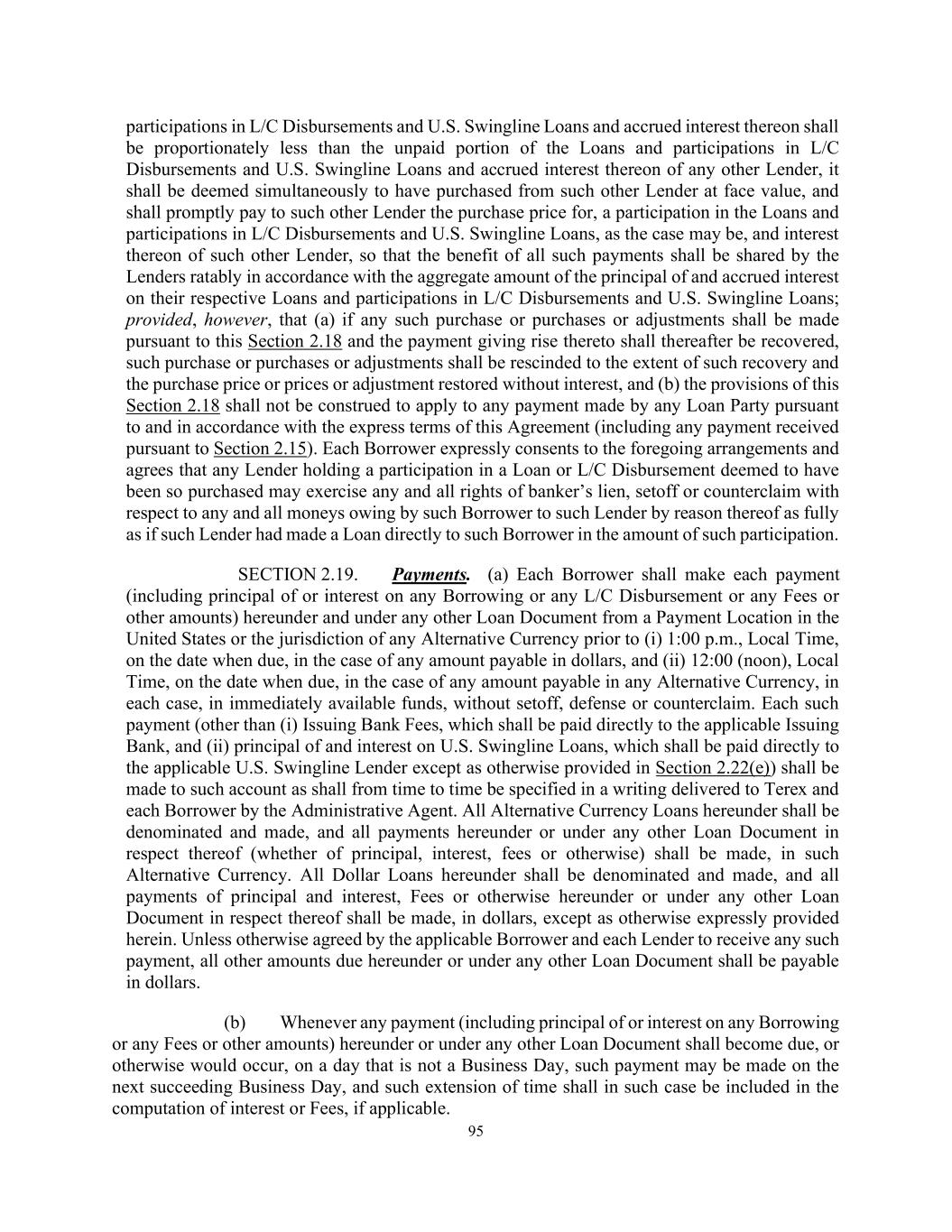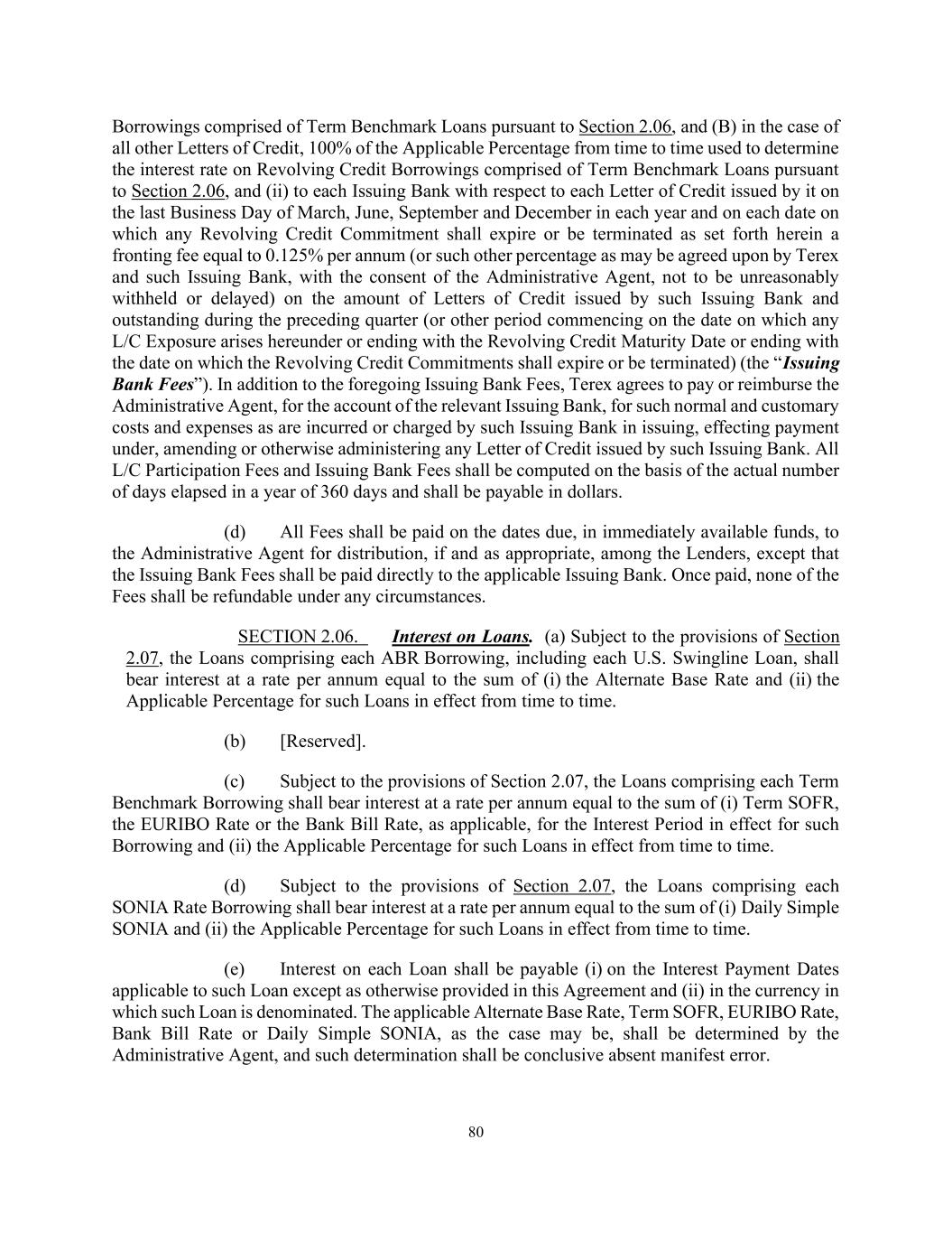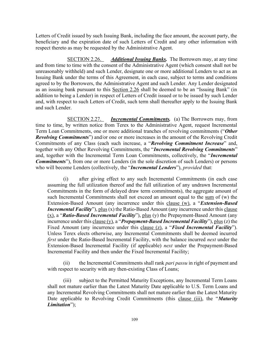 109 Letters of Credit issued by such Issuing Bank, including the face amount, the account party, the beneficiary and the expiration date of such Letters of Credit and any other information with respect thereto as may be requested by the Administrative Agent. SECTION 2.26. Additional Issuing Banks. The Borrowers may, at any time and from time to time with the consent of the Administrative Agent (which consent shall not be unreasonably withheld) and such Lender, designate one or more additional Lenders to act as an Issuing Bank under the terms of this Agreement, in each case, subject to terms and conditions agreed to by the Borrowers, the Administrative Agent and such Lender. Any Lender designated as an issuing bank pursuant to this Section 2.26 shall be deemed to be an “Issuing Bank” (in addition to being a Lender) in respect of Letters of Credit issued or to be issued by such Lender and, with respect to such Letters of Credit, such term shall thereafter apply to the Issuing Bank and such Lender. SECTION 2.27. Incremental Commitments. (a) The Borrowers may, from time to time, by written notice from Terex to the Administrative Agent, request Incremental Term Loan Commitments, one or more additional tranches of revolving commitments (“Other Revolving Commitments”) and/or one or more increases in the amount of the Revolving Credit Commitments of any Class (each such increase, a “Revolving Commitment Increase” and, together with any Other Revolving Commitments, the “Incremental Revolving Commitments” and, together with the Incremental Term Loan Commitments, collectively, the “Incremental Commitments”), from one or more Lenders (in the sole discretion of such Lenders) or persons who will become Lenders (collectively, the “Incremental Lenders”), provided that: (i) after giving effect to any such Incremental Commitments (in each case assuming the full utilization thereof and the full utilization of any undrawn Incremental Commitments in the form of delayed draw term commitments), the aggregate amount of such Incremental Commitments shall not exceed an amount equal to the sum of (w) the Extension-Based Amount (any incurrence under this clause (w), a “Extension-Based Incremental Facility”), plus (x) the Ratio-Based Amount (any incurrence under this clause (x), a “Ratio-Based Incremental Facility”), plus (y) the Prepayment-Based Amount (any incurrence under this clause (y), a “Prepayment-Based Incremental Facility”), plus (z) the Fixed Amount (any incurrence under this clause (z), a “Fixed Incremental Facility”). Unless Terex elects otherwise, any Incremental Commitments shall be deemed incurred first under the Ratio-Based Incremental Facility, with the balance incurred next under the Extension-Based Incremental Facility (if applicable) next under the Prepayment-Based Incremental Facility and then under the Fixed Incremental Facility; (ii) the Incremental Commitments shall rank pari passu in right of payment and with respect to security with any then-existing Class of Loans; (iii) subject to the Permitted Maturity Exceptions, any Incremental Term Loans shall not mature earlier than the Latest Maturity Date applicable to U.S. Term Loans and any Incremental Revolving Commitments shall not mature earlier than the Latest Maturity Date applicable to Revolving Credit Commitments (this clause (iii), the “Maturity Limitation”);