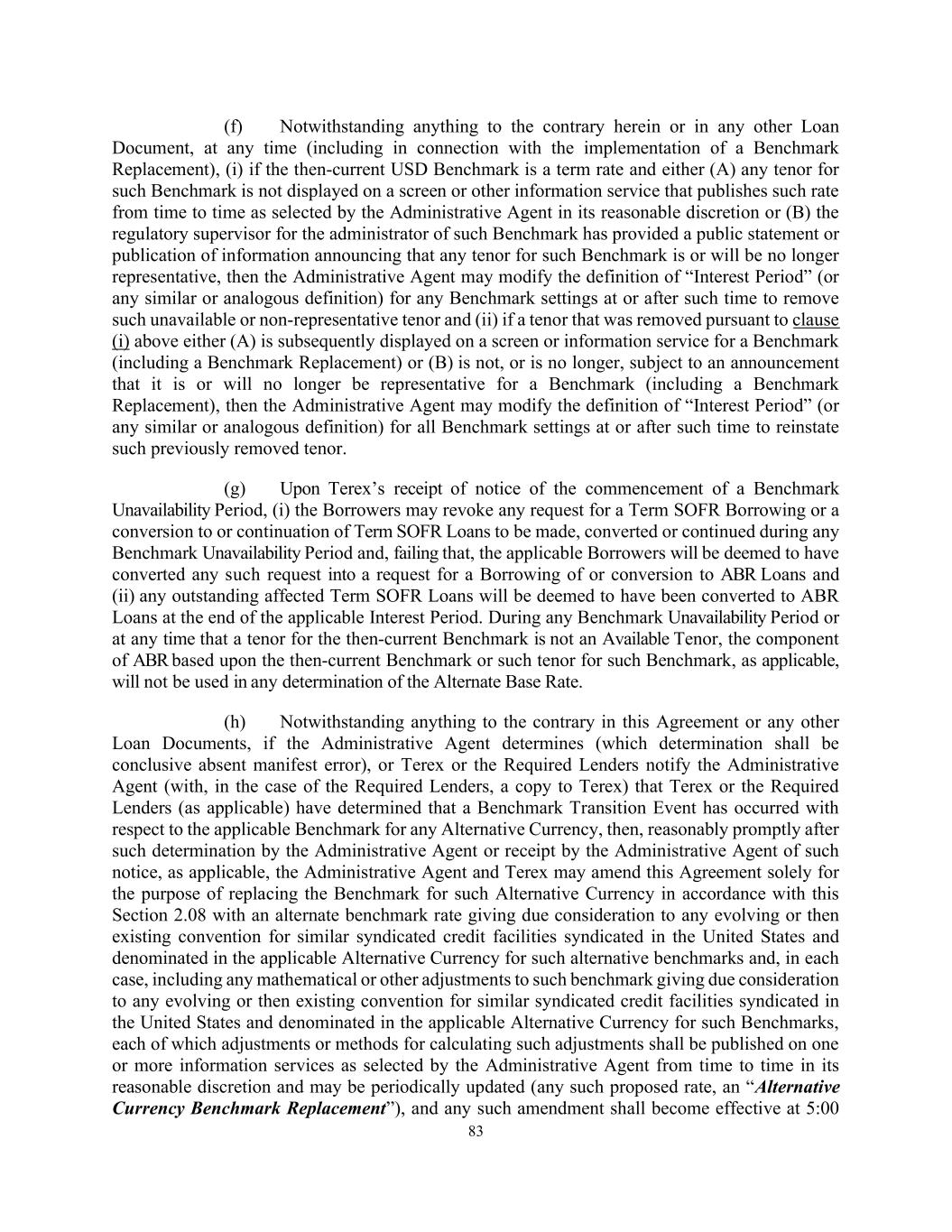 11 in the applicable currency, then “Benchmark” shall mean the applicable Benchmark Replacement to the extent that such Benchmark Replacement has replaced such prior benchmark rate pursuant to Section 2.08. “Benchmark Replacement” shall mean, with respect to any Benchmark Transition Event for the then-current USD Benchmark, the first alternative rate set forth in the order below that can be determined by the Administrative Agent for the applicable Benchmark Replacement Date: (a) Daily Simple SOFR; and (b) the sum of (i) the alternate benchmark rate that has been selected by the Administrative Agent and Terex as the replacement for such Benchmark giving due consideration to (x) any selection or recommendation of a replacement benchmark rate or the mechanism for determining such a rate by the Relevant Governmental Body or (y) any evolving or then-prevailing market convention for determining a benchmark rate as a replacement for the then-current Benchmark for U.S. dollar-denominated syndicated credit facilities at such time and (ii) the related Benchmark Replacement Adjustment. If the Benchmark Replacement as determined pursuant to clause (a) or (b) above would be less than the Floor, the Benchmark Replacement will be deemed to be the Floor for the purposes of this Agreement and the other Loan Documents. “Benchmark Replacement Adjustment” shall mean, with respect to any replacement of the then-current USD Benchmark with an Unadjusted Benchmark Replacement for any applicable Interest Period and Available Tenor, the spread adjustment, or method for calculating or determining such spread adjustment (which may be a positive or negative value or zero) that has been selected by the Administrative Agent and Terex giving due consideration to (a) any selection or recommendation of a spread adjustment, or method for calculating or determining such spread adjustment, for the replacement of such Benchmark with the applicable Unadjusted Benchmark Replacement by the Relevant Governmental Body or (b) any evolving or then-prevailing market convention for determining a spread adjustment, or method for calculating or determining such spread adjustment, for the replacement of such Benchmark with the applicable Unadjusted Benchmark Replacement for U.S. dollar-denominated syndicated credit facilities at such time. “Benchmark Replacement Conforming Changes” shall mean, with respect to the use or administration of any Benchmark or the administration, adoption or implementation of any Benchmark Replacement or Alternative Currency Benchmark Replacement, any technical, administrative or operational changes (including changes to the definition of “Alternate Base Rate”, the definition of “Business Day”, the definition of “U.S. Government Securities Business Day,” the definition of “Interest Period”, timing and frequency of determining rates and making payments of interest, timing of borrowing requests or prepayment, conversion or continuation notices, length of lookback periods, the applicability of breakage provisions and other technical, administrative or operational matters) that the Administrative Agent decides in its reasonable discretion may be appropriate to reflect the adoption and implementation of such rate and to permit the administration thereof by the Administrative Agent in a manner substantially consistent with market practice (or, if the Administrative Agent decides that adoption of any portion of such market practice is not administratively feasible or if the Administrative Agent determines that no