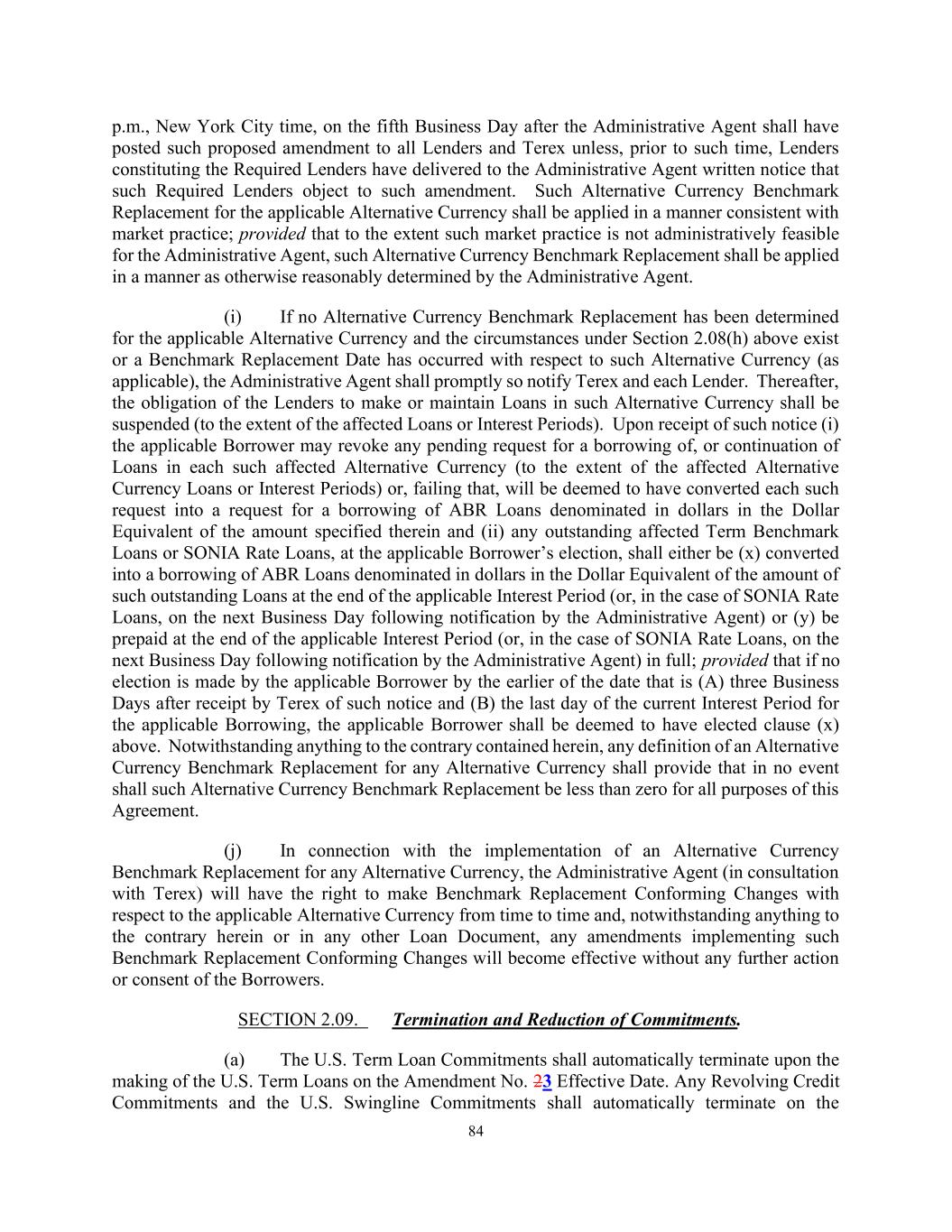 4 Administrative Agent shall have determined (which determination shall be conclusive absent manifest error) that it is unable to ascertain the Federal Funds Effective Rate or Term SOFR for any reason, the Alternate Base Rate shall be determined without regard to clause (b) or (c), as applicable, of the preceding sentence until the circumstances giving rise to such inability no longer exist. Any change in the Alternate Base Rate due to a change in the Prime Rate, the U.S. Base Rate, the Federal Funds Effective Rate or Term SOFR shall be effective on the effective date of such change in the Prime Rate, the U.S. Base Rate, the Federal Funds Effective Rate or Term SOFR, as the case may be. “Alternative Currency” shall mean, (a) with respect to Multicurrency Revolving Loans made to, and Multicurrency Letters of Credit issued for the account of, Terex, the European Borrower or any U.K. Borrower, Pounds, Euro and any other freely available currency or currencies (other than dollars) from time to time approved by the Administrative Agent, each Lender with a Multicurrency Revolving Credit Commitment and the applicable Issuing Bank, as applicable, in each case in its sole discretion, and (b) with respect to Multicurrency Revolving Loans made to, and Multicurrency Letters of Credit issued for the account of, the Australian Borrower, Australian Dollars. “Alternative Currency Benchmark Replacement” shall have the meaning assigned to such term in Section 2.08(h). “Alternative Currency Borrowing” shall mean a Borrowing comprised of Alternative Currency Loans. “Alternative Currency Equivalent” shall mean, on any date of determination, with respect to any amount denominated in dollars in relation to any specified Alternative Currency, the equivalent in such specified Alternative Currency of such amount in dollars, determined by the Administrative Agent pursuant to Section 1.04 using the applicable Exchange Rate then in effect. “Alternative Currency Loan” shall mean any Loan denominated in an Alternative Currency. “Amendment No. 2” shall mean that certain Incremental Assumption Agreement, Borrowing Subsidiary Agreement and Amendment No. 2, dated as of the Amendment No. 2 Effective Date, among Terex, the other Loan Parties party thereto, the Lenders party thereto, the Administrative Agent and the Collateral Agent. “Amendment No. 2 Effective Date” shall mean October 8, 2024. “Amendment No. 2 Joint Bookrunners” shall mean, collectively, UBS Securities LLC, BofA Securities, Inc., Barclays Bank PLC, JPMorgan Chase Bank, N.A., BNP Paribas Securities Corp., HSBC Securities (USA) Inc., Mizuho Bank, Ltd., and Santander Bank, N.A., in their capacities as joint lead arrangers and joint bookrunners. “Amendment No. 3” shall mean that certain Refinancing Facility Agreement and Amendment No. 3, dated as of the Amendment No. 3 Effective Date, among Terex, the other Loan Parties party thereto, the Lenders party thereto, the Administrative Agent and the Collateral Agent.