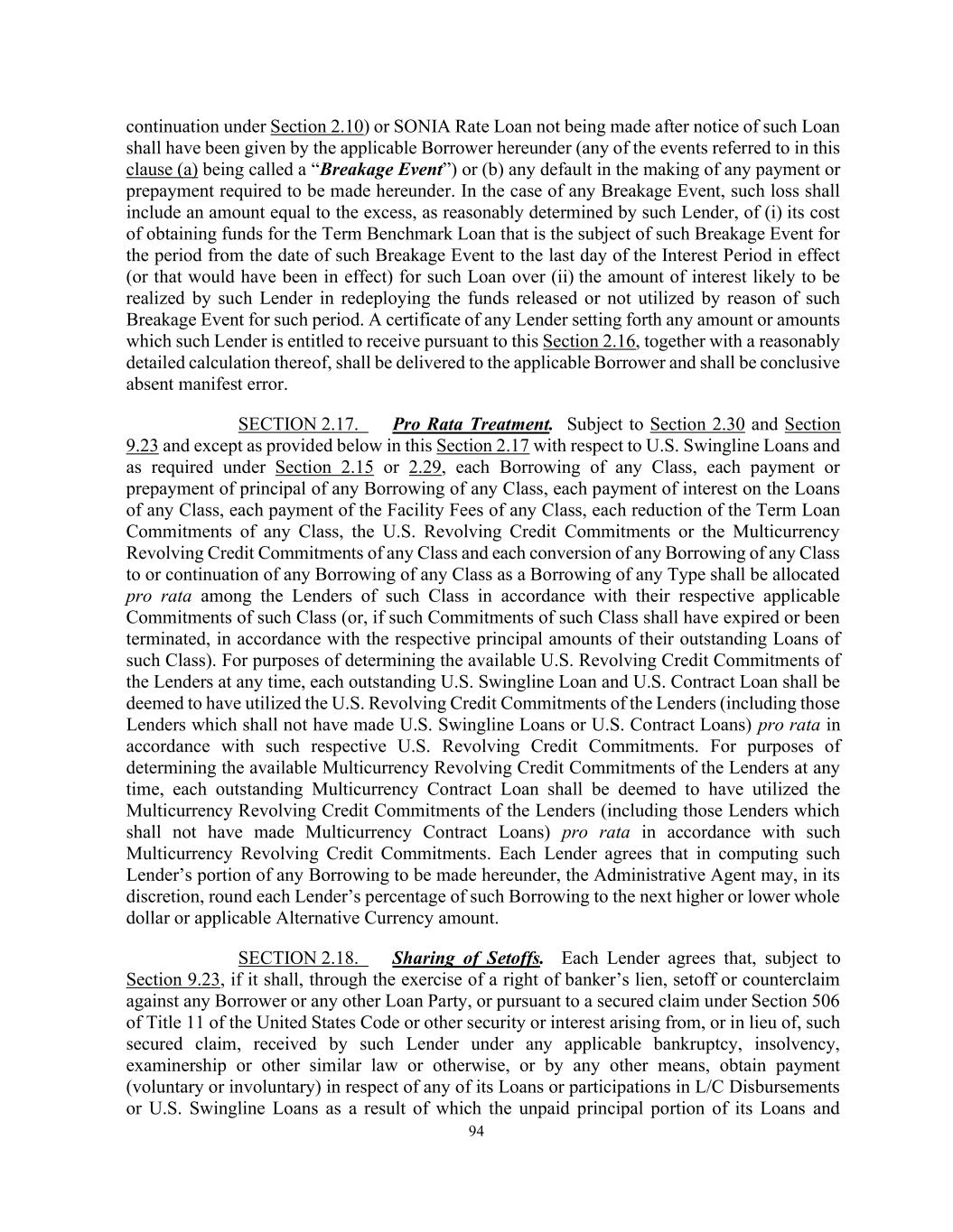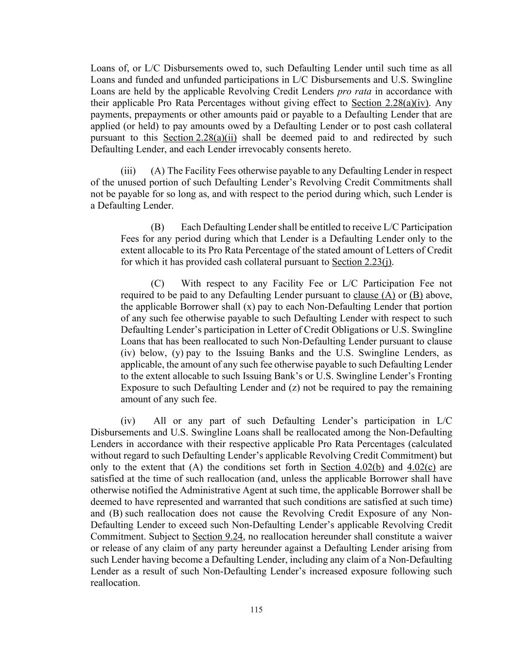 115 Loans of, or L/C Disbursements owed to, such Defaulting Lender until such time as all Loans and funded and unfunded participations in L/C Disbursements and U.S. Swingline Loans are held by the applicable Revolving Credit Lenders pro rata in accordance with their applicable Pro Rata Percentages without giving effect to Section 2.28(a)(iv). Any payments, prepayments or other amounts paid or payable to a Defaulting Lender that are applied (or held) to pay amounts owed by a Defaulting Lender or to post cash collateral pursuant to this Section 2.28(a)(ii) shall be deemed paid to and redirected by such Defaulting Lender, and each Lender irrevocably consents hereto. (iii) (A) The Facility Fees otherwise payable to any Defaulting Lender in respect of the unused portion of such Defaulting Lender’s Revolving Credit Commitments shall not be payable for so long as, and with respect to the period during which, such Lender is a Defaulting Lender. (B) Each Defaulting Lender shall be entitled to receive L/C Participation Fees for any period during which that Lender is a Defaulting Lender only to the extent allocable to its Pro Rata Percentage of the stated amount of Letters of Credit for which it has provided cash collateral pursuant to Section 2.23(j). (C) With respect to any Facility Fee or L/C Participation Fee not required to be paid to any Defaulting Lender pursuant to clause (A) or (B) above, the applicable Borrower shall (x) pay to each Non-Defaulting Lender that portion of any such fee otherwise payable to such Defaulting Lender with respect to such Defaulting Lender’s participation in Letter of Credit Obligations or U.S. Swingline Loans that has been reallocated to such Non-Defaulting Lender pursuant to clause (iv) below, (y) pay to the Issuing Banks and the U.S. Swingline Lenders, as applicable, the amount of any such fee otherwise payable to such Defaulting Lender to the extent allocable to such Issuing Bank’s or U.S. Swingline Lender’s Fronting Exposure to such Defaulting Lender and (z) not be required to pay the remaining amount of any such fee. (iv) All or any part of such Defaulting Lender’s participation in L/C Disbursements and U.S. Swingline Loans shall be reallocated among the Non-Defaulting Lenders in accordance with their respective applicable Pro Rata Percentages (calculated without regard to such Defaulting Lender’s applicable Revolving Credit Commitment) but only to the extent that (A) the conditions set forth in Section 4.02(b) and 4.02(c) are satisfied at the time of such reallocation (and, unless the applicable Borrower shall have otherwise notified the Administrative Agent at such time, the applicable Borrower shall be deemed to have represented and warranted that such conditions are satisfied at such time) and (B) such reallocation does not cause the Revolving Credit Exposure of any Non- Defaulting Lender to exceed such Non-Defaulting Lender’s applicable Revolving Credit Commitment. Subject to Section 9.24, no reallocation hereunder shall constitute a waiver or release of any claim of any party hereunder against a Defaulting Lender arising from such Lender having become a Defaulting Lender, including any claim of a Non-Defaulting Lender as a result of such Non-Defaulting Lender’s increased exposure following such reallocation.