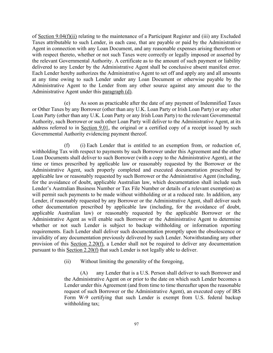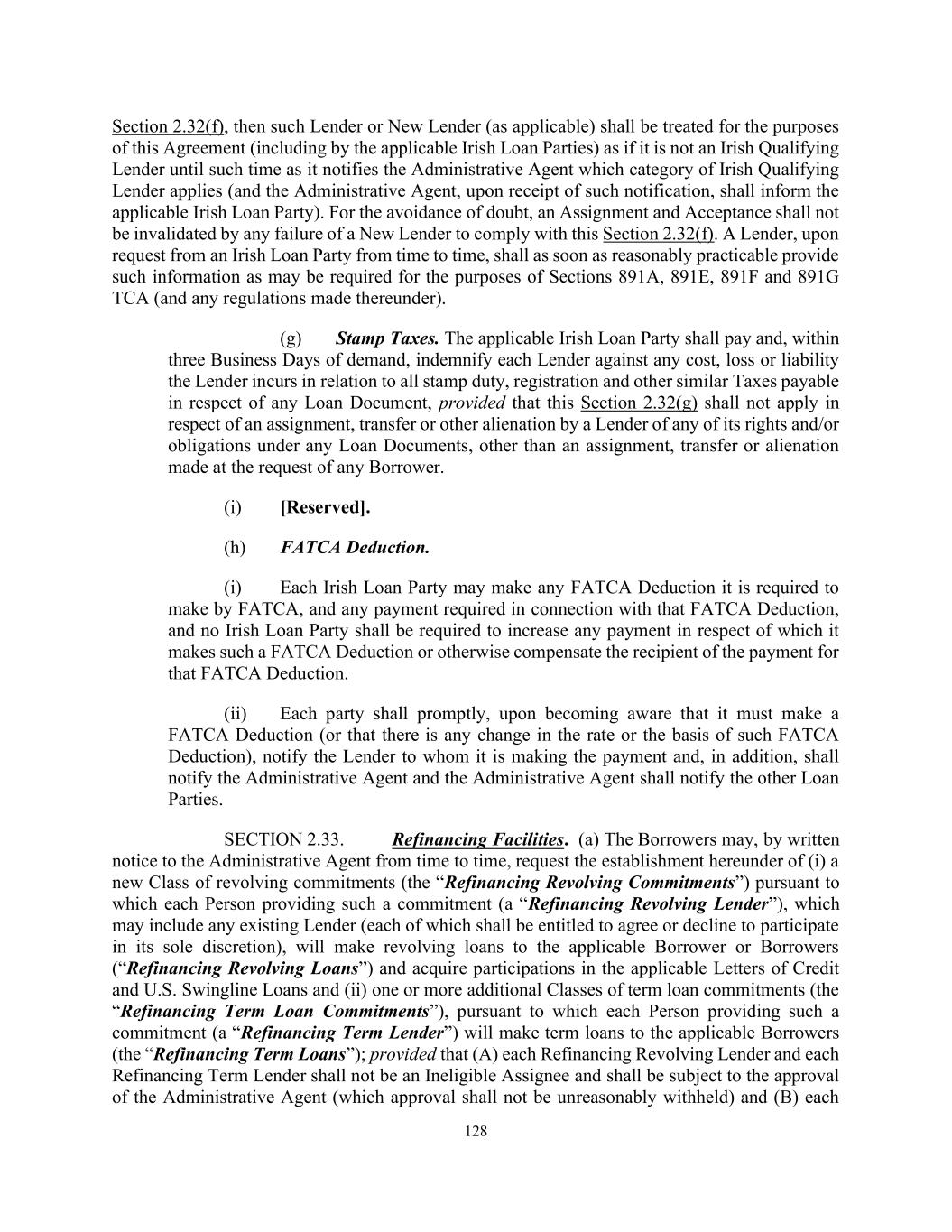 128 Section 2.32(f), then such Lender or New Lender (as applicable) shall be treated for the purposes of this Agreement (including by the applicable Irish Loan Parties) as if it is not an Irish Qualifying Lender until such time as it notifies the Administrative Agent which category of Irish Qualifying Lender applies (and the Administrative Agent, upon receipt of such notification, shall inform the applicable Irish Loan Party). For the avoidance of doubt, an Assignment and Acceptance shall not be invalidated by any failure of a New Lender to comply with this Section 2.32(f). A Lender, upon request from an Irish Loan Party from time to time, shall as soon as reasonably practicable provide such information as may be required for the purposes of Sections 891A, 891E, 891F and 891G TCA (and any regulations made thereunder). (g) Stamp Taxes. The applicable Irish Loan Party shall pay and, within three Business Days of demand, indemnify each Lender against any cost, loss or liability the Lender incurs in relation to all stamp duty, registration and other similar Taxes payable in respect of any Loan Document, provided that this Section 2.32(g) shall not apply in respect of an assignment, transfer or other alienation by a Lender of any of its rights and/or obligations under any Loan Documents, other than an assignment, transfer or alienation made at the request of any Borrower. (i) [Reserved]. (h) FATCA Deduction. (i) Each Irish Loan Party may make any FATCA Deduction it is required to make by FATCA, and any payment required in connection with that FATCA Deduction, and no Irish Loan Party shall be required to increase any payment in respect of which it makes such a FATCA Deduction or otherwise compensate the recipient of the payment for that FATCA Deduction. (ii) Each party shall promptly, upon becoming aware that it must make a FATCA Deduction (or that there is any change in the rate or the basis of such FATCA Deduction), notify the Lender to whom it is making the payment and, in addition, shall notify the Administrative Agent and the Administrative Agent shall notify the other Loan Parties. SECTION 2.33. Refinancing Facilities. (a) The Borrowers may, by written notice to the Administrative Agent from time to time, request the establishment hereunder of (i) a new Class of revolving commitments (the “Refinancing Revolving Commitments”) pursuant to which each Person providing such a commitment (a “Refinancing Revolving Lender”), which may include any existing Lender (each of which shall be entitled to agree or decline to participate in its sole discretion), will make revolving loans to the applicable Borrower or Borrowers (“Refinancing Revolving Loans”) and acquire participations in the applicable Letters of Credit and U.S. Swingline Loans and (ii) one or more additional Classes of term loan commitments (the “Refinancing Term Loan Commitments”), pursuant to which each Person providing such a commitment (a “Refinancing Term Lender”) will make term loans to the applicable Borrowers (the “Refinancing Term Loans”); provided that (A) each Refinancing Revolving Lender and each Refinancing Term Lender shall not be an Ineligible Assignee and shall be subject to the approval of the Administrative Agent (which approval shall not be unreasonably withheld) and (B) each