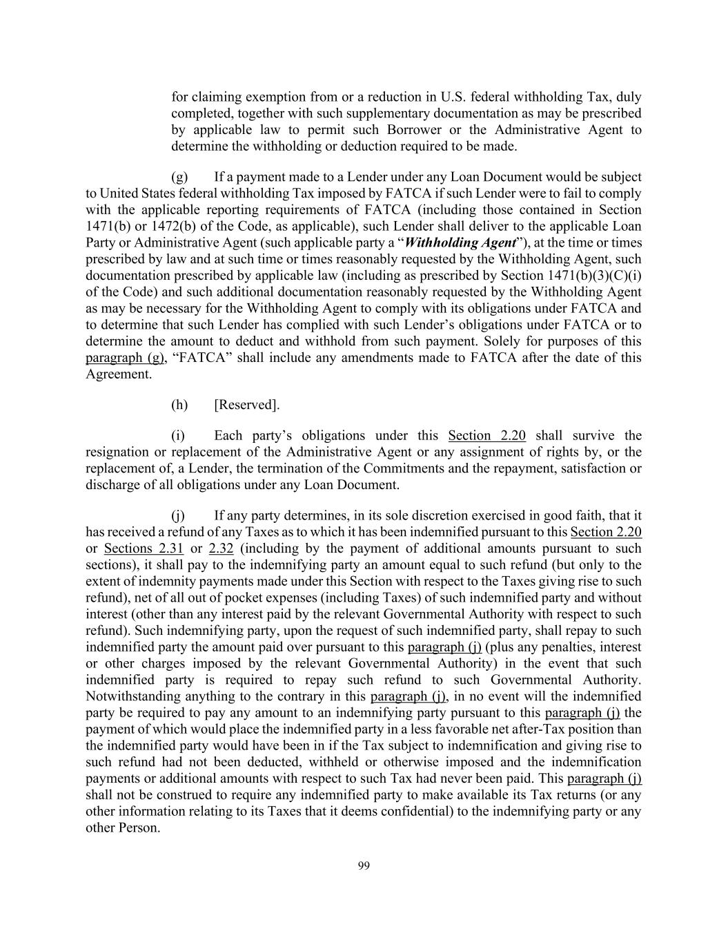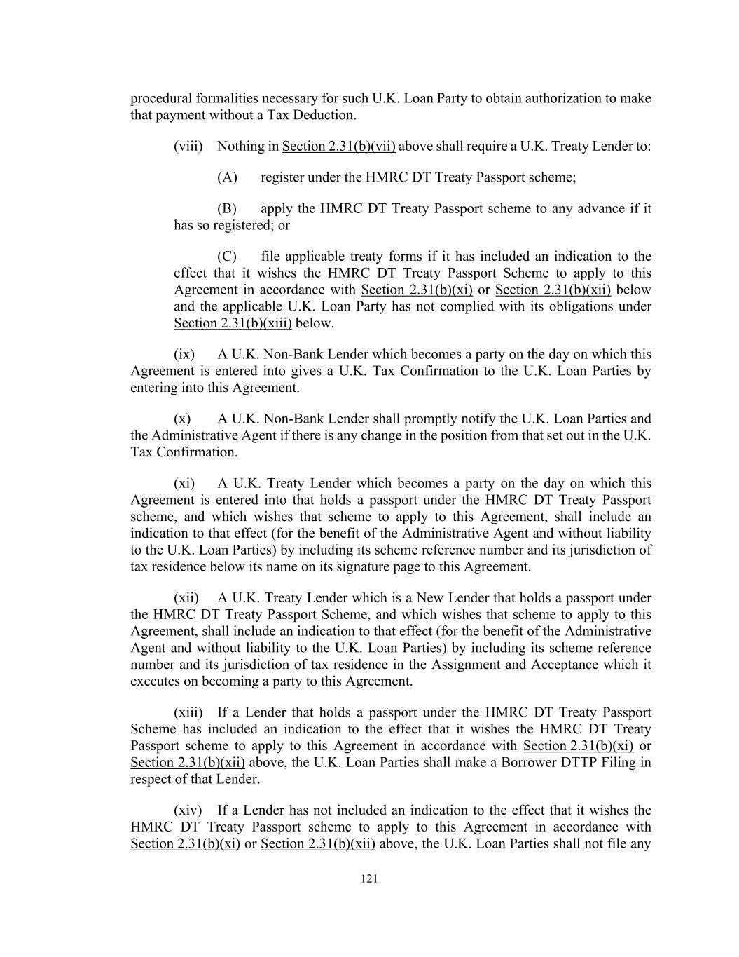 121 procedural formalities necessary for such U.K. Loan Party to obtain authorization to make that payment without a Tax Deduction. (viii) Nothing in Section 2.31(b)(vii) above shall require a U.K. Treaty Lender to: (A) register under the HMRC DT Treaty Passport scheme; (B) apply the HMRC DT Treaty Passport scheme to any advance if it has so registered; or (C) file applicable treaty forms if it has included an indication to the effect that it wishes the HMRC DT Treaty Passport Scheme to apply to this Agreement in accordance with Section 2.31(b)(xi) or Section 2.31(b)(xii) below and the applicable U.K. Loan Party has not complied with its obligations under Section 2.31(b)(xiii) below. (ix) A U.K. Non-Bank Lender which becomes a party on the day on which this Agreement is entered into gives a U.K. Tax Confirmation to the U.K. Loan Parties by entering into this Agreement. (x) A U.K. Non-Bank Lender shall promptly notify the U.K. Loan Parties and the Administrative Agent if there is any change in the position from that set out in the U.K. Tax Confirmation. (xi) A U.K. Treaty Lender which becomes a party on the day on which this Agreement is entered into that holds a passport under the HMRC DT Treaty Passport scheme, and which wishes that scheme to apply to this Agreement, shall include an indication to that effect (for the benefit of the Administrative Agent and without liability to the U.K. Loan Parties) by including its scheme reference number and its jurisdiction of tax residence below its name on its signature page to this Agreement. (xii) A U.K. Treaty Lender which is a New Lender that holds a passport under the HMRC DT Treaty Passport Scheme, and which wishes that scheme to apply to this Agreement, shall include an indication to that effect (for the benefit of the Administrative Agent and without liability to the U.K. Loan Parties) by including its scheme reference number and its jurisdiction of tax residence in the Assignment and Acceptance which it executes on becoming a party to this Agreement. (xiii) If a Lender that holds a passport under the HMRC DT Treaty Passport Scheme has included an indication to the effect that it wishes the HMRC DT Treaty Passport scheme to apply to this Agreement in accordance with Section 2.31(b)(xi) or Section 2.31(b)(xii) above, the U.K. Loan Parties shall make a Borrower DTTP Filing in respect of that Lender. (xiv) If a Lender has not included an indication to the effect that it wishes the HMRC DT Treaty Passport scheme to apply to this Agreement in accordance with Section 2.31(b)(xi) or Section 2.31(b)(xii) above, the U.K. Loan Parties shall not file any