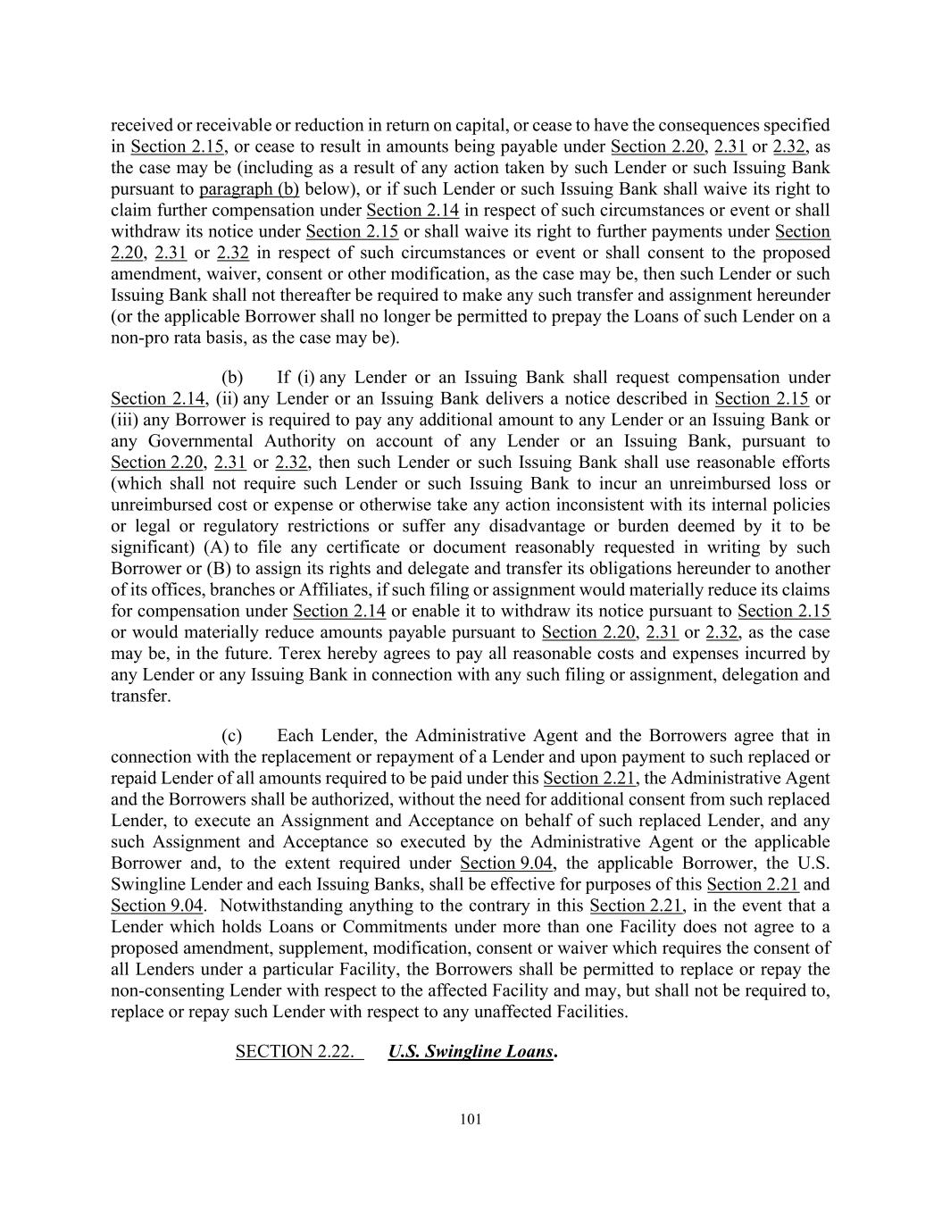 182 any other Lender and based on such documents and information as it shall deem appropriate at the time, continue to make its own credit decisions in taking or not taking action under this Agreement; (vii) such assignee appoints and authorizes the Administrative Agent and the Collateral Agent to take such action as agent on its behalf and to exercise such powers under this Agreement as are delegated to the Administrative Agent and the Collateral Agent, respectively, by the terms hereof, together with such powers as are reasonably incidental thereto; and (viii) such assignee agrees that it will perform in accordance with their terms all the obligations which by the terms of this Agreement are required to be performed by it as a Lender. (d) The Administrative Agent, acting for this purpose as an agent of the Borrowers, shall maintain at one of its offices in The City of New York a copy of each Assignment and Acceptance delivered to it and a register for the recordation of the names and addresses of the Lenders, and the Commitment of, and principal amount of the Loans owing to, each Lender pursuant to the terms hereof from time to time (the “Register”). The entries in the Register shall be conclusive absent manifest error and the Borrowers, the Administrative Agent, the Issuing Banks, the Collateral Agent and the Lenders shall treat each person whose name is recorded in the Register pursuant to the terms hereof as a Lender hereunder for all purposes of this Agreement, notwithstanding notice to the contrary. The Register shall be available for inspection by the Borrowers, any Affiliate of the Administrative Agent, any Issuing Bank (provided that any such Issuing Bank may only inspect entries relating to the Revolving Credit Commitments), the Collateral Agent and any Lender (provided that any such Lender may only inspect any entry relating to such Lender’s Commitments and Loans), at any reasonable time and from time to time upon reasonable prior notice. (e) Upon its receipt of a duly completed Assignment and Acceptance executed by an assigning Lender and an assignee, an Administrative Questionnaire completed in respect of the assignee (unless the assignee shall already be a Lender hereunder), the processing and recordation fee referred to in paragraph (b) above and, if required, the written consent of Terex, the applicable U.S. Swingline Lender, the Issuing Banks and the Administrative Agent to such assignment and any applicable tax forms, the Administrative Agent shall accept such Assignment and Acceptance and record the information contained therein in the Register. No assignment shall be effective unless it has been recorded in the Register as provided in this paragraph (e). (f) (i) Each Lender may without the consent of any Borrower, any U.S. Swingline Lender, any Issuing Bank or the Administrative Agent sell participations to one or more banks or other entities (other than to a Disqualified Lender) (a “Participant”) in all or a portion of its rights and obligations under this Agreement (including all or a portion of its Commitment and the Loans owing to it); provided, however, that (i) such Lender’s obligations under this Agreement shall remain unchanged, (ii) such Lender shall remain solely responsible to the other parties hereto for the performance of such obligations, (iii) the participating banks or other entities shall be entitled to the benefit of the cost protection provisions contained in Sections 2.14, 2.16, 2.20, 2.31 and 2.32 (subject to the requirements and limitations therein, including the requirements under Sections 2.20(f) and (g) (it being understood that the documentation required thereunder shall be delivered to the participating Lender)) to the same extent as if they were Lenders (but, with respect to any particular participant, to no greater extent than the Lender that sold the participation to such participant, except to the extent such entitlement to receive a greater payment results from a Change in Law that occurs after the participant acquired the applicable participation) and (iv) the