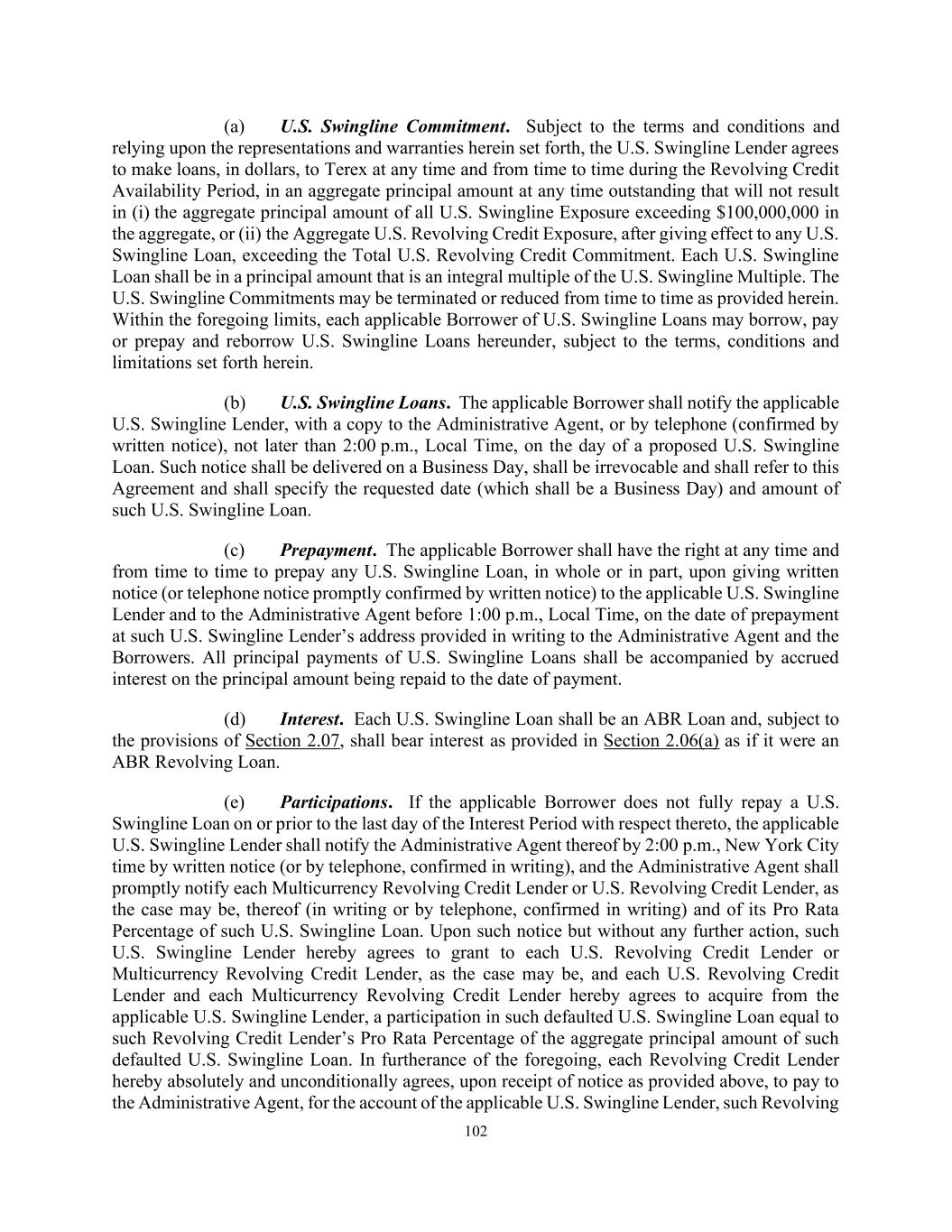 67 “U.S. Person” shall mean any Person that is a “United States Person” as defined in Section 7701(a)(30) of the Code. “U.S. Revolving Credit Borrowing” shall mean a Borrowing comprised of U.S. Revolving Loans. “U.S. Revolving Credit Commitment” shall mean, with respect to each U.S. Revolving Credit Lender, the commitment of such U.S. Revolving Credit Lender to make U.S. Revolving Loans and to acquire participations in U.S. L/C Disbursements and U.S. Swingline Loans hereunder as set forth on Schedule II to the Amendment No. 2, or in the Assignment and Acceptance pursuant to which such U.S. Revolving Credit Lender assumed its U.S. Revolving Credit Commitment, as applicable, as the same may be (a) reduced from time to time pursuant to Section 2.09 and (b) reduced or increased from time to time pursuant to assignments by or to such U.S. Revolving Credit Lender pursuant to Section 9.04. The aggregate principal amount of the U.S. Revolving Credit Commitments on the Amendment No. 2 Effective Date is $400,000,000. “U.S. Revolving Credit Exposure” shall mean, with respect to any Lender at any time, the sum of (a) the aggregate principal amount of all outstanding U.S. Revolving Loans of such Lender at such time and (b) the aggregate amount of such Lender’s U.S. L/C Exposure and U.S. Swingline Exposure at such time. “U.S. Revolving Credit Lender” shall mean a Lender with a U.S. Revolving Credit Commitment or an outstanding U.S. Revolving Loan. “U.S. Revolving Loans” shall mean the revolving loans made by the U.S. Revolving Credit Lenders to Terex pursuant to clause (i) of Section 2.01(b). Each U.S. Revolving Loan shall be denominated in dollars and shall be a Term SOFR Revolving Loan or an ABR Revolving Loan. “U.S. Subsidiary” shall mean a Subsidiary incorporated or organized under the laws of the United States of America, any State thereof or the District of Columbia. “U.S. Swingline Commitment” shall mean the commitment of the U.S. Swingline Lender to make loans pursuant to Section 2.22. “U.S. Swingline Exposure” shall mean at any time the aggregate principal amount at such time of all outstanding U.S. Swingline Loans. The U.S. Swingline Exposure of any U.S. Revolving Credit Lender at any time shall equal its Pro Rata Percentage of the aggregate U.S. Swingline Exposure at such time. “U.S. Swingline Lender” shall mean any Lender (or its Affiliate) designated as such by Terex with the consent of the Administrative Agent (which shall not be unreasonably withheld or delayed) and such Lender, and its successors and assigns, in each case in its capacity as lender of U.S. Swingline Loans hereunder. “U.S. Swingline Loan” shall mean any loan made by the U.S. Swingline Lender pursuant to its U.S. Swingline Commitment.