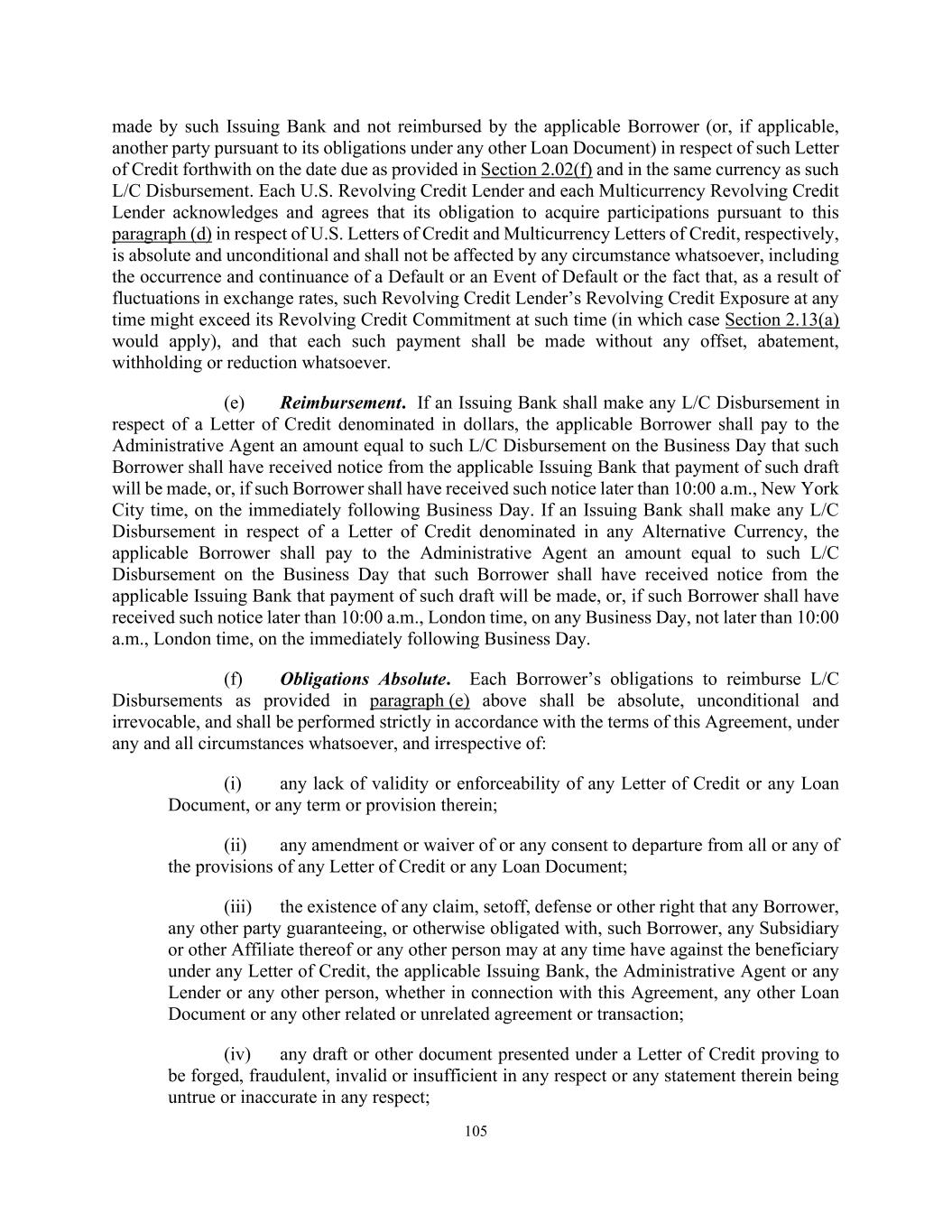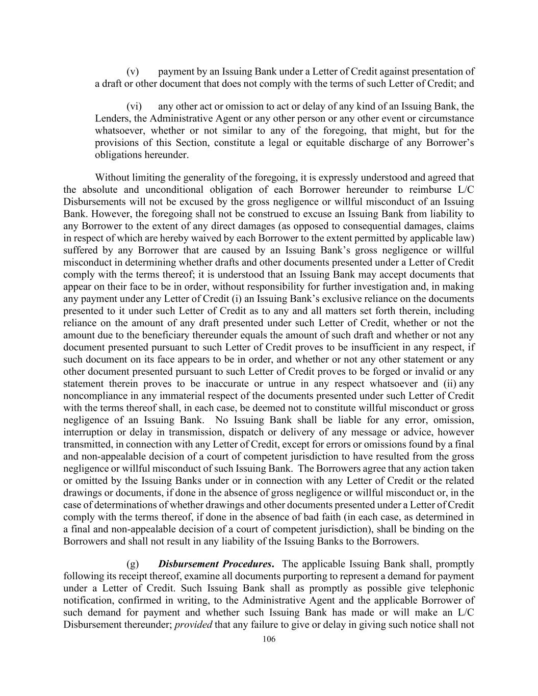 106 (v) payment by an Issuing Bank under a Letter of Credit against presentation of a draft or other document that does not comply with the terms of such Letter of Credit; and (vi) any other act or omission to act or delay of any kind of an Issuing Bank, the Lenders, the Administrative Agent or any other person or any other event or circumstance whatsoever, whether or not similar to any of the foregoing, that might, but for the provisions of this Section, constitute a legal or equitable discharge of any Borrower’s obligations hereunder. Without limiting the generality of the foregoing, it is expressly understood and agreed that the absolute and unconditional obligation of each Borrower hereunder to reimburse L/C Disbursements will not be excused by the gross negligence or willful misconduct of an Issuing Bank. However, the foregoing shall not be construed to excuse an Issuing Bank from liability to any Borrower to the extent of any direct damages (as opposed to consequential damages, claims in respect of which are hereby waived by each Borrower to the extent permitted by applicable law) suffered by any Borrower that are caused by an Issuing Bank’s gross negligence or willful misconduct in determining whether drafts and other documents presented under a Letter of Credit comply with the terms thereof; it is understood that an Issuing Bank may accept documents that appear on their face to be in order, without responsibility for further investigation and, in making any payment under any Letter of Credit (i) an Issuing Bank’s exclusive reliance on the documents presented to it under such Letter of Credit as to any and all matters set forth therein, including reliance on the amount of any draft presented under such Letter of Credit, whether or not the amount due to the beneficiary thereunder equals the amount of such draft and whether or not any document presented pursuant to such Letter of Credit proves to be insufficient in any respect, if such document on its face appears to be in order, and whether or not any other statement or any other document presented pursuant to such Letter of Credit proves to be forged or invalid or any statement therein proves to be inaccurate or untrue in any respect whatsoever and (ii) any noncompliance in any immaterial respect of the documents presented under such Letter of Credit with the terms thereof shall, in each case, be deemed not to constitute willful misconduct or gross negligence of an Issuing Bank. No Issuing Bank shall be liable for any error, omission, interruption or delay in transmission, dispatch or delivery of any message or advice, however transmitted, in connection with any Letter of Credit, except for errors or omissions found by a final and non-appealable decision of a court of competent jurisdiction to have resulted from the gross negligence or willful misconduct of such Issuing Bank. The Borrowers agree that any action taken or omitted by the Issuing Banks under or in connection with any Letter of Credit or the related drawings or documents, if done in the absence of gross negligence or willful misconduct or, in the case of determinations of whether drawings and other documents presented under a Letter of Credit comply with the terms thereof, if done in the absence of bad faith (in each case, as determined in a final and non-appealable decision of a court of competent jurisdiction), shall be binding on the Borrowers and shall not result in any liability of the Issuing Banks to the Borrowers. (g) Disbursement Procedures. The applicable Issuing Bank shall, promptly following its receipt thereof, examine all documents purporting to represent a demand for payment under a Letter of Credit. Such Issuing Bank shall as promptly as possible give telephonic notification, confirmed in writing, to the Administrative Agent and the applicable Borrower of such demand for payment and whether such Issuing Bank has made or will make an L/C Disbursement thereunder; provided that any failure to give or delay in giving such notice shall not