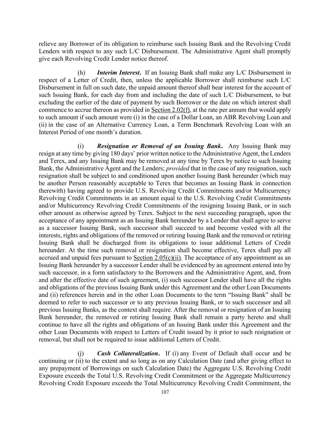 107 relieve any Borrower of its obligation to reimburse such Issuing Bank and the Revolving Credit Lenders with respect to any such L/C Disbursement. The Administrative Agent shall promptly give each Revolving Credit Lender notice thereof. (h) Interim Interest. If an Issuing Bank shall make any L/C Disbursement in respect of a Letter of Credit, then, unless the applicable Borrower shall reimburse such L/C Disbursement in full on such date, the unpaid amount thereof shall bear interest for the account of such Issuing Bank, for each day from and including the date of such L/C Disbursement, to but excluding the earlier of the date of payment by such Borrower or the date on which interest shall commence to accrue thereon as provided in Section 2.02(f), at the rate per annum that would apply to such amount if such amount were (i) in the case of a Dollar Loan, an ABR Revolving Loan and (ii) in the case of an Alternative Currency Loan, a Term Benchmark Revolving Loan with an Interest Period of one month’s duration. (i) Resignation or Removal of an Issuing Bank. Any Issuing Bank may resign at any time by giving 180 days’ prior written notice to the Administrative Agent, the Lenders and Terex, and any Issuing Bank may be removed at any time by Terex by notice to such Issuing Bank, the Administrative Agent and the Lenders; provided that in the case of any resignation, such resignation shall be subject to and conditioned upon another Issuing Bank hereunder (which may be another Person reasonably acceptable to Terex that becomes an Issuing Bank in connection therewith) having agreed to provide U.S. Revolving Credit Commitments and/or Multicurrency Revolving Credit Commitments in an amount equal to the U.S. Revolving Credit Commitments and/or Multicurrency Revolving Credit Commitments of the resigning Issuing Bank, or in such other amount as otherwise agreed by Terex. Subject to the next succeeding paragraph, upon the acceptance of any appointment as an Issuing Bank hereunder by a Lender that shall agree to serve as a successor Issuing Bank, such successor shall succeed to and become vested with all the interests, rights and obligations of the removed or retiring Issuing Bank and the removed or retiring Issuing Bank shall be discharged from its obligations to issue additional Letters of Credit hereunder. At the time such removal or resignation shall become effective, Terex shall pay all accrued and unpaid fees pursuant to Section 2.05(c)(ii). The acceptance of any appointment as an Issuing Bank hereunder by a successor Lender shall be evidenced by an agreement entered into by such successor, in a form satisfactory to the Borrowers and the Administrative Agent, and, from and after the effective date of such agreement, (i) such successor Lender shall have all the rights and obligations of the previous Issuing Bank under this Agreement and the other Loan Documents and (ii) references herein and in the other Loan Documents to the term “Issuing Bank” shall be deemed to refer to such successor or to any previous Issuing Bank, or to such successor and all previous Issuing Banks, as the context shall require. After the removal or resignation of an Issuing Bank hereunder, the removed or retiring Issuing Bank shall remain a party hereto and shall continue to have all the rights and obligations of an Issuing Bank under this Agreement and the other Loan Documents with respect to Letters of Credit issued by it prior to such resignation or removal, but shall not be required to issue additional Letters of Credit. (j) Cash Collateralization. If (i) any Event of Default shall occur and be continuing or (ii) to the extent and so long as on any Calculation Date (and after giving effect to any prepayment of Borrowings on such Calculation Date) the Aggregate U.S. Revolving Credit Exposure exceeds the Total U.S. Revolving Credit Commitment or the Aggregate Multicurrency Revolving Credit Exposure exceeds the Total Multicurrency Revolving Credit Commitment, the