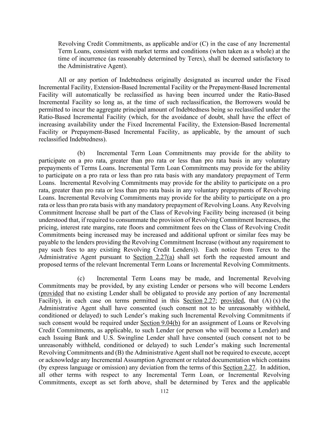 112 Revolving Credit Commitments, as applicable and/or (C) in the case of any Incremental Term Loans, consistent with market terms and conditions (when taken as a whole) at the time of incurrence (as reasonably determined by Terex), shall be deemed satisfactory to the Administrative Agent). All or any portion of Indebtedness originally designated as incurred under the Fixed Incremental Facility, Extension-Based Incremental Facility or the Prepayment-Based Incremental Facility will automatically be reclassified as having been incurred under the Ratio-Based Incremental Facility so long as, at the time of such reclassification, the Borrowers would be permitted to incur the aggregate principal amount of Indebtedness being so reclassified under the Ratio-Based Incremental Facility (which, for the avoidance of doubt, shall have the effect of increasing availability under the Fixed Incremental Facility, the Extension-Based Incremental Facility or Prepayment-Based Incremental Facility, as applicable, by the amount of such reclassified Indebtedness). (b) Incremental Term Loan Commitments may provide for the ability to participate on a pro rata, greater than pro rata or less than pro rata basis in any voluntary prepayments of Terms Loans. Incremental Term Loan Commitments may provide for the ability to participate on a pro rata or less than pro rata basis with any mandatory prepayment of Term Loans. Incremental Revolving Commitments may provide for the ability to participate on a pro rata, greater than pro rata or less than pro rata basis in any voluntary prepayments of Revolving Loans. Incremental Revolving Commitments may provide for the ability to participate on a pro rata or less than pro rata basis with any mandatory prepayment of Revolving Loans. Any Revolving Commitment Increase shall be part of the Class of Revolving Facility being increased (it being understood that, if required to consummate the provision of Revolving Commitment Increases, the pricing, interest rate margins, rate floors and commitment fees on the Class of Revolving Credit Commitments being increased may be increased and additional upfront or similar fees may be payable to the lenders providing the Revolving Commitment Increase (without any requirement to pay such fees to any existing Revolving Credit Lenders)). Each notice from Terex to the Administrative Agent pursuant to Section 2.27(a) shall set forth the requested amount and proposed terms of the relevant Incremental Term Loans or Incremental Revolving Commitments. (c) Incremental Term Loans may be made, and Incremental Revolving Commitments may be provided, by any existing Lender or persons who will become Lenders (provided that no existing Lender shall be obligated to provide any portion of any Incremental Facility), in each case on terms permitted in this Section 2.27; provided, that (A) (x) the Administrative Agent shall have consented (such consent not to be unreasonably withheld, conditioned or delayed) to such Lender’s making such Incremental Revolving Commitments if such consent would be required under Section 9.04(b) for an assignment of Loans or Revolving Credit Commitments, as applicable, to such Lender (or person who will become a Lender) and each Issuing Bank and U.S. Swingline Lender shall have consented (such consent not to be unreasonably withheld, conditioned or delayed) to such Lender’s making such Incremental Revolving Commitments and (B) the Administrative Agent shall not be required to execute, accept or acknowledge any Incremental Assumption Agreement or related documentation which contains (by express language or omission) any deviation from the terms of this Section 2.27. In addition, all other terms with respect to any Incremental Term Loan, or Incremental Revolving Commitments, except as set forth above, shall be determined by Terex and the applicable