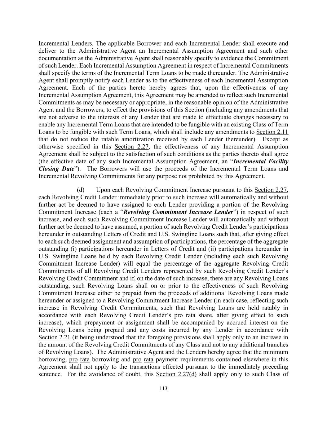 113 Incremental Lenders. The applicable Borrower and each Incremental Lender shall execute and deliver to the Administrative Agent an Incremental Assumption Agreement and such other documentation as the Administrative Agent shall reasonably specify to evidence the Commitment of such Lender. Each Incremental Assumption Agreement in respect of Incremental Commitments shall specify the terms of the Incremental Term Loans to be made thereunder. The Administrative Agent shall promptly notify each Lender as to the effectiveness of each Incremental Assumption Agreement. Each of the parties hereto hereby agrees that, upon the effectiveness of any Incremental Assumption Agreement, this Agreement may be amended to reflect such Incremental Commitments as may be necessary or appropriate, in the reasonable opinion of the Administrative Agent and the Borrowers, to effect the provisions of this Section (including any amendments that are not adverse to the interests of any Lender that are made to effectuate changes necessary to enable any Incremental Term Loans that are intended to be fungible with an existing Class of Term Loans to be fungible with such Term Loans, which shall include any amendments to Section 2.11 that do not reduce the ratable amortization received by each Lender thereunder). Except as otherwise specified in this Section 2.27, the effectiveness of any Incremental Assumption Agreement shall be subject to the satisfaction of such conditions as the parties thereto shall agree (the effective date of any such Incremental Assumption Agreement, an “Incremental Facility Closing Date”). The Borrowers will use the proceeds of the Incremental Term Loans and Incremental Revolving Commitments for any purpose not prohibited by this Agreement. (d) Upon each Revolving Commitment Increase pursuant to this Section 2.27, each Revolving Credit Lender immediately prior to such increase will automatically and without further act be deemed to have assigned to each Lender providing a portion of the Revolving Commitment Increase (each a “Revolving Commitment Increase Lender”) in respect of such increase, and each such Revolving Commitment Increase Lender will automatically and without further act be deemed to have assumed, a portion of such Revolving Credit Lender’s participations hereunder in outstanding Letters of Credit and U.S. Swingline Loans such that, after giving effect to each such deemed assignment and assumption of participations, the percentage of the aggregate outstanding (i) participations hereunder in Letters of Credit and (ii) participations hereunder in U.S. Swingline Loans held by each Revolving Credit Lender (including each such Revolving Commitment Increase Lender) will equal the percentage of the aggregate Revolving Credit Commitments of all Revolving Credit Lenders represented by such Revolving Credit Lender’s Revolving Credit Commitment and if, on the date of such increase, there are any Revolving Loans outstanding, such Revolving Loans shall on or prior to the effectiveness of such Revolving Commitment Increase either be prepaid from the proceeds of additional Revolving Loans made hereunder or assigned to a Revolving Commitment Increase Lender (in each case, reflecting such increase in Revolving Credit Commitments, such that Revolving Loans are held ratably in accordance with each Revolving Credit Lender’s pro rata share, after giving effect to such increase), which prepayment or assignment shall be accompanied by accrued interest on the Revolving Loans being prepaid and any costs incurred by any Lender in accordance with Section 2.21 (it being understood that the foregoing provisions shall apply only to an increase in the amount of the Revolving Credit Commitments of any Class and not to any additional tranches of Revolving Loans). The Administrative Agent and the Lenders hereby agree that the minimum borrowing, pro rata borrowing and pro rata payment requirements contained elsewhere in this Agreement shall not apply to the transactions effected pursuant to the immediately preceding sentence. For the avoidance of doubt, this Section 2.27(d) shall apply only to such Class of