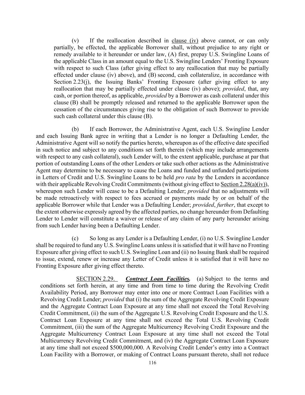 116 (v) If the reallocation described in clause (iv) above cannot, or can only partially, be effected, the applicable Borrower shall, without prejudice to any right or remedy available to it hereunder or under law, (A) first, prepay U.S. Swingline Loans of the applicable Class in an amount equal to the U.S. Swingline Lenders’ Fronting Exposure with respect to such Class (after giving effect to any reallocation that may be partially effected under clause (iv) above), and (B) second, cash collateralize, in accordance with Section 2.23(j), the Issuing Banks’ Fronting Exposure (after giving effect to any reallocation that may be partially effected under clause (iv) above); provided, that, any cash, or portion thereof, as applicable, provided by a Borrower as cash collateral under this clause (B) shall be promptly released and returned to the applicable Borrower upon the cessation of the circumstances giving rise to the obligation of such Borrower to provide such cash collateral under this clause (B). (b) If each Borrower, the Administrative Agent, each U.S. Swingline Lender and each Issuing Bank agree in writing that a Lender is no longer a Defaulting Lender, the Administrative Agent will so notify the parties hereto, whereupon as of the effective date specified in such notice and subject to any conditions set forth therein (which may include arrangements with respect to any cash collateral), such Lender will, to the extent applicable, purchase at par that portion of outstanding Loans of the other Lenders or take such other actions as the Administrative Agent may determine to be necessary to cause the Loans and funded and unfunded participations in Letters of Credit and U.S. Swingline Loans to be held pro rata by the Lenders in accordance with their applicable Revolving Credit Commitments (without giving effect to Section 2.28(a)(iv)), whereupon such Lender will cease to be a Defaulting Lender; provided that no adjustments will be made retroactively with respect to fees accrued or payments made by or on behalf of the applicable Borrower while that Lender was a Defaulting Lender; provided, further, that except to the extent otherwise expressly agreed by the affected parties, no change hereunder from Defaulting Lender to Lender will constitute a waiver or release of any claim of any party hereunder arising from such Lender having been a Defaulting Lender. (c) So long as any Lender is a Defaulting Lender, (i) no U.S. Swingline Lender shall be required to fund any U.S. Swingline Loans unless it is satisfied that it will have no Fronting Exposure after giving effect to such U.S. Swingline Loan and (ii) no Issuing Bank shall be required to issue, extend, renew or increase any Letter of Credit unless it is satisfied that it will have no Fronting Exposure after giving effect thereto. SECTION 2.29. Contract Loan Facilities. (a) Subject to the terms and conditions set forth herein, at any time and from time to time during the Revolving Credit Availability Period, any Borrower may enter into one or more Contract Loan Facilities with a Revolving Credit Lender; provided that (i) the sum of the Aggregate Revolving Credit Exposure and the Aggregate Contract Loan Exposure at any time shall not exceed the Total Revolving Credit Commitment, (ii) the sum of the Aggregate U.S. Revolving Credit Exposure and the U.S. Contract Loan Exposure at any time shall not exceed the Total U.S. Revolving Credit Commitment, (iii) the sum of the Aggregate Multicurrency Revolving Credit Exposure and the Aggregate Multicurrency Contract Loan Exposure at any time shall not exceed the Total Multicurrency Revolving Credit Commitment, and (iv) the Aggregate Contract Loan Exposure at any time shall not exceed $500,000,000. A Revolving Credit Lender’s entry into a Contract Loan Facility with a Borrower, or making of Contract Loans pursuant thereto, shall not reduce