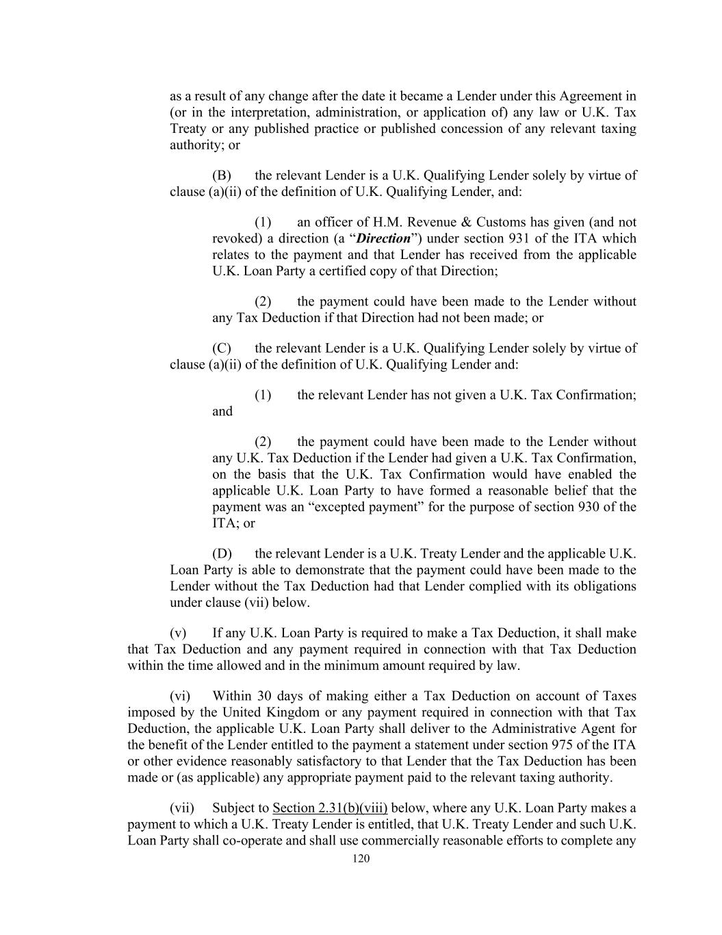 120 as a result of any change after the date it became a Lender under this Agreement in (or in the interpretation, administration, or application of) any law or U.K. Tax Treaty or any published practice or published concession of any relevant taxing authority; or (B) the relevant Lender is a U.K. Qualifying Lender solely by virtue of clause (a)(ii) of the definition of U.K. Qualifying Lender, and: (1) an officer of H.M. Revenue & Customs has given (and not revoked) a direction (a “Direction”) under section 931 of the ITA which relates to the payment and that Lender has received from the applicable U.K. Loan Party a certified copy of that Direction; (2) the payment could have been made to the Lender without any Tax Deduction if that Direction had not been made; or (C) the relevant Lender is a U.K. Qualifying Lender solely by virtue of clause (a)(ii) of the definition of U.K. Qualifying Lender and: (1) the relevant Lender has not given a U.K. Tax Confirmation; and (2) the payment could have been made to the Lender without any U.K. Tax Deduction if the Lender had given a U.K. Tax Confirmation, on the basis that the U.K. Tax Confirmation would have enabled the applicable U.K. Loan Party to have formed a reasonable belief that the payment was an “excepted payment” for the purpose of section 930 of the ITA; or (D) the relevant Lender is a U.K. Treaty Lender and the applicable U.K. Loan Party is able to demonstrate that the payment could have been made to the Lender without the Tax Deduction had that Lender complied with its obligations under clause (vii) below. (v) If any U.K. Loan Party is required to make a Tax Deduction, it shall make that Tax Deduction and any payment required in connection with that Tax Deduction within the time allowed and in the minimum amount required by law. (vi) Within 30 days of making either a Tax Deduction on account of Taxes imposed by the United Kingdom or any payment required in connection with that Tax Deduction, the applicable U.K. Loan Party shall deliver to the Administrative Agent for the benefit of the Lender entitled to the payment a statement under section 975 of the ITA or other evidence reasonably satisfactory to that Lender that the Tax Deduction has been made or (as applicable) any appropriate payment paid to the relevant taxing authority. (vii) Subject to Section 2.31(b)(viii) below, where any U.K. Loan Party makes a payment to which a U.K. Treaty Lender is entitled, that U.K. Treaty Lender and such U.K. Loan Party shall co-operate and shall use commercially reasonable efforts to complete any