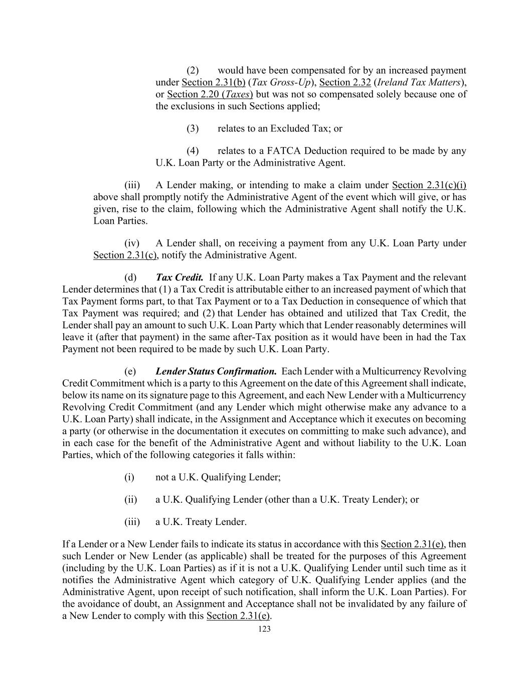 123 (2) would have been compensated for by an increased payment under Section 2.31(b) (Tax Gross-Up), Section 2.32 (Ireland Tax Matters), or Section 2.20 (Taxes) but was not so compensated solely because one of the exclusions in such Sections applied; (3) relates to an Excluded Tax; or (4) relates to a FATCA Deduction required to be made by any U.K. Loan Party or the Administrative Agent. (iii) A Lender making, or intending to make a claim under Section 2.31(c)(i) above shall promptly notify the Administrative Agent of the event which will give, or has given, rise to the claim, following which the Administrative Agent shall notify the U.K. Loan Parties. (iv) A Lender shall, on receiving a payment from any U.K. Loan Party under Section 2.31(c), notify the Administrative Agent. (d) Tax Credit. If any U.K. Loan Party makes a Tax Payment and the relevant Lender determines that (1) a Tax Credit is attributable either to an increased payment of which that Tax Payment forms part, to that Tax Payment or to a Tax Deduction in consequence of which that Tax Payment was required; and (2) that Lender has obtained and utilized that Tax Credit, the Lender shall pay an amount to such U.K. Loan Party which that Lender reasonably determines will leave it (after that payment) in the same after-Tax position as it would have been in had the Tax Payment not been required to be made by such U.K. Loan Party. (e) Lender Status Confirmation. Each Lender with a Multicurrency Revolving Credit Commitment which is a party to this Agreement on the date of this Agreement shall indicate, below its name on its signature page to this Agreement, and each New Lender with a Multicurrency Revolving Credit Commitment (and any Lender which might otherwise make any advance to a U.K. Loan Party) shall indicate, in the Assignment and Acceptance which it executes on becoming a party (or otherwise in the documentation it executes on committing to make such advance), and in each case for the benefit of the Administrative Agent and without liability to the U.K. Loan Parties, which of the following categories it falls within: (i) not a U.K. Qualifying Lender; (ii) a U.K. Qualifying Lender (other than a U.K. Treaty Lender); or (iii) a U.K. Treaty Lender. If a Lender or a New Lender fails to indicate its status in accordance with this Section 2.31(e), then such Lender or New Lender (as applicable) shall be treated for the purposes of this Agreement (including by the U.K. Loan Parties) as if it is not a U.K. Qualifying Lender until such time as it notifies the Administrative Agent which category of U.K. Qualifying Lender applies (and the Administrative Agent, upon receipt of such notification, shall inform the U.K. Loan Parties). For the avoidance of doubt, an Assignment and Acceptance shall not be invalidated by any failure of a New Lender to comply with this Section 2.31(e).