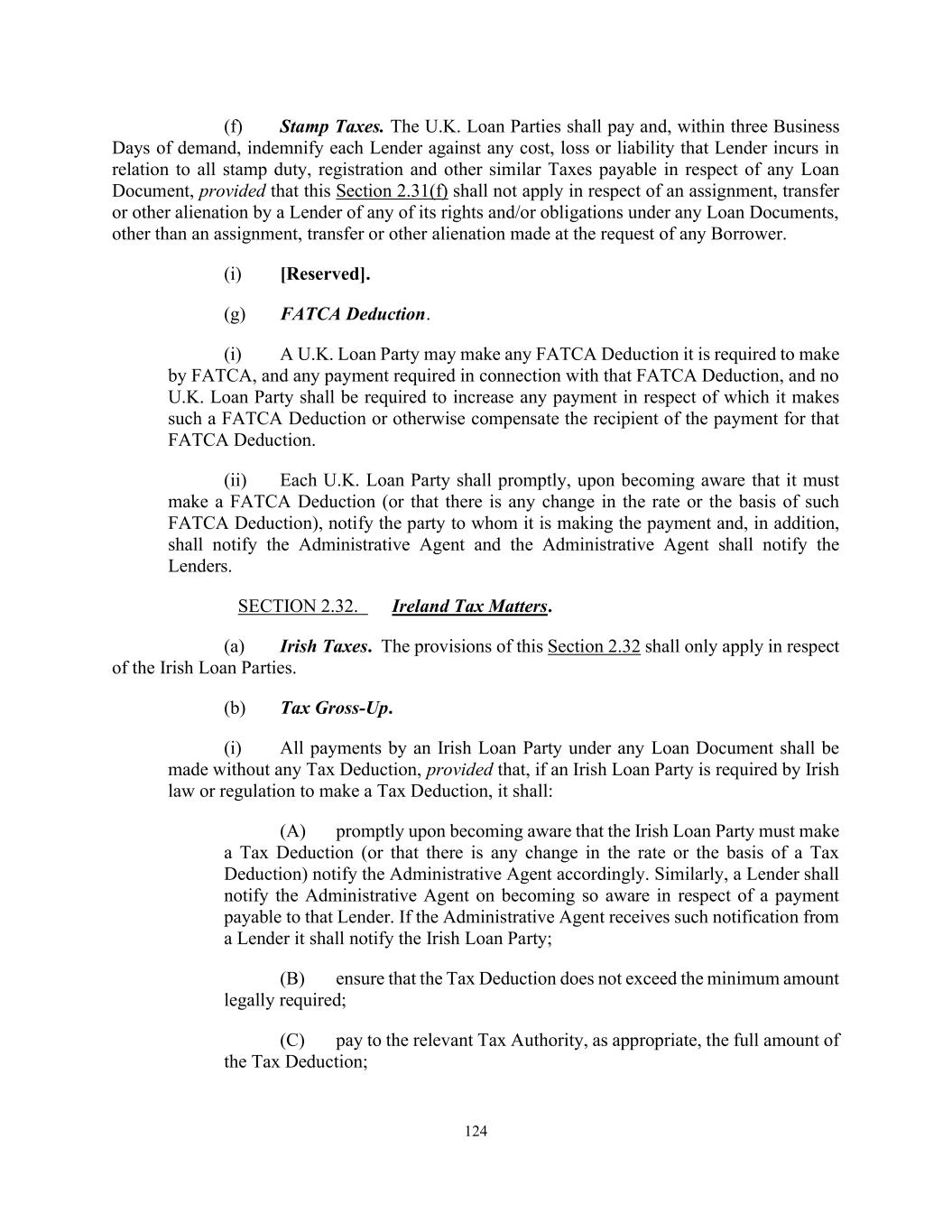124 (f) Stamp Taxes. The U.K. Loan Parties shall pay and, within three Business Days of demand, indemnify each Lender against any cost, loss or liability that Lender incurs in relation to all stamp duty, registration and other similar Taxes payable in respect of any Loan Document, provided that this Section 2.31(f) shall not apply in respect of an assignment, transfer or other alienation by a Lender of any of its rights and/or obligations under any Loan Documents, other than an assignment, transfer or other alienation made at the request of any Borrower. (i) [Reserved]. (g) FATCA Deduction. (i) A U.K. Loan Party may make any FATCA Deduction it is required to make by FATCA, and any payment required in connection with that FATCA Deduction, and no U.K. Loan Party shall be required to increase any payment in respect of which it makes such a FATCA Deduction or otherwise compensate the recipient of the payment for that FATCA Deduction. (ii) Each U.K. Loan Party shall promptly, upon becoming aware that it must make a FATCA Deduction (or that there is any change in the rate or the basis of such FATCA Deduction), notify the party to whom it is making the payment and, in addition, shall notify the Administrative Agent and the Administrative Agent shall notify the Lenders. SECTION 2.32. Ireland Tax Matters. (a) Irish Taxes. The provisions of this Section 2.32 shall only apply in respect of the Irish Loan Parties. (b) Tax Gross-Up. (i) All payments by an Irish Loan Party under any Loan Document shall be made without any Tax Deduction, provided that, if an Irish Loan Party is required by Irish law or regulation to make a Tax Deduction, it shall: (A) promptly upon becoming aware that the Irish Loan Party must make a Tax Deduction (or that there is any change in the rate or the basis of a Tax Deduction) notify the Administrative Agent accordingly. Similarly, a Lender shall notify the Administrative Agent on becoming so aware in respect of a payment payable to that Lender. If the Administrative Agent receives such notification from a Lender it shall notify the Irish Loan Party; (B) ensure that the Tax Deduction does not exceed the minimum amount legally required; (C) pay to the relevant Tax Authority, as appropriate, the full amount of the Tax Deduction;