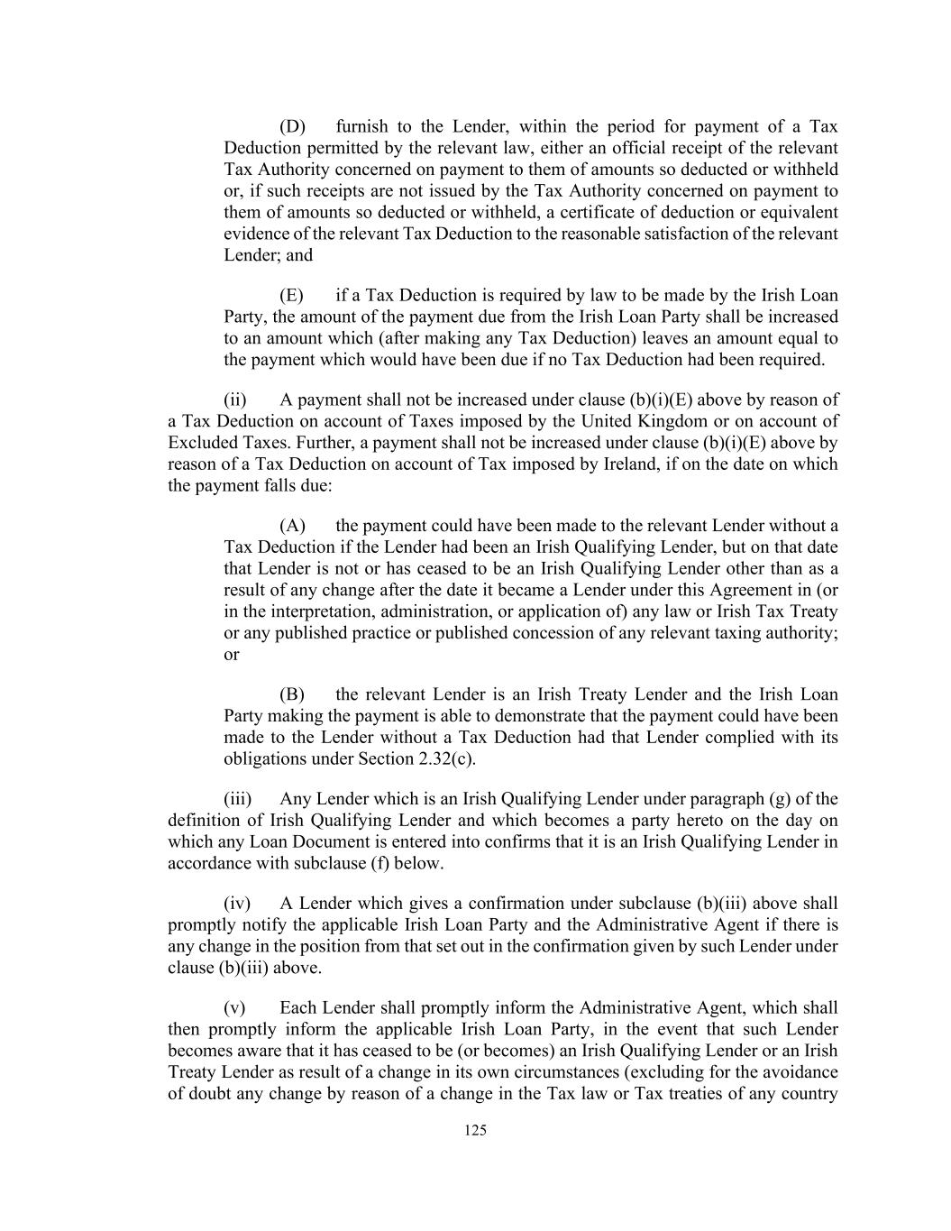 125 (D) furnish to the Lender, within the period for payment of a Tax Deduction permitted by the relevant law, either an official receipt of the relevant Tax Authority concerned on payment to them of amounts so deducted or withheld or, if such receipts are not issued by the Tax Authority concerned on payment to them of amounts so deducted or withheld, a certificate of deduction or equivalent evidence of the relevant Tax Deduction to the reasonable satisfaction of the relevant Lender; and (E) if a Tax Deduction is required by law to be made by the Irish Loan Party, the amount of the payment due from the Irish Loan Party shall be increased to an amount which (after making any Tax Deduction) leaves an amount equal to the payment which would have been due if no Tax Deduction had been required. (ii) A payment shall not be increased under clause (b)(i)(E) above by reason of a Tax Deduction on account of Taxes imposed by the United Kingdom or on account of Excluded Taxes. Further, a payment shall not be increased under clause (b)(i)(E) above by reason of a Tax Deduction on account of Tax imposed by Ireland, if on the date on which the payment falls due: (A) the payment could have been made to the relevant Lender without a Tax Deduction if the Lender had been an Irish Qualifying Lender, but on that date that Lender is not or has ceased to be an Irish Qualifying Lender other than as a result of any change after the date it became a Lender under this Agreement in (or in the interpretation, administration, or application of) any law or Irish Tax Treaty or any published practice or published concession of any relevant taxing authority; or (B) the relevant Lender is an Irish Treaty Lender and the Irish Loan Party making the payment is able to demonstrate that the payment could have been made to the Lender without a Tax Deduction had that Lender complied with its obligations under Section 2.32(c). (iii) Any Lender which is an Irish Qualifying Lender under paragraph (g) of the definition of Irish Qualifying Lender and which becomes a party hereto on the day on which any Loan Document is entered into confirms that it is an Irish Qualifying Lender in accordance with subclause (f) below. (iv) A Lender which gives a confirmation under subclause (b)(iii) above shall promptly notify the applicable Irish Loan Party and the Administrative Agent if there is any change in the position from that set out in the confirmation given by such Lender under clause (b)(iii) above. (v) Each Lender shall promptly inform the Administrative Agent, which shall then promptly inform the applicable Irish Loan Party, in the event that such Lender becomes aware that it has ceased to be (or becomes) an Irish Qualifying Lender or an Irish Treaty Lender as result of a change in its own circumstances (excluding for the avoidance of doubt any change by reason of a change in the Tax law or Tax treaties of any country