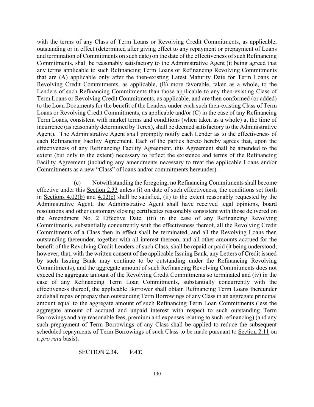 130 with the terms of any Class of Term Loans or Revolving Credit Commitments, as applicable, outstanding or in effect (determined after giving effect to any repayment or prepayment of Loans and termination of Commitments on such date) on the date of the effectiveness of such Refinancing Commitments, shall be reasonably satisfactory to the Administrative Agent (it being agreed that any terms applicable to such Refinancing Term Loans or Refinancing Revolving Commitments that are (A) applicable only after the then-existing Latest Maturity Date for Term Loans or Revolving Credit Commitments, as applicable, (B) more favorable, taken as a whole, to the Lenders of such Refinancing Commitments than those applicable to any then-existing Class of Term Loans or Revolving Credit Commitments, as applicable, and are then conformed (or added) to the Loan Documents for the benefit of the Lenders under each such then-existing Class of Term Loans or Revolving Credit Commitments, as applicable and/or (C) in the case of any Refinancing Term Loans, consistent with market terms and conditions (when taken as a whole) at the time of incurrence (as reasonably determined by Terex), shall be deemed satisfactory to the Administrative Agent). The Administrative Agent shall promptly notify each Lender as to the effectiveness of each Refinancing Facility Agreement. Each of the parties hereto hereby agrees that, upon the effectiveness of any Refinancing Facility Agreement, this Agreement shall be amended to the extent (but only to the extent) necessary to reflect the existence and terms of the Refinancing Facility Agreement (including any amendments necessary to treat the applicable Loans and/or Commitments as a new “Class” of loans and/or commitments hereunder). (c) Notwithstanding the foregoing, no Refinancing Commitments shall become effective under this Section 2.33 unless (i) on date of such effectiveness, the conditions set forth in Sections 4.02(b) and 4.02(c) shall be satisfied, (ii) to the extent reasonably requested by the Administrative Agent, the Administrative Agent shall have received legal opinions, board resolutions and other customary closing certificates reasonably consistent with those delivered on the Amendment No. 2 Effective Date, (iii) in the case of any Refinancing Revolving Commitments, substantially concurrently with the effectiveness thereof, all the Revolving Credit Commitments of a Class then in effect shall be terminated, and all the Revolving Loans then outstanding thereunder, together with all interest thereon, and all other amounts accrued for the benefit of the Revolving Credit Lenders of such Class, shall be repaid or paid (it being understood, however, that, with the written consent of the applicable Issuing Bank, any Letters of Credit issued by such Issuing Bank may continue to be outstanding under the Refinancing Revolving Commitments), and the aggregate amount of such Refinancing Revolving Commitments does not exceed the aggregate amount of the Revolving Credit Commitments so terminated and (iv) in the case of any Refinancing Term Loan Commitments, substantially concurrently with the effectiveness thereof, the applicable Borrower shall obtain Refinancing Term Loans thereunder and shall repay or prepay then outstanding Term Borrowings of any Class in an aggregate principal amount equal to the aggregate amount of such Refinancing Term Loan Commitments (less the aggregate amount of accrued and unpaid interest with respect to such outstanding Term Borrowings and any reasonable fees, premium and expenses relating to such refinancing) (and any such prepayment of Term Borrowings of any Class shall be applied to reduce the subsequent scheduled repayments of Term Borrowings of such Class to be made pursuant to Section 2.11 on a pro rata basis). SECTION 2.34. VAT.