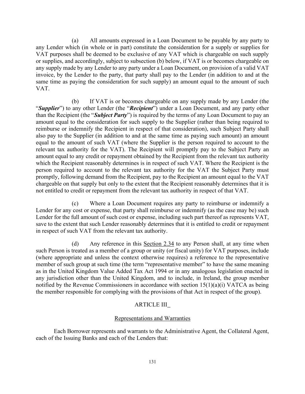 131 (a) All amounts expressed in a Loan Document to be payable by any party to any Lender which (in whole or in part) constitute the consideration for a supply or supplies for VAT purposes shall be deemed to be exclusive of any VAT which is chargeable on such supply or supplies, and accordingly, subject to subsection (b) below, if VAT is or becomes chargeable on any supply made by any Lender to any party under a Loan Document, on provision of a valid VAT invoice, by the Lender to the party, that party shall pay to the Lender (in addition to and at the same time as paying the consideration for such supply) an amount equal to the amount of such VAT. (b) If VAT is or becomes chargeable on any supply made by any Lender (the “Supplier”) to any other Lender (the “Recipient”) under a Loan Document, and any party other than the Recipient (the “Subject Party”) is required by the terms of any Loan Document to pay an amount equal to the consideration for such supply to the Supplier (rather than being required to reimburse or indemnify the Recipient in respect of that consideration), such Subject Party shall also pay to the Supplier (in addition to and at the same time as paying such amount) an amount equal to the amount of such VAT (where the Supplier is the person required to account to the relevant tax authority for the VAT). The Recipient will promptly pay to the Subject Party an amount equal to any credit or repayment obtained by the Recipient from the relevant tax authority which the Recipient reasonably determines is in respect of such VAT. Where the Recipient is the person required to account to the relevant tax authority for the VAT the Subject Party must promptly, following demand from the Recipient, pay to the Recipient an amount equal to the VAT chargeable on that supply but only to the extent that the Recipient reasonably determines that it is not entitled to credit or repayment from the relevant tax authority in respect of that VAT. (c) Where a Loan Document requires any party to reimburse or indemnify a Lender for any cost or expense, that party shall reimburse or indemnify (as the case may be) such Lender for the full amount of such cost or expense, including such part thereof as represents VAT, save to the extent that such Lender reasonably determines that it is entitled to credit or repayment in respect of such VAT from the relevant tax authority. (d) Any reference in this Section 2.34 to any Person shall, at any time when such Person is treated as a member of a group or unity (or fiscal unity) for VAT purposes, include (where appropriate and unless the context otherwise requires) a reference to the representative member of such group at such time (the term “representative member” to have the same meaning as in the United Kingdom Value Added Tax Act 1994 or in any analogous legislation enacted in any jurisdiction other than the United Kingdom, and to include, in Ireland, the group member notified by the Revenue Commissioners in accordance with section 15(1)(a)(i) VATCA as being the member responsible for complying with the provisions of that Act in respect of the group). ARTICLE III Representations and Warranties Each Borrower represents and warrants to the Administrative Agent, the Collateral Agent, each of the Issuing Banks and each of the Lenders that: