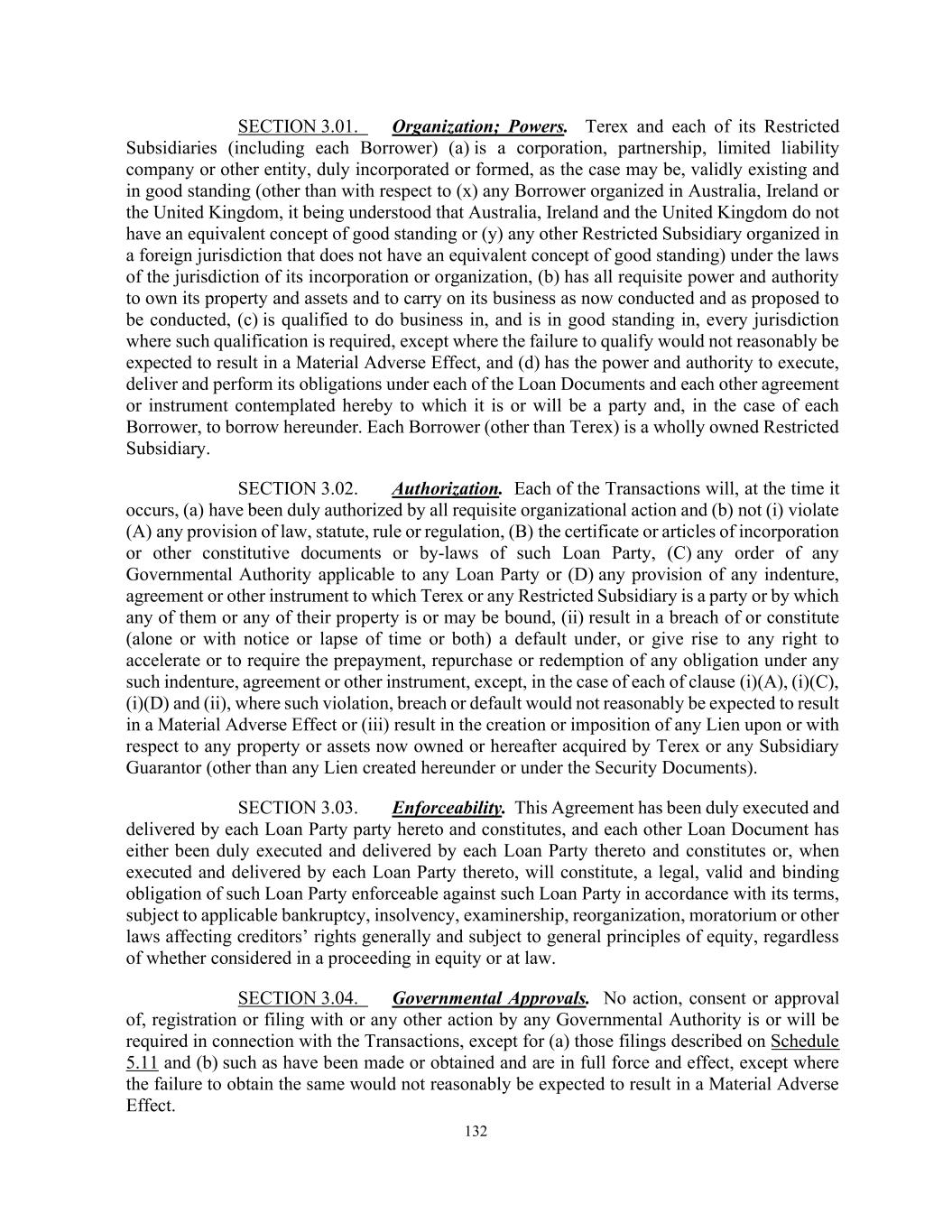 132 SECTION 3.01. Organization; Powers. Terex and each of its Restricted Subsidiaries (including each Borrower) (a) is a corporation, partnership, limited liability company or other entity, duly incorporated or formed, as the case may be, validly existing and in good standing (other than with respect to (x) any Borrower organized in Australia, Ireland or the United Kingdom, it being understood that Australia, Ireland and the United Kingdom do not have an equivalent concept of good standing or (y) any other Restricted Subsidiary organized in a foreign jurisdiction that does not have an equivalent concept of good standing) under the laws of the jurisdiction of its incorporation or organization, (b) has all requisite power and authority to own its property and assets and to carry on its business as now conducted and as proposed to be conducted, (c) is qualified to do business in, and is in good standing in, every jurisdiction where such qualification is required, except where the failure to qualify would not reasonably be expected to result in a Material Adverse Effect, and (d) has the power and authority to execute, deliver and perform its obligations under each of the Loan Documents and each other agreement or instrument contemplated hereby to which it is or will be a party and, in the case of each Borrower, to borrow hereunder. Each Borrower (other than Terex) is a wholly owned Restricted Subsidiary. SECTION 3.02. Authorization. Each of the Transactions will, at the time it occurs, (a) have been duly authorized by all requisite organizational action and (b) not (i) violate (A) any provision of law, statute, rule or regulation, (B) the certificate or articles of incorporation or other constitutive documents or by-laws of such Loan Party, (C) any order of any Governmental Authority applicable to any Loan Party or (D) any provision of any indenture, agreement or other instrument to which Terex or any Restricted Subsidiary is a party or by which any of them or any of their property is or may be bound, (ii) result in a breach of or constitute (alone or with notice or lapse of time or both) a default under, or give rise to any right to accelerate or to require the prepayment, repurchase or redemption of any obligation under any such indenture, agreement or other instrument, except, in the case of each of clause (i)(A), (i)(C), (i)(D) and (ii), where such violation, breach or default would not reasonably be expected to result in a Material Adverse Effect or (iii) result in the creation or imposition of any Lien upon or with respect to any property or assets now owned or hereafter acquired by Terex or any Subsidiary Guarantor (other than any Lien created hereunder or under the Security Documents). SECTION 3.03. Enforceability. This Agreement has been duly executed and delivered by each Loan Party party hereto and constitutes, and each other Loan Document has either been duly executed and delivered by each Loan Party thereto and constitutes or, when executed and delivered by each Loan Party thereto, will constitute, a legal, valid and binding obligation of such Loan Party enforceable against such Loan Party in accordance with its terms, subject to applicable bankruptcy, insolvency, examinership, reorganization, moratorium or other laws affecting creditors’ rights generally and subject to general principles of equity, regardless of whether considered in a proceeding in equity or at law. SECTION 3.04. Governmental Approvals. No action, consent or approval of, registration or filing with or any other action by any Governmental Authority is or will be required in connection with the Transactions, except for (a) those filings described on Schedule 5.11 and (b) such as have been made or obtained and are in full force and effect, except where the failure to obtain the same would not reasonably be expected to result in a Material Adverse Effect.
