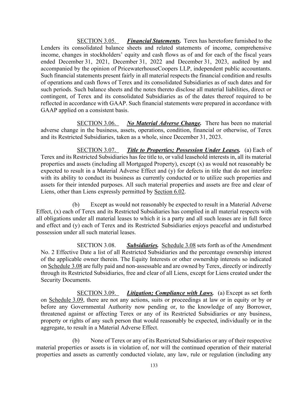 133 SECTION 3.05. Financial Statements. Terex has heretofore furnished to the Lenders its consolidated balance sheets and related statements of income, comprehensive income, changes in stockholders’ equity and cash flows as of and for each of the fiscal years ended December 31, 2021, December 31, 2022 and December 31, 2023, audited by and accompanied by the opinion of PricewaterhouseCoopers LLP, independent public accountants. Such financial statements present fairly in all material respects the financial condition and results of operations and cash flows of Terex and its consolidated Subsidiaries as of such dates and for such periods. Such balance sheets and the notes thereto disclose all material liabilities, direct or contingent, of Terex and its consolidated Subsidiaries as of the dates thereof required to be reflected in accordance with GAAP. Such financial statements were prepared in accordance with GAAP applied on a consistent basis. SECTION 3.06. No Material Adverse Change. There has been no material adverse change in the business, assets, operations, condition, financial or otherwise, of Terex and its Restricted Subsidiaries, taken as a whole, since December 31, 2023. SECTION 3.07. Title to Properties; Possession Under Leases. (a) Each of Terex and its Restricted Subsidiaries has fee title to, or valid leasehold interests in, all its material properties and assets (including all Mortgaged Property), except (x) as would not reasonably be expected to result in a Material Adverse Effect and (y) for defects in title that do not interfere with its ability to conduct its business as currently conducted or to utilize such properties and assets for their intended purposes. All such material properties and assets are free and clear of Liens, other than Liens expressly permitted by Section 6.02. (b) Except as would not reasonably be expected to result in a Material Adverse Effect, (x) each of Terex and its Restricted Subsidiaries has complied in all material respects with all obligations under all material leases to which it is a party and all such leases are in full force and effect and (y) each of Terex and its Restricted Subsidiaries enjoys peaceful and undisturbed possession under all such material leases. SECTION 3.08. Subsidiaries. Schedule 3.08 sets forth as of the Amendment No. 2 Effective Date a list of all Restricted Subsidiaries and the percentage ownership interest of the applicable owner therein. The Equity Interests or other ownership interests so indicated on Schedule 3.08 are fully paid and non-assessable and are owned by Terex, directly or indirectly through its Restricted Subsidiaries, free and clear of all Liens, except for Liens created under the Security Documents. SECTION 3.09. Litigation; Compliance with Laws. (a) Except as set forth on Schedule 3.09, there are not any actions, suits or proceedings at law or in equity or by or before any Governmental Authority now pending or, to the knowledge of any Borrower, threatened against or affecting Terex or any of its Restricted Subsidiaries or any business, property or rights of any such person that would reasonably be expected, individually or in the aggregate, to result in a Material Adverse Effect. (b) None of Terex or any of its Restricted Subsidiaries or any of their respective material properties or assets is in violation of, nor will the continued operation of their material properties and assets as currently conducted violate, any law, rule or regulation (including any