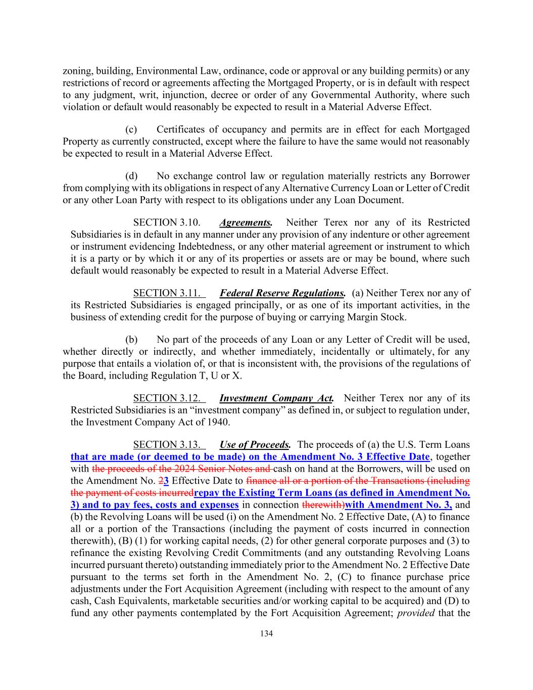 134 zoning, building, Environmental Law, ordinance, code or approval or any building permits) or any restrictions of record or agreements affecting the Mortgaged Property, or is in default with respect to any judgment, writ, injunction, decree or order of any Governmental Authority, where such violation or default would reasonably be expected to result in a Material Adverse Effect. (c) Certificates of occupancy and permits are in effect for each Mortgaged Property as currently constructed, except where the failure to have the same would not reasonably be expected to result in a Material Adverse Effect. (d) No exchange control law or regulation materially restricts any Borrower from complying with its obligations in respect of any Alternative Currency Loan or Letter of Credit or any other Loan Party with respect to its obligations under any Loan Document. SECTION 3.10. Agreements. Neither Terex nor any of its Restricted Subsidiaries is in default in any manner under any provision of any indenture or other agreement or instrument evidencing Indebtedness, or any other material agreement or instrument to which it is a party or by which it or any of its properties or assets are or may be bound, where such default would reasonably be expected to result in a Material Adverse Effect. SECTION 3.11. Federal Reserve Regulations. (a) Neither Terex nor any of its Restricted Subsidiaries is engaged principally, or as one of its important activities, in the business of extending credit for the purpose of buying or carrying Margin Stock. (b) No part of the proceeds of any Loan or any Letter of Credit will be used, whether directly or indirectly, and whether immediately, incidentally or ultimately, for any purpose that entails a violation of, or that is inconsistent with, the provisions of the regulations of the Board, including Regulation T, U or X. SECTION 3.12. Investment Company Act. Neither Terex nor any of its Restricted Subsidiaries is an “investment company” as defined in, or subject to regulation under, the Investment Company Act of 1940. SECTION 3.13. Use of Proceeds. The proceeds of (a) the U.S. Term Loans that are made (or deemed to be made) on the Amendment No. 3 Effective Date, together with the proceeds of the 2024 Senior Notes and cash on hand at the Borrowers, will be used on the Amendment No. 23 Effective Date to finance all or a portion of the Transactions (including the payment of costs incurredrepay the Existing Term Loans (as defined in Amendment No. 3) and to pay fees, costs and expenses in connection therewith)with Amendment No. 3, and (b) the Revolving Loans will be used (i) on the Amendment No. 2 Effective Date, (A) to finance all or a portion of the Transactions (including the payment of costs incurred in connection therewith), (B) (1) for working capital needs, (2) for other general corporate purposes and (3) to refinance the existing Revolving Credit Commitments (and any outstanding Revolving Loans incurred pursuant thereto) outstanding immediately prior to the Amendment No. 2 Effective Date pursuant to the terms set forth in the Amendment No. 2, (C) to finance purchase price adjustments under the Fort Acquisition Agreement (including with respect to the amount of any cash, Cash Equivalents, marketable securities and/or working capital to be acquired) and (D) to fund any other payments contemplated by the Fort Acquisition Agreement; provided that the