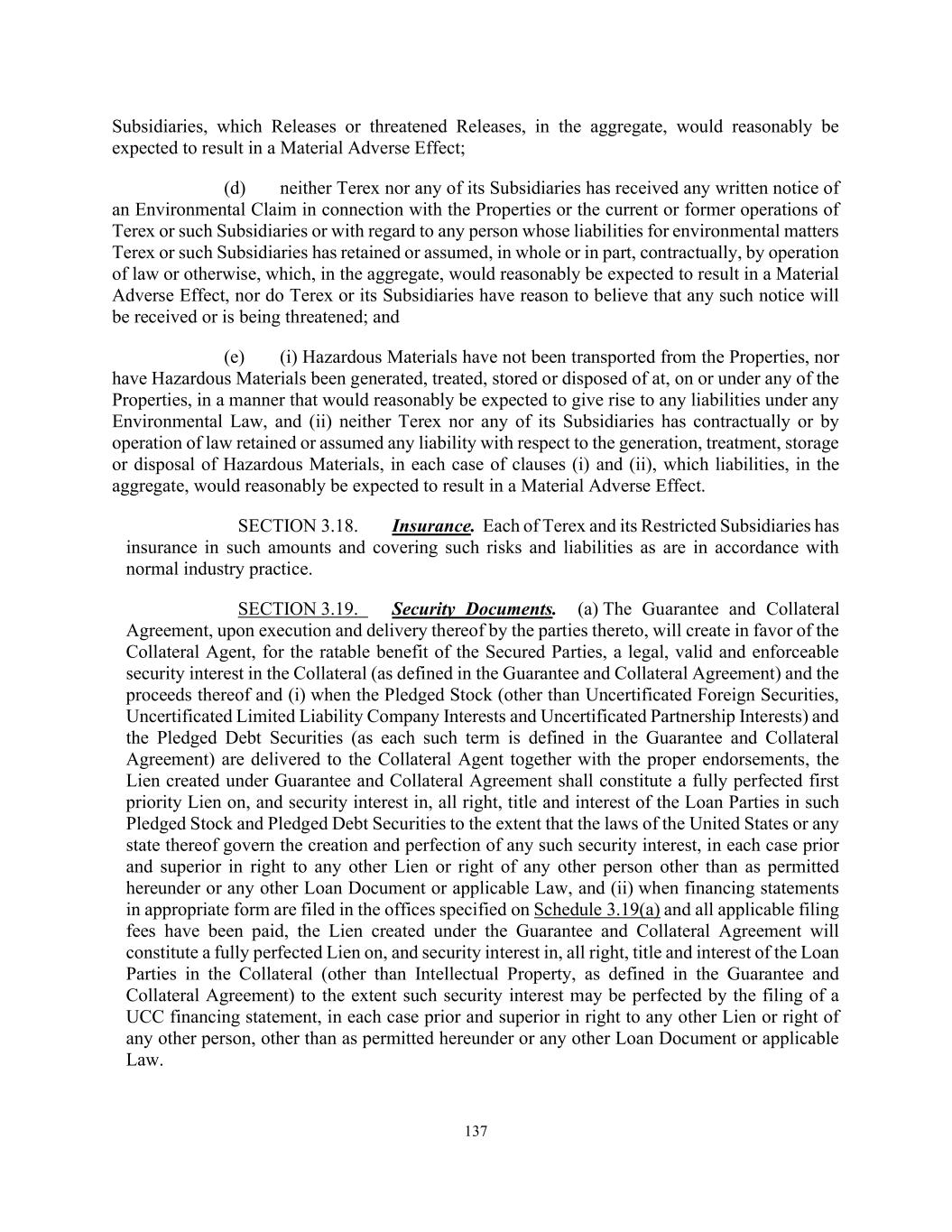 137 Subsidiaries, which Releases or threatened Releases, in the aggregate, would reasonably be expected to result in a Material Adverse Effect; (d) neither Terex nor any of its Subsidiaries has received any written notice of an Environmental Claim in connection with the Properties or the current or former operations of Terex or such Subsidiaries or with regard to any person whose liabilities for environmental matters Terex or such Subsidiaries has retained or assumed, in whole or in part, contractually, by operation of law or otherwise, which, in the aggregate, would reasonably be expected to result in a Material Adverse Effect, nor do Terex or its Subsidiaries have reason to believe that any such notice will be received or is being threatened; and (e) (i) Hazardous Materials have not been transported from the Properties, nor have Hazardous Materials been generated, treated, stored or disposed of at, on or under any of the Properties, in a manner that would reasonably be expected to give rise to any liabilities under any Environmental Law, and (ii) neither Terex nor any of its Subsidiaries has contractually or by operation of law retained or assumed any liability with respect to the generation, treatment, storage or disposal of Hazardous Materials, in each case of clauses (i) and (ii), which liabilities, in the aggregate, would reasonably be expected to result in a Material Adverse Effect. SECTION 3.18. Insurance. Each of Terex and its Restricted Subsidiaries has insurance in such amounts and covering such risks and liabilities as are in accordance with normal industry practice. SECTION 3.19. Security Documents. (a) The Guarantee and Collateral Agreement, upon execution and delivery thereof by the parties thereto, will create in favor of the Collateral Agent, for the ratable benefit of the Secured Parties, a legal, valid and enforceable security interest in the Collateral (as defined in the Guarantee and Collateral Agreement) and the proceeds thereof and (i) when the Pledged Stock (other than Uncertificated Foreign Securities, Uncertificated Limited Liability Company Interests and Uncertificated Partnership Interests) and the Pledged Debt Securities (as each such term is defined in the Guarantee and Collateral Agreement) are delivered to the Collateral Agent together with the proper endorsements, the Lien created under Guarantee and Collateral Agreement shall constitute a fully perfected first priority Lien on, and security interest in, all right, title and interest of the Loan Parties in such Pledged Stock and Pledged Debt Securities to the extent that the laws of the United States or any state thereof govern the creation and perfection of any such security interest, in each case prior and superior in right to any other Lien or right of any other person other than as permitted hereunder or any other Loan Document or applicable Law, and (ii) when financing statements in appropriate form are filed in the offices specified on Schedule 3.19(a) and all applicable filing fees have been paid, the Lien created under the Guarantee and Collateral Agreement will constitute a fully perfected Lien on, and security interest in, all right, title and interest of the Loan Parties in the Collateral (other than Intellectual Property, as defined in the Guarantee and Collateral Agreement) to the extent such security interest may be perfected by the filing of a UCC financing statement, in each case prior and superior in right to any other Lien or right of any other person, other than as permitted hereunder or any other Loan Document or applicable Law.