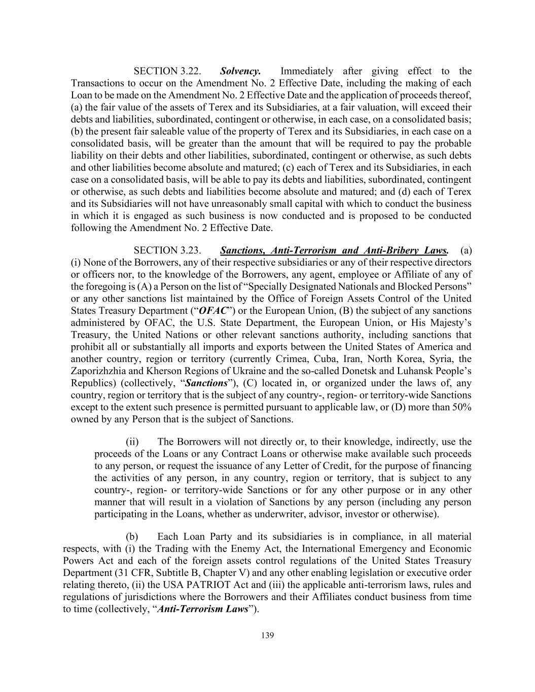 139 SECTION 3.22. Solvency. Immediately after giving effect to the Transactions to occur on the Amendment No. 2 Effective Date, including the making of each Loan to be made on the Amendment No. 2 Effective Date and the application of proceeds thereof, (a) the fair value of the assets of Terex and its Subsidiaries, at a fair valuation, will exceed their debts and liabilities, subordinated, contingent or otherwise, in each case, on a consolidated basis; (b) the present fair saleable value of the property of Terex and its Subsidiaries, in each case on a consolidated basis, will be greater than the amount that will be required to pay the probable liability on their debts and other liabilities, subordinated, contingent or otherwise, as such debts and other liabilities become absolute and matured; (c) each of Terex and its Subsidiaries, in each case on a consolidated basis, will be able to pay its debts and liabilities, subordinated, contingent or otherwise, as such debts and liabilities become absolute and matured; and (d) each of Terex and its Subsidiaries will not have unreasonably small capital with which to conduct the business in which it is engaged as such business is now conducted and is proposed to be conducted following the Amendment No. 2 Effective Date. SECTION 3.23. Sanctions, Anti-Terrorism and Anti-Bribery Laws. (a) (i) None of the Borrowers, any of their respective subsidiaries or any of their respective directors or officers nor, to the knowledge of the Borrowers, any agent, employee or Affiliate of any of the foregoing is (A) a Person on the list of “Specially Designated Nationals and Blocked Persons” or any other sanctions list maintained by the Office of Foreign Assets Control of the United States Treasury Department (“OFAC”) or the European Union, (B) the subject of any sanctions administered by OFAC, the U.S. State Department, the European Union, or His Majesty’s Treasury, the United Nations or other relevant sanctions authority, including sanctions that prohibit all or substantially all imports and exports between the United States of America and another country, region or territory (currently Crimea, Cuba, Iran, North Korea, Syria, the Zaporizhzhia and Kherson Regions of Ukraine and the so-called Donetsk and Luhansk People’s Republics) (collectively, “Sanctions”), (C) located in, or organized under the laws of, any country, region or territory that is the subject of any country-, region- or territory-wide Sanctions except to the extent such presence is permitted pursuant to applicable law, or (D) more than 50% owned by any Person that is the subject of Sanctions. (ii) The Borrowers will not directly or, to their knowledge, indirectly, use the proceeds of the Loans or any Contract Loans or otherwise make available such proceeds to any person, or request the issuance of any Letter of Credit, for the purpose of financing the activities of any person, in any country, region or territory, that is subject to any country-, region- or territory-wide Sanctions or for any other purpose or in any other manner that will result in a violation of Sanctions by any person (including any person participating in the Loans, whether as underwriter, advisor, investor or otherwise). (b) Each Loan Party and its subsidiaries is in compliance, in all material respects, with (i) the Trading with the Enemy Act, the International Emergency and Economic Powers Act and each of the foreign assets control regulations of the United States Treasury Department (31 CFR, Subtitle B, Chapter V) and any other enabling legislation or executive order relating thereto, (ii) the USA PATRIOT Act and (iii) the applicable anti-terrorism laws, rules and regulations of jurisdictions where the Borrowers and their Affiliates conduct business from time to time (collectively, “Anti-Terrorism Laws”).