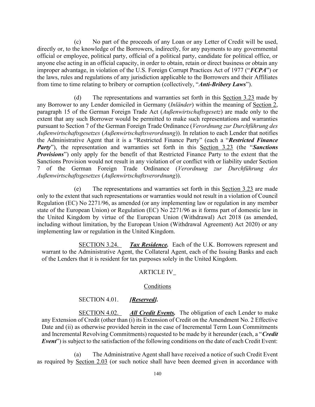 140 (c) No part of the proceeds of any Loan or any Letter of Credit will be used, directly or, to the knowledge of the Borrowers, indirectly, for any payments to any governmental official or employee, political party, official of a political party, candidate for political office, or anyone else acting in an official capacity, in order to obtain, retain or direct business or obtain any improper advantage, in violation of the U.S. Foreign Corrupt Practices Act of 1977 (“FCPA”) or the laws, rules and regulations of any jurisdiction applicable to the Borrowers and their Affiliates from time to time relating to bribery or corruption (collectively, “Anti-Bribery Laws”). (d) The representations and warranties set forth in this Section 3.23 made by any Borrower to any Lender domiciled in Germany (Inländer) within the meaning of Section 2, paragraph 15 of the German Foreign Trade Act (Außenwirtschaftsgesetz) are made only to the extent that any such Borrower would be permitted to make such representations and warranties pursuant to Section 7 of the German Foreign Trade Ordinance (Verordnung zur Durchführung des Außenwirtschaftsgesetzes (Außenwirtschaftsverordnung)). In relation to each Lender that notifies the Administrative Agent that it is a “Restricted Finance Party” (each a “Restricted Finance Party”), the representation and warranties set forth in this Section 3.23 (the “Sanctions Provisions”) only apply for the benefit of that Restricted Finance Party to the extent that the Sanctions Provision would not result in any violation of or conflict with or liability under Section 7 of the German Foreign Trade Ordinance (Verordnung zur Durchführung des Außenwirtschaftsgesetzes (Außenwirtschaftsverordnung)). (e) The representations and warranties set forth in this Section 3.23 are made only to the extent that such representations or warranties would not result in a violation of Council Regulation (EC) No 2271/96, as amended (or any implementing law or regulation in any member state of the European Union) or Regulation (EC) No 2271/96 as it forms part of domestic law in the United Kingdom by virtue of the European Union (Withdrawal) Act 2018 (as amended, including without limitation, by the European Union (Withdrawal Agreement) Act 2020) or any implementing law or regulation in the United Kingdom. SECTION 3.24. Tax Residence. Each of the U.K. Borrowers represent and warrant to the Administrative Agent, the Collateral Agent, each of the Issuing Banks and each of the Lenders that it is resident for tax purposes solely in the United Kingdom. ARTICLE IV Conditions SECTION 4.01. [Reserved]. SECTION 4.02. All Credit Events. The obligation of each Lender to make any Extension of Credit (other than (i) its Extension of Credit on the Amendment No. 2 Effective Date and (ii) as otherwise provided herein in the case of Incremental Term Loan Commitments and Incremental Revolving Commitments) requested to be made by it hereunder (each, a “Credit Event”) is subject to the satisfaction of the following conditions on the date of each Credit Event: (a) The Administrative Agent shall have received a notice of such Credit Event as required by Section 2.03 (or such notice shall have been deemed given in accordance with