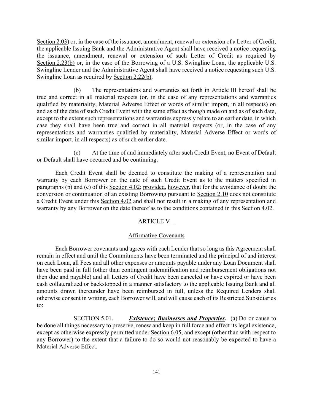 141 Section 2.03) or, in the case of the issuance, amendment, renewal or extension of a Letter of Credit, the applicable Issuing Bank and the Administrative Agent shall have received a notice requesting the issuance, amendment, renewal or extension of such Letter of Credit as required by Section 2.23(b) or, in the case of the Borrowing of a U.S. Swingline Loan, the applicable U.S. Swingline Lender and the Administrative Agent shall have received a notice requesting such U.S. Swingline Loan as required by Section 2.22(b). (b) The representations and warranties set forth in Article III hereof shall be true and correct in all material respects (or, in the case of any representations and warranties qualified by materiality, Material Adverse Effect or words of similar import, in all respects) on and as of the date of such Credit Event with the same effect as though made on and as of such date, except to the extent such representations and warranties expressly relate to an earlier date, in which case they shall have been true and correct in all material respects (or, in the case of any representations and warranties qualified by materiality, Material Adverse Effect or words of similar import, in all respects) as of such earlier date. (c) At the time of and immediately after such Credit Event, no Event of Default or Default shall have occurred and be continuing. Each Credit Event shall be deemed to constitute the making of a representation and warranty by each Borrower on the date of such Credit Event as to the matters specified in paragraphs (b) and (c) of this Section 4.02; provided, however, that for the avoidance of doubt the conversion or continuation of an existing Borrowing pursuant to Section 2.10 does not constitute a Credit Event under this Section 4.02 and shall not result in a making of any representation and warranty by any Borrower on the date thereof as to the conditions contained in this Section 4.02. ARTICLE V Affirmative Covenants Each Borrower covenants and agrees with each Lender that so long as this Agreement shall remain in effect and until the Commitments have been terminated and the principal of and interest on each Loan, all Fees and all other expenses or amounts payable under any Loan Document shall have been paid in full (other than contingent indemnification and reimbursement obligations not then due and payable) and all Letters of Credit have been canceled or have expired or have been cash collateralized or backstopped in a manner satisfactory to the applicable Issuing Bank and all amounts drawn thereunder have been reimbursed in full, unless the Required Lenders shall otherwise consent in writing, each Borrower will, and will cause each of its Restricted Subsidiaries to: SECTION 5.01. Existence; Businesses and Properties. (a) Do or cause to be done all things necessary to preserve, renew and keep in full force and effect its legal existence, except as otherwise expressly permitted under Section 6.05, and except (other than with respect to any Borrower) to the extent that a failure to do so would not reasonably be expected to have a Material Adverse Effect.