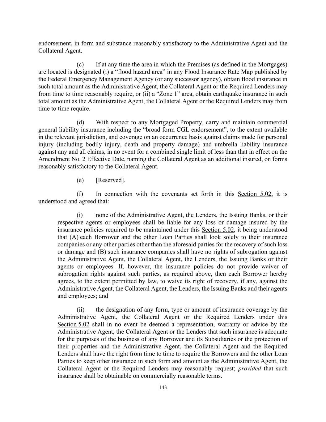 143 endorsement, in form and substance reasonably satisfactory to the Administrative Agent and the Collateral Agent. (c) If at any time the area in which the Premises (as defined in the Mortgages) are located is designated (i) a “flood hazard area” in any Flood Insurance Rate Map published by the Federal Emergency Management Agency (or any successor agency), obtain flood insurance in such total amount as the Administrative Agent, the Collateral Agent or the Required Lenders may from time to time reasonably require, or (ii) a “Zone 1” area, obtain earthquake insurance in such total amount as the Administrative Agent, the Collateral Agent or the Required Lenders may from time to time require. (d) With respect to any Mortgaged Property, carry and maintain commercial general liability insurance including the “broad form CGL endorsement”, to the extent available in the relevant jurisdiction, and coverage on an occurrence basis against claims made for personal injury (including bodily injury, death and property damage) and umbrella liability insurance against any and all claims, in no event for a combined single limit of less than that in effect on the Amendment No. 2 Effective Date, naming the Collateral Agent as an additional insured, on forms reasonably satisfactory to the Collateral Agent. (e) [Reserved]. (f) In connection with the covenants set forth in this Section 5.02, it is understood and agreed that: (i) none of the Administrative Agent, the Lenders, the Issuing Banks, or their respective agents or employees shall be liable for any loss or damage insured by the insurance policies required to be maintained under this Section 5.02, it being understood that (A) each Borrower and the other Loan Parties shall look solely to their insurance companies or any other parties other than the aforesaid parties for the recovery of such loss or damage and (B) such insurance companies shall have no rights of subrogation against the Administrative Agent, the Collateral Agent, the Lenders, the Issuing Banks or their agents or employees. If, however, the insurance policies do not provide waiver of subrogation rights against such parties, as required above, then each Borrower hereby agrees, to the extent permitted by law, to waive its right of recovery, if any, against the Administrative Agent, the Collateral Agent, the Lenders, the Issuing Banks and their agents and employees; and (ii) the designation of any form, type or amount of insurance coverage by the Administrative Agent, the Collateral Agent or the Required Lenders under this Section 5.02 shall in no event be deemed a representation, warranty or advice by the Administrative Agent, the Collateral Agent or the Lenders that such insurance is adequate for the purposes of the business of any Borrower and its Subsidiaries or the protection of their properties and the Administrative Agent, the Collateral Agent and the Required Lenders shall have the right from time to time to require the Borrowers and the other Loan Parties to keep other insurance in such form and amount as the Administrative Agent, the Collateral Agent or the Required Lenders may reasonably request; provided that such insurance shall be obtainable on commercially reasonable terms.