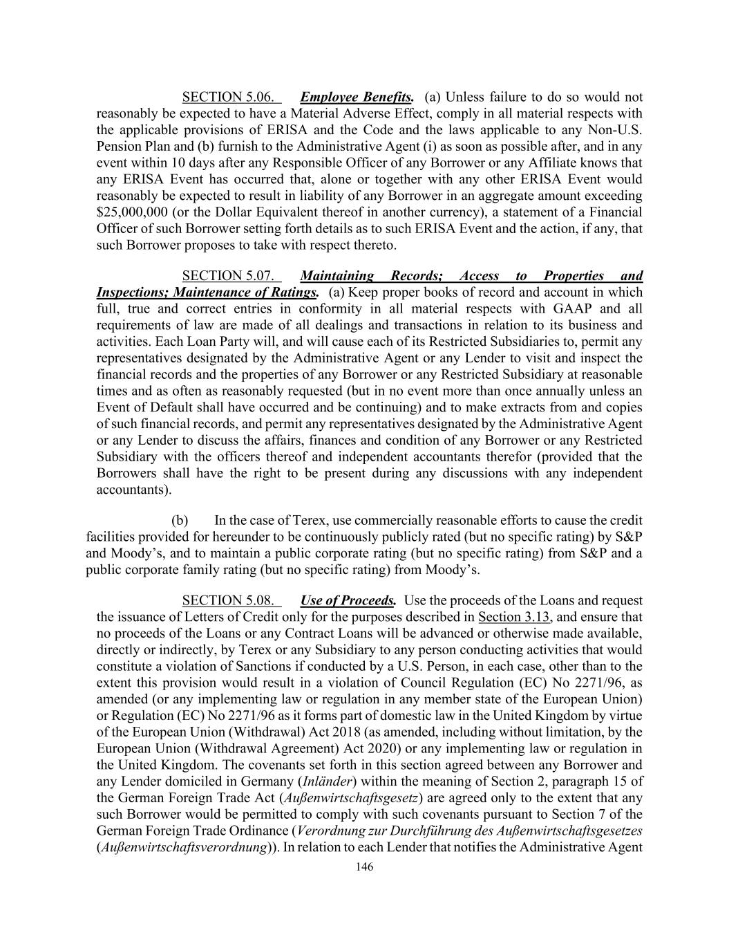 146 SECTION 5.06. Employee Benefits. (a) Unless failure to do so would not reasonably be expected to have a Material Adverse Effect, comply in all material respects with the applicable provisions of ERISA and the Code and the laws applicable to any Non-U.S. Pension Plan and (b) furnish to the Administrative Agent (i) as soon as possible after, and in any event within 10 days after any Responsible Officer of any Borrower or any Affiliate knows that any ERISA Event has occurred that, alone or together with any other ERISA Event would reasonably be expected to result in liability of any Borrower in an aggregate amount exceeding $25,000,000 (or the Dollar Equivalent thereof in another currency), a statement of a Financial Officer of such Borrower setting forth details as to such ERISA Event and the action, if any, that such Borrower proposes to take with respect thereto. SECTION 5.07. Maintaining Records; Access to Properties and Inspections; Maintenance of Ratings. (a) Keep proper books of record and account in which full, true and correct entries in conformity in all material respects with GAAP and all requirements of law are made of all dealings and transactions in relation to its business and activities. Each Loan Party will, and will cause each of its Restricted Subsidiaries to, permit any representatives designated by the Administrative Agent or any Lender to visit and inspect the financial records and the properties of any Borrower or any Restricted Subsidiary at reasonable times and as often as reasonably requested (but in no event more than once annually unless an Event of Default shall have occurred and be continuing) and to make extracts from and copies of such financial records, and permit any representatives designated by the Administrative Agent or any Lender to discuss the affairs, finances and condition of any Borrower or any Restricted Subsidiary with the officers thereof and independent accountants therefor (provided that the Borrowers shall have the right to be present during any discussions with any independent accountants). (b) In the case of Terex, use commercially reasonable efforts to cause the credit facilities provided for hereunder to be continuously publicly rated (but no specific rating) by S&P and Moody’s, and to maintain a public corporate rating (but no specific rating) from S&P and a public corporate family rating (but no specific rating) from Moody’s. SECTION 5.08. Use of Proceeds. Use the proceeds of the Loans and request the issuance of Letters of Credit only for the purposes described in Section 3.13, and ensure that no proceeds of the Loans or any Contract Loans will be advanced or otherwise made available, directly or indirectly, by Terex or any Subsidiary to any person conducting activities that would constitute a violation of Sanctions if conducted by a U.S. Person, in each case, other than to the extent this provision would result in a violation of Council Regulation (EC) No 2271/96, as amended (or any implementing law or regulation in any member state of the European Union) or Regulation (EC) No 2271/96 as it forms part of domestic law in the United Kingdom by virtue of the European Union (Withdrawal) Act 2018 (as amended, including without limitation, by the European Union (Withdrawal Agreement) Act 2020) or any implementing law or regulation in the United Kingdom. The covenants set forth in this section agreed between any Borrower and any Lender domiciled in Germany (Inländer) within the meaning of Section 2, paragraph 15 of the German Foreign Trade Act (Außenwirtschaftsgesetz) are agreed only to the extent that any such Borrower would be permitted to comply with such covenants pursuant to Section 7 of the German Foreign Trade Ordinance (Verordnung zur Durchführung des Außenwirtschaftsgesetzes (Außenwirtschaftsverordnung)). In relation to each Lender that notifies the Administrative Agent