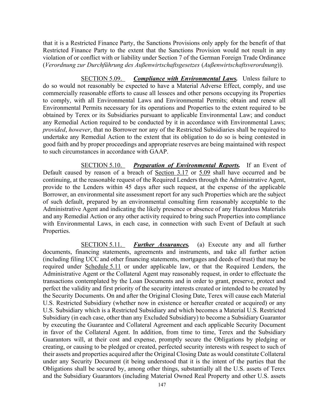 147 that it is a Restricted Finance Party, the Sanctions Provisions only apply for the benefit of that Restricted Finance Party to the extent that the Sanctions Provision would not result in any violation of or conflict with or liability under Section 7 of the German Foreign Trade Ordinance (Verordnung zur Durchführung des Außenwirtschaftsgesetzes (Außenwirtschaftsverordnung)). SECTION 5.09. Compliance with Environmental Laws. Unless failure to do so would not reasonably be expected to have a Material Adverse Effect, comply, and use commercially reasonable efforts to cause all lessees and other persons occupying its Properties to comply, with all Environmental Laws and Environmental Permits; obtain and renew all Environmental Permits necessary for its operations and Properties to the extent required to be obtained by Terex or its Subsidiaries pursuant to applicable Environmental Law; and conduct any Remedial Action required to be conducted by it in accordance with Environmental Laws; provided, however, that no Borrower nor any of the Restricted Subsidiaries shall be required to undertake any Remedial Action to the extent that its obligation to do so is being contested in good faith and by proper proceedings and appropriate reserves are being maintained with respect to such circumstances in accordance with GAAP. SECTION 5.10. Preparation of Environmental Reports. If an Event of Default caused by reason of a breach of Section 3.17 or 5.09 shall have occurred and be continuing, at the reasonable request of the Required Lenders through the Administrative Agent, provide to the Lenders within 45 days after such request, at the expense of the applicable Borrower, an environmental site assessment report for any such Properties which are the subject of such default, prepared by an environmental consulting firm reasonably acceptable to the Administrative Agent and indicating the likely presence or absence of any Hazardous Materials and any Remedial Action or any other activity required to bring such Properties into compliance with Environmental Laws, in each case, in connection with such Event of Default at such Properties. SECTION 5.11. Further Assurances. (a) Execute any and all further documents, financing statements, agreements and instruments, and take all further action (including filing UCC and other financing statements, mortgages and deeds of trust) that may be required under Schedule 5.11 or under applicable law, or that the Required Lenders, the Administrative Agent or the Collateral Agent may reasonably request, in order to effectuate the transactions contemplated by the Loan Documents and in order to grant, preserve, protect and perfect the validity and first priority of the security interests created or intended to be created by the Security Documents. On and after the Original Closing Date, Terex will cause each Material U.S. Restricted Subsidiary (whether now in existence or hereafter created or acquired) or any U.S. Subsidiary which is a Restricted Subsidiary and which becomes a Material U.S. Restricted Subsidiary (in each case, other than any Excluded Subsidiary) to become a Subsidiary Guarantor by executing the Guarantee and Collateral Agreement and each applicable Security Document in favor of the Collateral Agent. In addition, from time to time, Terex and the Subsidiary Guarantors will, at their cost and expense, promptly secure the Obligations by pledging or creating, or causing to be pledged or created, perfected security interests with respect to such of their assets and properties acquired after the Original Closing Date as would constitute Collateral under any Security Document (it being understood that it is the intent of the parties that the Obligations shall be secured by, among other things, substantially all the U.S. assets of Terex and the Subsidiary Guarantors (including Material Owned Real Property and other U.S. assets