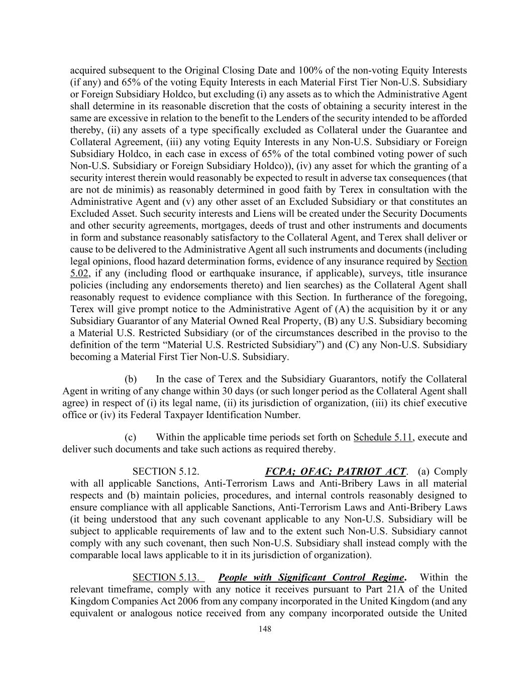 148 acquired subsequent to the Original Closing Date and 100% of the non-voting Equity Interests (if any) and 65% of the voting Equity Interests in each Material First Tier Non-U.S. Subsidiary or Foreign Subsidiary Holdco, but excluding (i) any assets as to which the Administrative Agent shall determine in its reasonable discretion that the costs of obtaining a security interest in the same are excessive in relation to the benefit to the Lenders of the security intended to be afforded thereby, (ii) any assets of a type specifically excluded as Collateral under the Guarantee and Collateral Agreement, (iii) any voting Equity Interests in any Non-U.S. Subsidiary or Foreign Subsidiary Holdco, in each case in excess of 65% of the total combined voting power of such Non-U.S. Subsidiary or Foreign Subsidiary Holdco)), (iv) any asset for which the granting of a security interest therein would reasonably be expected to result in adverse tax consequences (that are not de minimis) as reasonably determined in good faith by Terex in consultation with the Administrative Agent and (v) any other asset of an Excluded Subsidiary or that constitutes an Excluded Asset. Such security interests and Liens will be created under the Security Documents and other security agreements, mortgages, deeds of trust and other instruments and documents in form and substance reasonably satisfactory to the Collateral Agent, and Terex shall deliver or cause to be delivered to the Administrative Agent all such instruments and documents (including legal opinions, flood hazard determination forms, evidence of any insurance required by Section 5.02, if any (including flood or earthquake insurance, if applicable), surveys, title insurance policies (including any endorsements thereto) and lien searches) as the Collateral Agent shall reasonably request to evidence compliance with this Section. In furtherance of the foregoing, Terex will give prompt notice to the Administrative Agent of (A) the acquisition by it or any Subsidiary Guarantor of any Material Owned Real Property, (B) any U.S. Subsidiary becoming a Material U.S. Restricted Subsidiary (or of the circumstances described in the proviso to the definition of the term “Material U.S. Restricted Subsidiary”) and (C) any Non-U.S. Subsidiary becoming a Material First Tier Non-U.S. Subsidiary. (b) In the case of Terex and the Subsidiary Guarantors, notify the Collateral Agent in writing of any change within 30 days (or such longer period as the Collateral Agent shall agree) in respect of (i) its legal name, (ii) its jurisdiction of organization, (iii) its chief executive office or (iv) its Federal Taxpayer Identification Number. (c) Within the applicable time periods set forth on Schedule 5.11, execute and deliver such documents and take such actions as required thereby. SECTION 5.12. FCPA; OFAC; PATRIOT ACT. (a) Comply with all applicable Sanctions, Anti-Terrorism Laws and Anti-Bribery Laws in all material respects and (b) maintain policies, procedures, and internal controls reasonably designed to ensure compliance with all applicable Sanctions, Anti-Terrorism Laws and Anti-Bribery Laws (it being understood that any such covenant applicable to any Non-U.S. Subsidiary will be subject to applicable requirements of law and to the extent such Non-U.S. Subsidiary cannot comply with any such covenant, then such Non-U.S. Subsidiary shall instead comply with the comparable local laws applicable to it in its jurisdiction of organization). SECTION 5.13. People with Significant Control Regime. Within the relevant timeframe, comply with any notice it receives pursuant to Part 21A of the United Kingdom Companies Act 2006 from any company incorporated in the United Kingdom (and any equivalent or analogous notice received from any company incorporated outside the United