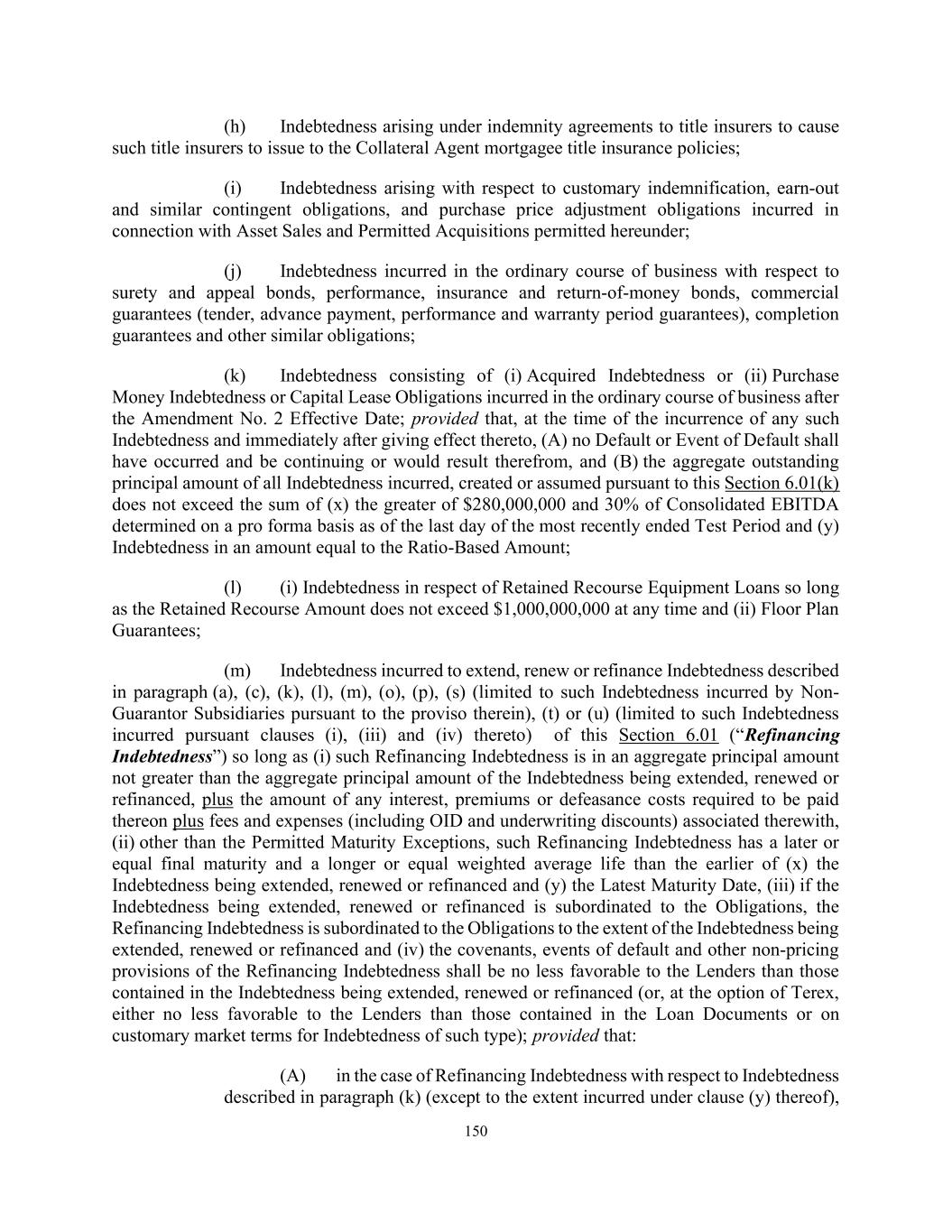 150 (h) Indebtedness arising under indemnity agreements to title insurers to cause such title insurers to issue to the Collateral Agent mortgagee title insurance policies; (i) Indebtedness arising with respect to customary indemnification, earn-out and similar contingent obligations, and purchase price adjustment obligations incurred in connection with Asset Sales and Permitted Acquisitions permitted hereunder; (j) Indebtedness incurred in the ordinary course of business with respect to surety and appeal bonds, performance, insurance and return-of-money bonds, commercial guarantees (tender, advance payment, performance and warranty period guarantees), completion guarantees and other similar obligations; (k) Indebtedness consisting of (i) Acquired Indebtedness or (ii) Purchase Money Indebtedness or Capital Lease Obligations incurred in the ordinary course of business after the Amendment No. 2 Effective Date; provided that, at the time of the incurrence of any such Indebtedness and immediately after giving effect thereto, (A) no Default or Event of Default shall have occurred and be continuing or would result therefrom, and (B) the aggregate outstanding principal amount of all Indebtedness incurred, created or assumed pursuant to this Section 6.01(k) does not exceed the sum of (x) the greater of $280,000,000 and 30% of Consolidated EBITDA determined on a pro forma basis as of the last day of the most recently ended Test Period and (y) Indebtedness in an amount equal to the Ratio-Based Amount; (l) (i) Indebtedness in respect of Retained Recourse Equipment Loans so long as the Retained Recourse Amount does not exceed $1,000,000,000 at any time and (ii) Floor Plan Guarantees; (m) Indebtedness incurred to extend, renew or refinance Indebtedness described in paragraph (a), (c), (k), (l), (m), (o), (p), (s) (limited to such Indebtedness incurred by Non- Guarantor Subsidiaries pursuant to the proviso therein), (t) or (u) (limited to such Indebtedness incurred pursuant clauses (i), (iii) and (iv) thereto) of this Section 6.01 (“Refinancing Indebtedness”) so long as (i) such Refinancing Indebtedness is in an aggregate principal amount not greater than the aggregate principal amount of the Indebtedness being extended, renewed or refinanced, plus the amount of any interest, premiums or defeasance costs required to be paid thereon plus fees and expenses (including OID and underwriting discounts) associated therewith, (ii) other than the Permitted Maturity Exceptions, such Refinancing Indebtedness has a later or equal final maturity and a longer or equal weighted average life than the earlier of (x) the Indebtedness being extended, renewed or refinanced and (y) the Latest Maturity Date, (iii) if the Indebtedness being extended, renewed or refinanced is subordinated to the Obligations, the Refinancing Indebtedness is subordinated to the Obligations to the extent of the Indebtedness being extended, renewed or refinanced and (iv) the covenants, events of default and other non-pricing provisions of the Refinancing Indebtedness shall be no less favorable to the Lenders than those contained in the Indebtedness being extended, renewed or refinanced (or, at the option of Terex, either no less favorable to the Lenders than those contained in the Loan Documents or on customary market terms for Indebtedness of such type); provided that: (A) in the case of Refinancing Indebtedness with respect to Indebtedness described in paragraph (k) (except to the extent incurred under clause (y) thereof),