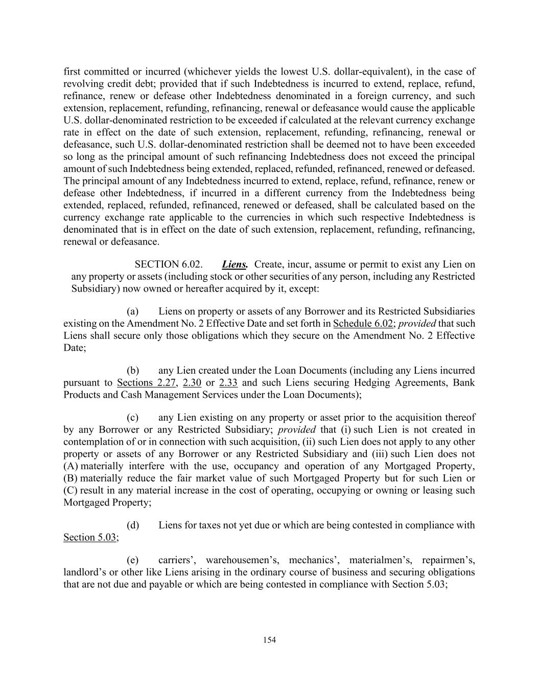 154 first committed or incurred (whichever yields the lowest U.S. dollar-equivalent), in the case of revolving credit debt; provided that if such Indebtedness is incurred to extend, replace, refund, refinance, renew or defease other Indebtedness denominated in a foreign currency, and such extension, replacement, refunding, refinancing, renewal or defeasance would cause the applicable U.S. dollar-denominated restriction to be exceeded if calculated at the relevant currency exchange rate in effect on the date of such extension, replacement, refunding, refinancing, renewal or defeasance, such U.S. dollar-denominated restriction shall be deemed not to have been exceeded so long as the principal amount of such refinancing Indebtedness does not exceed the principal amount of such Indebtedness being extended, replaced, refunded, refinanced, renewed or defeased. The principal amount of any Indebtedness incurred to extend, replace, refund, refinance, renew or defease other Indebtedness, if incurred in a different currency from the Indebtedness being extended, replaced, refunded, refinanced, renewed or defeased, shall be calculated based on the currency exchange rate applicable to the currencies in which such respective Indebtedness is denominated that is in effect on the date of such extension, replacement, refunding, refinancing, renewal or defeasance. SECTION 6.02. Liens. Create, incur, assume or permit to exist any Lien on any property or assets (including stock or other securities of any person, including any Restricted Subsidiary) now owned or hereafter acquired by it, except: (a) Liens on property or assets of any Borrower and its Restricted Subsidiaries existing on the Amendment No. 2 Effective Date and set forth in Schedule 6.02; provided that such Liens shall secure only those obligations which they secure on the Amendment No. 2 Effective Date; (b) any Lien created under the Loan Documents (including any Liens incurred pursuant to Sections 2.27, 2.30 or 2.33 and such Liens securing Hedging Agreements, Bank Products and Cash Management Services under the Loan Documents); (c) any Lien existing on any property or asset prior to the acquisition thereof by any Borrower or any Restricted Subsidiary; provided that (i) such Lien is not created in contemplation of or in connection with such acquisition, (ii) such Lien does not apply to any other property or assets of any Borrower or any Restricted Subsidiary and (iii) such Lien does not (A) materially interfere with the use, occupancy and operation of any Mortgaged Property, (B) materially reduce the fair market value of such Mortgaged Property but for such Lien or (C) result in any material increase in the cost of operating, occupying or owning or leasing such Mortgaged Property; (d) Liens for taxes not yet due or which are being contested in compliance with Section 5.03; (e) carriers’, warehousemen’s, mechanics’, materialmen’s, repairmen’s, landlord’s or other like Liens arising in the ordinary course of business and securing obligations that are not due and payable or which are being contested in compliance with Section 5.03;