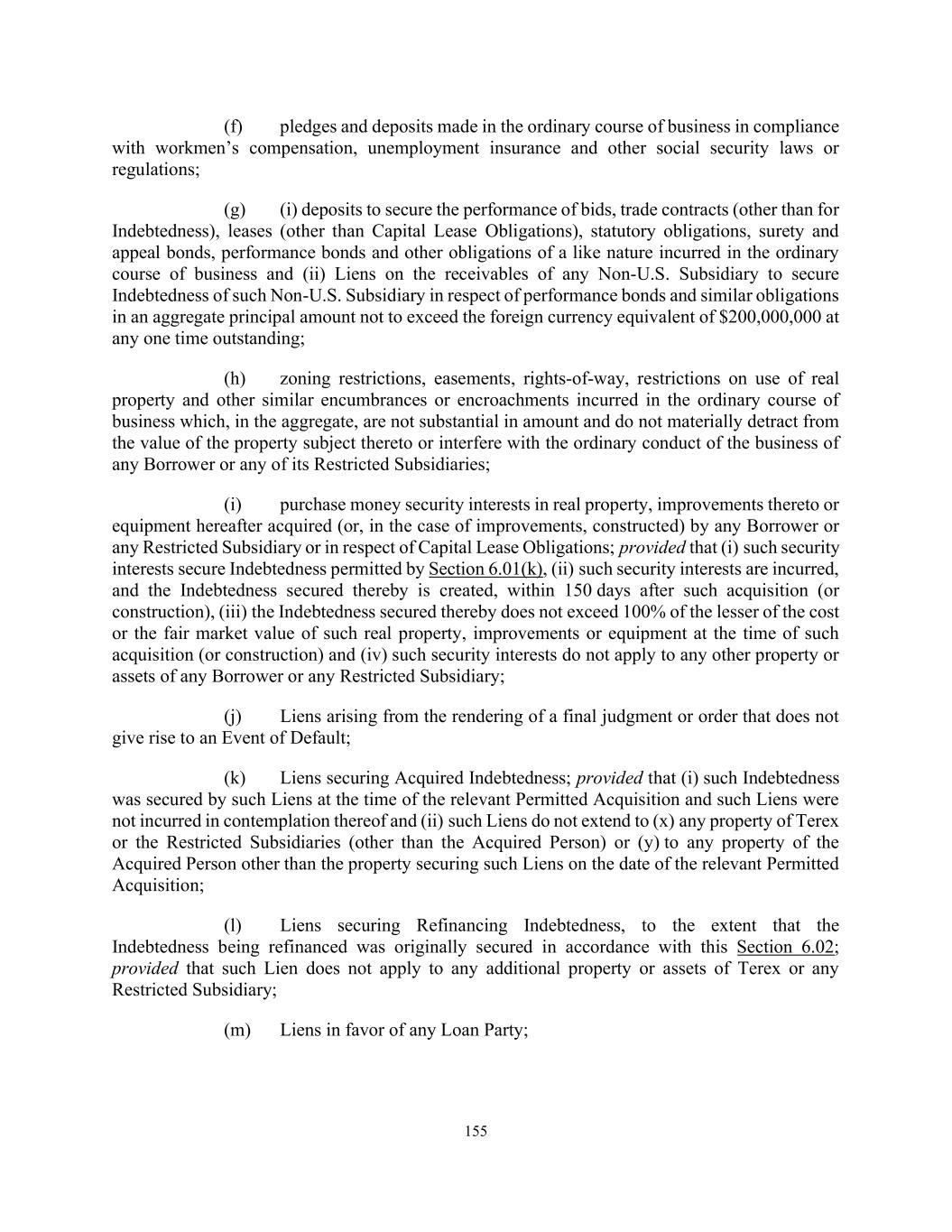 155 (f) pledges and deposits made in the ordinary course of business in compliance with workmen’s compensation, unemployment insurance and other social security laws or regulations; (g) (i) deposits to secure the performance of bids, trade contracts (other than for Indebtedness), leases (other than Capital Lease Obligations), statutory obligations, surety and appeal bonds, performance bonds and other obligations of a like nature incurred in the ordinary course of business and (ii) Liens on the receivables of any Non-U.S. Subsidiary to secure Indebtedness of such Non-U.S. Subsidiary in respect of performance bonds and similar obligations in an aggregate principal amount not to exceed the foreign currency equivalent of $200,000,000 at any one time outstanding; (h) zoning restrictions, easements, rights-of-way, restrictions on use of real property and other similar encumbrances or encroachments incurred in the ordinary course of business which, in the aggregate, are not substantial in amount and do not materially detract from the value of the property subject thereto or interfere with the ordinary conduct of the business of any Borrower or any of its Restricted Subsidiaries; (i) purchase money security interests in real property, improvements thereto or equipment hereafter acquired (or, in the case of improvements, constructed) by any Borrower or any Restricted Subsidiary or in respect of Capital Lease Obligations; provided that (i) such security interests secure Indebtedness permitted by Section 6.01(k), (ii) such security interests are incurred, and the Indebtedness secured thereby is created, within 150 days after such acquisition (or construction), (iii) the Indebtedness secured thereby does not exceed 100% of the lesser of the cost or the fair market value of such real property, improvements or equipment at the time of such acquisition (or construction) and (iv) such security interests do not apply to any other property or assets of any Borrower or any Restricted Subsidiary; (j) Liens arising from the rendering of a final judgment or order that does not give rise to an Event of Default; (k) Liens securing Acquired Indebtedness; provided that (i) such Indebtedness was secured by such Liens at the time of the relevant Permitted Acquisition and such Liens were not incurred in contemplation thereof and (ii) such Liens do not extend to (x) any property of Terex or the Restricted Subsidiaries (other than the Acquired Person) or (y) to any property of the Acquired Person other than the property securing such Liens on the date of the relevant Permitted Acquisition; (l) Liens securing Refinancing Indebtedness, to the extent that the Indebtedness being refinanced was originally secured in accordance with this Section 6.02; provided that such Lien does not apply to any additional property or assets of Terex or any Restricted Subsidiary; (m) Liens in favor of any Loan Party;