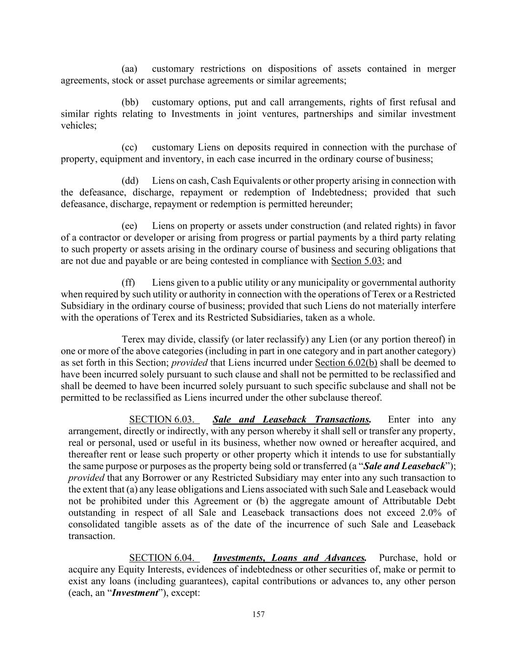 157 (aa) customary restrictions on dispositions of assets contained in merger agreements, stock or asset purchase agreements or similar agreements; (bb) customary options, put and call arrangements, rights of first refusal and similar rights relating to Investments in joint ventures, partnerships and similar investment vehicles; (cc) customary Liens on deposits required in connection with the purchase of property, equipment and inventory, in each case incurred in the ordinary course of business; (dd) Liens on cash, Cash Equivalents or other property arising in connection with the defeasance, discharge, repayment or redemption of Indebtedness; provided that such defeasance, discharge, repayment or redemption is permitted hereunder; (ee) Liens on property or assets under construction (and related rights) in favor of a contractor or developer or arising from progress or partial payments by a third party relating to such property or assets arising in the ordinary course of business and securing obligations that are not due and payable or are being contested in compliance with Section 5.03; and (ff) Liens given to a public utility or any municipality or governmental authority when required by such utility or authority in connection with the operations of Terex or a Restricted Subsidiary in the ordinary course of business; provided that such Liens do not materially interfere with the operations of Terex and its Restricted Subsidiaries, taken as a whole. Terex may divide, classify (or later reclassify) any Lien (or any portion thereof) in one or more of the above categories (including in part in one category and in part another category) as set forth in this Section; provided that Liens incurred under Section 6.02(b) shall be deemed to have been incurred solely pursuant to such clause and shall not be permitted to be reclassified and shall be deemed to have been incurred solely pursuant to such specific subclause and shall not be permitted to be reclassified as Liens incurred under the other subclause thereof. SECTION 6.03. Sale and Leaseback Transactions. Enter into any arrangement, directly or indirectly, with any person whereby it shall sell or transfer any property, real or personal, used or useful in its business, whether now owned or hereafter acquired, and thereafter rent or lease such property or other property which it intends to use for substantially the same purpose or purposes as the property being sold or transferred (a “Sale and Leaseback”); provided that any Borrower or any Restricted Subsidiary may enter into any such transaction to the extent that (a) any lease obligations and Liens associated with such Sale and Leaseback would not be prohibited under this Agreement or (b) the aggregate amount of Attributable Debt outstanding in respect of all Sale and Leaseback transactions does not exceed 2.0% of consolidated tangible assets as of the date of the incurrence of such Sale and Leaseback transaction. SECTION 6.04. Investments, Loans and Advances. Purchase, hold or acquire any Equity Interests, evidences of indebtedness or other securities of, make or permit to exist any loans (including guarantees), capital contributions or advances to, any other person (each, an “Investment”), except: