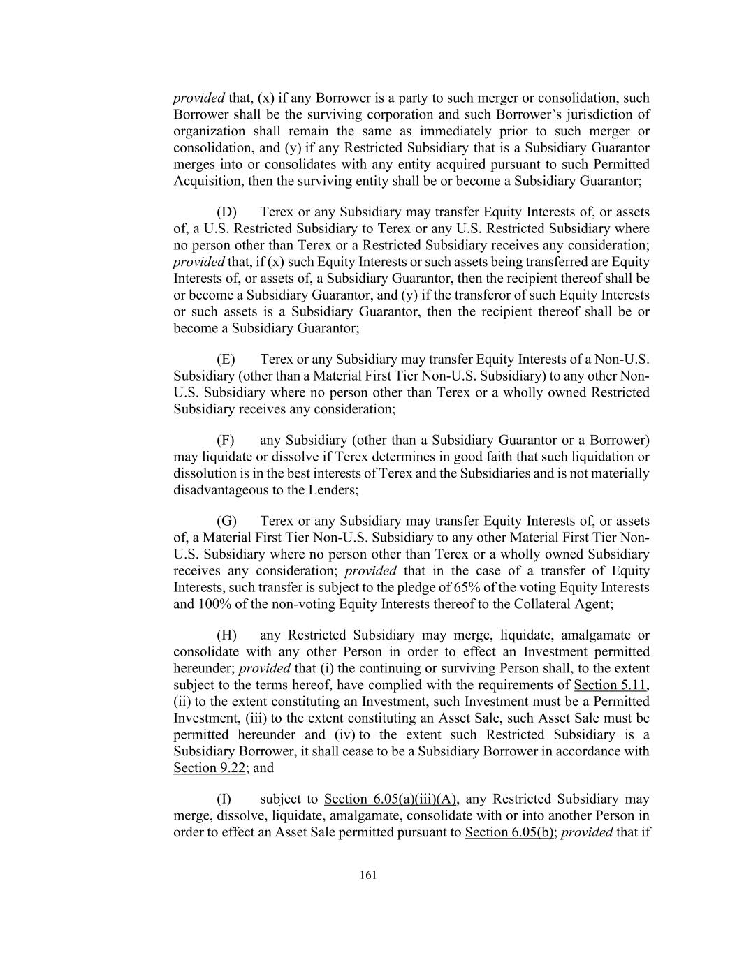161 provided that, (x) if any Borrower is a party to such merger or consolidation, such Borrower shall be the surviving corporation and such Borrower’s jurisdiction of organization shall remain the same as immediately prior to such merger or consolidation, and (y) if any Restricted Subsidiary that is a Subsidiary Guarantor merges into or consolidates with any entity acquired pursuant to such Permitted Acquisition, then the surviving entity shall be or become a Subsidiary Guarantor; (D) Terex or any Subsidiary may transfer Equity Interests of, or assets of, a U.S. Restricted Subsidiary to Terex or any U.S. Restricted Subsidiary where no person other than Terex or a Restricted Subsidiary receives any consideration; provided that, if (x) such Equity Interests or such assets being transferred are Equity Interests of, or assets of, a Subsidiary Guarantor, then the recipient thereof shall be or become a Subsidiary Guarantor, and (y) if the transferor of such Equity Interests or such assets is a Subsidiary Guarantor, then the recipient thereof shall be or become a Subsidiary Guarantor; (E) Terex or any Subsidiary may transfer Equity Interests of a Non-U.S. Subsidiary (other than a Material First Tier Non-U.S. Subsidiary) to any other Non- U.S. Subsidiary where no person other than Terex or a wholly owned Restricted Subsidiary receives any consideration; (F) any Subsidiary (other than a Subsidiary Guarantor or a Borrower) may liquidate or dissolve if Terex determines in good faith that such liquidation or dissolution is in the best interests of Terex and the Subsidiaries and is not materially disadvantageous to the Lenders; (G) Terex or any Subsidiary may transfer Equity Interests of, or assets of, a Material First Tier Non-U.S. Subsidiary to any other Material First Tier Non- U.S. Subsidiary where no person other than Terex or a wholly owned Subsidiary receives any consideration; provided that in the case of a transfer of Equity Interests, such transfer is subject to the pledge of 65% of the voting Equity Interests and 100% of the non-voting Equity Interests thereof to the Collateral Agent; (H) any Restricted Subsidiary may merge, liquidate, amalgamate or consolidate with any other Person in order to effect an Investment permitted hereunder; provided that (i) the continuing or surviving Person shall, to the extent subject to the terms hereof, have complied with the requirements of Section 5.11, (ii) to the extent constituting an Investment, such Investment must be a Permitted Investment, (iii) to the extent constituting an Asset Sale, such Asset Sale must be permitted hereunder and (iv) to the extent such Restricted Subsidiary is a Subsidiary Borrower, it shall cease to be a Subsidiary Borrower in accordance with Section 9.22; and (I) subject to Section 6.05(a)(iii)(A), any Restricted Subsidiary may merge, dissolve, liquidate, amalgamate, consolidate with or into another Person in order to effect an Asset Sale permitted pursuant to Section 6.05(b); provided that if