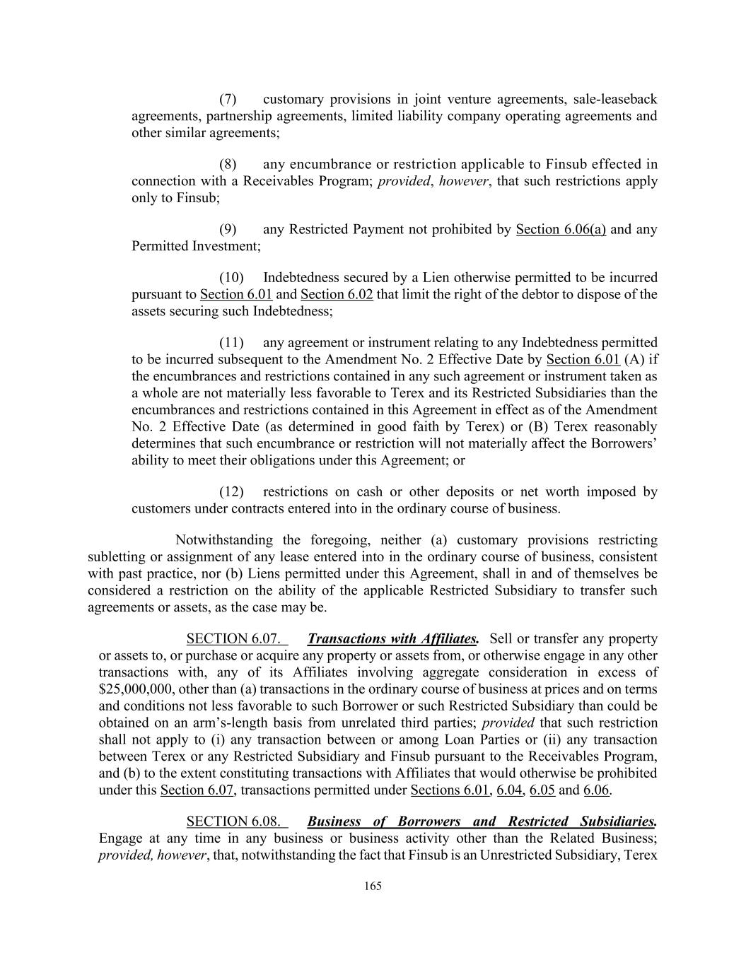 165 (7) customary provisions in joint venture agreements, sale-leaseback agreements, partnership agreements, limited liability company operating agreements and other similar agreements; (8) any encumbrance or restriction applicable to Finsub effected in connection with a Receivables Program; provided, however, that such restrictions apply only to Finsub; (9) any Restricted Payment not prohibited by Section 6.06(a) and any Permitted Investment; (10) Indebtedness secured by a Lien otherwise permitted to be incurred pursuant to Section 6.01 and Section 6.02 that limit the right of the debtor to dispose of the assets securing such Indebtedness; (11) any agreement or instrument relating to any Indebtedness permitted to be incurred subsequent to the Amendment No. 2 Effective Date by Section 6.01 (A) if the encumbrances and restrictions contained in any such agreement or instrument taken as a whole are not materially less favorable to Terex and its Restricted Subsidiaries than the encumbrances and restrictions contained in this Agreement in effect as of the Amendment No. 2 Effective Date (as determined in good faith by Terex) or (B) Terex reasonably determines that such encumbrance or restriction will not materially affect the Borrowers’ ability to meet their obligations under this Agreement; or (12) restrictions on cash or other deposits or net worth imposed by customers under contracts entered into in the ordinary course of business. Notwithstanding the foregoing, neither (a) customary provisions restricting subletting or assignment of any lease entered into in the ordinary course of business, consistent with past practice, nor (b) Liens permitted under this Agreement, shall in and of themselves be considered a restriction on the ability of the applicable Restricted Subsidiary to transfer such agreements or assets, as the case may be. SECTION 6.07. Transactions with Affiliates. Sell or transfer any property or assets to, or purchase or acquire any property or assets from, or otherwise engage in any other transactions with, any of its Affiliates involving aggregate consideration in excess of $25,000,000, other than (a) transactions in the ordinary course of business at prices and on terms and conditions not less favorable to such Borrower or such Restricted Subsidiary than could be obtained on an arm’s-length basis from unrelated third parties; provided that such restriction shall not apply to (i) any transaction between or among Loan Parties or (ii) any transaction between Terex or any Restricted Subsidiary and Finsub pursuant to the Receivables Program, and (b) to the extent constituting transactions with Affiliates that would otherwise be prohibited under this Section 6.07, transactions permitted under Sections 6.01, 6.04, 6.05 and 6.06. SECTION 6.08. Business of Borrowers and Restricted Subsidiaries. Engage at any time in any business or business activity other than the Related Business; provided, however, that, notwithstanding the fact that Finsub is an Unrestricted Subsidiary, Terex