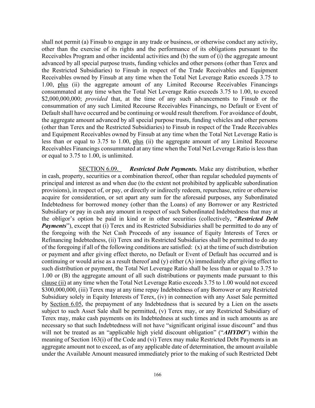 166 shall not permit (a) Finsub to engage in any trade or business, or otherwise conduct any activity, other than the exercise of its rights and the performance of its obligations pursuant to the Receivables Program and other incidental activities and (b) the sum of (i) the aggregate amount advanced by all special purpose trusts, funding vehicles and other persons (other than Terex and the Restricted Subsidiaries) to Finsub in respect of the Trade Receivables and Equipment Receivables owned by Finsub at any time when the Total Net Leverage Ratio exceeds 3.75 to 1.00, plus (ii) the aggregate amount of any Limited Recourse Receivables Financings consummated at any time when the Total Net Leverage Ratio exceeds 3.75 to 1.00, to exceed $2,000,000,000; provided that, at the time of any such advancements to Finsub or the consummation of any such Limited Recourse Receivables Financings, no Default or Event of Default shall have occurred and be continuing or would result therefrom. For avoidance of doubt, the aggregate amount advanced by all special purpose trusts, funding vehicles and other persons (other than Terex and the Restricted Subsidiaries) to Finsub in respect of the Trade Receivables and Equipment Receivables owned by Finsub at any time when the Total Net Leverage Ratio is less than or equal to 3.75 to 1.00, plus (ii) the aggregate amount of any Limited Recourse Receivables Financings consummated at any time when the Total Net Leverage Ratio is less than or equal to 3.75 to 1.00, is unlimited. SECTION 6.09. Restricted Debt Payments. Make any distribution, whether in cash, property, securities or a combination thereof, other than regular scheduled payments of principal and interest as and when due (to the extent not prohibited by applicable subordination provisions), in respect of, or pay, or directly or indirectly redeem, repurchase, retire or otherwise acquire for consideration, or set apart any sum for the aforesaid purposes, any Subordinated Indebtedness for borrowed money (other than the Loans) of any Borrower or any Restricted Subsidiary or pay in cash any amount in respect of such Subordinated Indebtedness that may at the obligor’s option be paid in kind or in other securities (collectively, “Restricted Debt Payments”), except that (i) Terex and its Restricted Subsidiaries shall be permitted to do any of the foregoing with the Net Cash Proceeds of any issuance of Equity Interests of Terex or Refinancing Indebtedness, (ii) Terex and its Restricted Subsidiaries shall be permitted to do any of the foregoing if all of the following conditions are satisfied: (x) at the time of such distribution or payment and after giving effect thereto, no Default or Event of Default has occurred and is continuing or would arise as a result thereof and (y) either (A) immediately after giving effect to such distribution or payment, the Total Net Leverage Ratio shall be less than or equal to 3.75 to 1.00 or (B) the aggregate amount of all such distributions or payments made pursuant to this clause (ii) at any time when the Total Net Leverage Ratio exceeds 3.75 to 1.00 would not exceed $300,000,000, (iii) Terex may at any time repay Indebtedness of any Borrower or any Restricted Subsidiary solely in Equity Interests of Terex, (iv) in connection with any Asset Sale permitted by Section 6.05, the prepayment of any Indebtedness that is secured by a Lien on the assets subject to such Asset Sale shall be permitted, (v) Terex may, or any Restricted Subsidiary of Terex may, make cash payments on its Indebtedness at such times and in such amounts as are necessary so that such Indebtedness will not have “significant original issue discount” and thus will not be treated as an “applicable high yield discount obligation” (“AHYDO”) within the meaning of Section 163(i) of the Code and (vi) Terex may make Restricted Debt Payments in an aggregate amount not to exceed, as of any applicable date of determination, the amount available under the Available Amount measured immediately prior to the making of such Restricted Debt