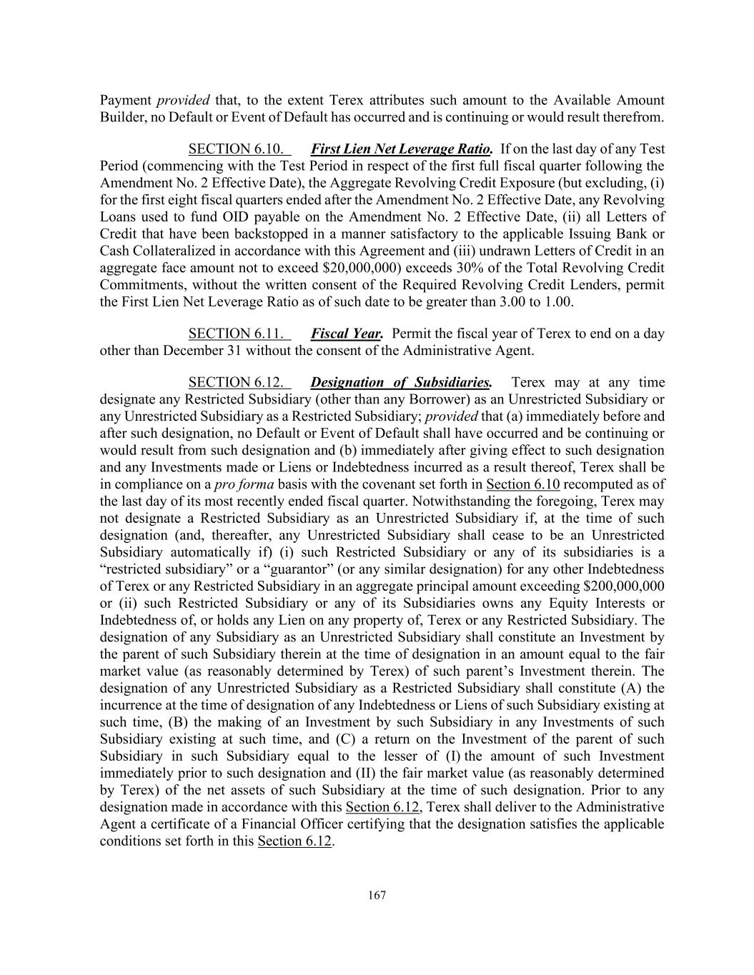 167 Payment provided that, to the extent Terex attributes such amount to the Available Amount Builder, no Default or Event of Default has occurred and is continuing or would result therefrom. SECTION 6.10. First Lien Net Leverage Ratio. If on the last day of any Test Period (commencing with the Test Period in respect of the first full fiscal quarter following the Amendment No. 2 Effective Date), the Aggregate Revolving Credit Exposure (but excluding, (i) for the first eight fiscal quarters ended after the Amendment No. 2 Effective Date, any Revolving Loans used to fund OID payable on the Amendment No. 2 Effective Date, (ii) all Letters of Credit that have been backstopped in a manner satisfactory to the applicable Issuing Bank or Cash Collateralized in accordance with this Agreement and (iii) undrawn Letters of Credit in an aggregate face amount not to exceed $20,000,000) exceeds 30% of the Total Revolving Credit Commitments, without the written consent of the Required Revolving Credit Lenders, permit the First Lien Net Leverage Ratio as of such date to be greater than 3.00 to 1.00. SECTION 6.11. Fiscal Year. Permit the fiscal year of Terex to end on a day other than December 31 without the consent of the Administrative Agent. SECTION 6.12. Designation of Subsidiaries. Terex may at any time designate any Restricted Subsidiary (other than any Borrower) as an Unrestricted Subsidiary or any Unrestricted Subsidiary as a Restricted Subsidiary; provided that (a) immediately before and after such designation, no Default or Event of Default shall have occurred and be continuing or would result from such designation and (b) immediately after giving effect to such designation and any Investments made or Liens or Indebtedness incurred as a result thereof, Terex shall be in compliance on a pro forma basis with the covenant set forth in Section 6.10 recomputed as of the last day of its most recently ended fiscal quarter. Notwithstanding the foregoing, Terex may not designate a Restricted Subsidiary as an Unrestricted Subsidiary if, at the time of such designation (and, thereafter, any Unrestricted Subsidiary shall cease to be an Unrestricted Subsidiary automatically if) (i) such Restricted Subsidiary or any of its subsidiaries is a “restricted subsidiary” or a “guarantor” (or any similar designation) for any other Indebtedness of Terex or any Restricted Subsidiary in an aggregate principal amount exceeding $200,000,000 or (ii) such Restricted Subsidiary or any of its Subsidiaries owns any Equity Interests or Indebtedness of, or holds any Lien on any property of, Terex or any Restricted Subsidiary. The designation of any Subsidiary as an Unrestricted Subsidiary shall constitute an Investment by the parent of such Subsidiary therein at the time of designation in an amount equal to the fair market value (as reasonably determined by Terex) of such parent’s Investment therein. The designation of any Unrestricted Subsidiary as a Restricted Subsidiary shall constitute (A) the incurrence at the time of designation of any Indebtedness or Liens of such Subsidiary existing at such time, (B) the making of an Investment by such Subsidiary in any Investments of such Subsidiary existing at such time, and (C) a return on the Investment of the parent of such Subsidiary in such Subsidiary equal to the lesser of (I) the amount of such Investment immediately prior to such designation and (II) the fair market value (as reasonably determined by Terex) of the net assets of such Subsidiary at the time of such designation. Prior to any designation made in accordance with this Section 6.12, Terex shall deliver to the Administrative Agent a certificate of a Financial Officer certifying that the designation satisfies the applicable conditions set forth in this Section 6.12.