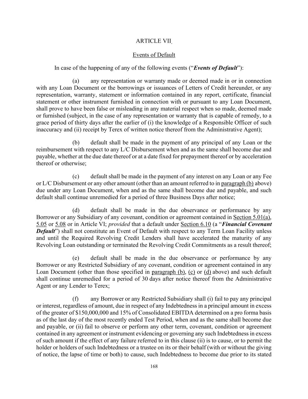 168 ARTICLE VII Events of Default In case of the happening of any of the following events (“Events of Default”): (a) any representation or warranty made or deemed made in or in connection with any Loan Document or the borrowings or issuances of Letters of Credit hereunder, or any representation, warranty, statement or information contained in any report, certificate, financial statement or other instrument furnished in connection with or pursuant to any Loan Document, shall prove to have been false or misleading in any material respect when so made, deemed made or furnished (subject, in the case of any representation or warranty that is capable of remedy, to a grace period of thirty days after the earlier of (i) the knowledge of a Responsible Officer of such inaccuracy and (ii) receipt by Terex of written notice thereof from the Administrative Agent); (b) default shall be made in the payment of any principal of any Loan or the reimbursement with respect to any L/C Disbursement when and as the same shall become due and payable, whether at the due date thereof or at a date fixed for prepayment thereof or by acceleration thereof or otherwise; (c) default shall be made in the payment of any interest on any Loan or any Fee or L/C Disbursement or any other amount (other than an amount referred to in paragraph (b) above) due under any Loan Document, when and as the same shall become due and payable, and such default shall continue unremedied for a period of three Business Days after notice; (d) default shall be made in the due observance or performance by any Borrower or any Subsidiary of any covenant, condition or agreement contained in Section 5.01(a), 5.05 or 5.08 or in Article VI; provided that a default under Section 6.10 (a “Financial Covenant Default”) shall not constitute an Event of Default with respect to any Term Loan Facility unless and until the Required Revolving Credit Lenders shall have accelerated the maturity of any Revolving Loan outstanding or terminated the Revolving Credit Commitments as a result thereof; (e) default shall be made in the due observance or performance by any Borrower or any Restricted Subsidiary of any covenant, condition or agreement contained in any Loan Document (other than those specified in paragraph (b), (c) or (d) above) and such default shall continue unremedied for a period of 30 days after notice thereof from the Administrative Agent or any Lender to Terex; (f) any Borrower or any Restricted Subsidiary shall (i) fail to pay any principal or interest, regardless of amount, due in respect of any Indebtedness in a principal amount in excess of the greater of $150,000,000 and 15% of Consolidated EBITDA determined on a pro forma basis as of the last day of the most recently ended Test Period, when and as the same shall become due and payable, or (ii) fail to observe or perform any other term, covenant, condition or agreement contained in any agreement or instrument evidencing or governing any such Indebtedness in excess of such amount if the effect of any failure referred to in this clause (ii) is to cause, or to permit the holder or holders of such Indebtedness or a trustee on its or their behalf (with or without the giving of notice, the lapse of time or both) to cause, such Indebtedness to become due prior to its stated