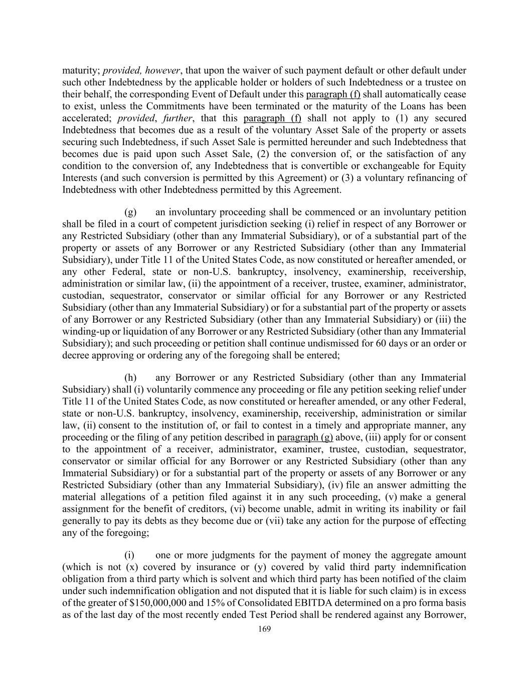 169 maturity; provided, however, that upon the waiver of such payment default or other default under such other Indebtedness by the applicable holder or holders of such Indebtedness or a trustee on their behalf, the corresponding Event of Default under this paragraph (f) shall automatically cease to exist, unless the Commitments have been terminated or the maturity of the Loans has been accelerated; provided, further, that this paragraph (f) shall not apply to (1) any secured Indebtedness that becomes due as a result of the voluntary Asset Sale of the property or assets securing such Indebtedness, if such Asset Sale is permitted hereunder and such Indebtedness that becomes due is paid upon such Asset Sale, (2) the conversion of, or the satisfaction of any condition to the conversion of, any Indebtedness that is convertible or exchangeable for Equity Interests (and such conversion is permitted by this Agreement) or (3) a voluntary refinancing of Indebtedness with other Indebtedness permitted by this Agreement. (g) an involuntary proceeding shall be commenced or an involuntary petition shall be filed in a court of competent jurisdiction seeking (i) relief in respect of any Borrower or any Restricted Subsidiary (other than any Immaterial Subsidiary), or of a substantial part of the property or assets of any Borrower or any Restricted Subsidiary (other than any Immaterial Subsidiary), under Title 11 of the United States Code, as now constituted or hereafter amended, or any other Federal, state or non-U.S. bankruptcy, insolvency, examinership, receivership, administration or similar law, (ii) the appointment of a receiver, trustee, examiner, administrator, custodian, sequestrator, conservator or similar official for any Borrower or any Restricted Subsidiary (other than any Immaterial Subsidiary) or for a substantial part of the property or assets of any Borrower or any Restricted Subsidiary (other than any Immaterial Subsidiary) or (iii) the winding-up or liquidation of any Borrower or any Restricted Subsidiary (other than any Immaterial Subsidiary); and such proceeding or petition shall continue undismissed for 60 days or an order or decree approving or ordering any of the foregoing shall be entered; (h) any Borrower or any Restricted Subsidiary (other than any Immaterial Subsidiary) shall (i) voluntarily commence any proceeding or file any petition seeking relief under Title 11 of the United States Code, as now constituted or hereafter amended, or any other Federal, state or non-U.S. bankruptcy, insolvency, examinership, receivership, administration or similar law, (ii) consent to the institution of, or fail to contest in a timely and appropriate manner, any proceeding or the filing of any petition described in paragraph (g) above, (iii) apply for or consent to the appointment of a receiver, administrator, examiner, trustee, custodian, sequestrator, conservator or similar official for any Borrower or any Restricted Subsidiary (other than any Immaterial Subsidiary) or for a substantial part of the property or assets of any Borrower or any Restricted Subsidiary (other than any Immaterial Subsidiary), (iv) file an answer admitting the material allegations of a petition filed against it in any such proceeding, (v) make a general assignment for the benefit of creditors, (vi) become unable, admit in writing its inability or fail generally to pay its debts as they become due or (vii) take any action for the purpose of effecting any of the foregoing; (i) one or more judgments for the payment of money the aggregate amount (which is not (x) covered by insurance or (y) covered by valid third party indemnification obligation from a third party which is solvent and which third party has been notified of the claim under such indemnification obligation and not disputed that it is liable for such claim) is in excess of the greater of $150,000,000 and 15% of Consolidated EBITDA determined on a pro forma basis as of the last day of the most recently ended Test Period shall be rendered against any Borrower,