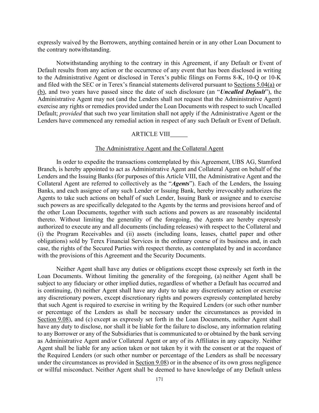 171 expressly waived by the Borrowers, anything contained herein or in any other Loan Document to the contrary notwithstanding. Notwithstanding anything to the contrary in this Agreement, if any Default or Event of Default results from any action or the occurrence of any event that has been disclosed in writing to the Administrative Agent or disclosed in Terex’s public filings on Forms 8-K, 10-Q or 10-K and filed with the SEC or in Terex’s financial statements delivered pursuant to Sections 5.04(a) or (b), and two years have passed since the date of such disclosure (an “Uncalled Default”), the Administrative Agent may not (and the Lenders shall not request that the Administrative Agent) exercise any rights or remedies provided under the Loan Documents with respect to such Uncalled Default; provided that such two year limitation shall not apply if the Administrative Agent or the Lenders have commenced any remedial action in respect of any such Default or Event of Default. ARTICLE VIII The Administrative Agent and the Collateral Agent In order to expedite the transactions contemplated by this Agreement, UBS AG, Stamford Branch, is hereby appointed to act as Administrative Agent and Collateral Agent on behalf of the Lenders and the Issuing Banks (for purposes of this Article VIII, the Administrative Agent and the Collateral Agent are referred to collectively as the “Agents”). Each of the Lenders, the Issuing Banks, and each assignee of any such Lender or Issuing Bank, hereby irrevocably authorizes the Agents to take such actions on behalf of such Lender, Issuing Bank or assignee and to exercise such powers as are specifically delegated to the Agents by the terms and provisions hereof and of the other Loan Documents, together with such actions and powers as are reasonably incidental thereto. Without limiting the generality of the foregoing, the Agents are hereby expressly authorized to execute any and all documents (including releases) with respect to the Collateral and (i) the Program Receivables and (ii) assets (including loans, leases, chattel paper and other obligations) sold by Terex Financial Services in the ordinary course of its business and, in each case, the rights of the Secured Parties with respect thereto, as contemplated by and in accordance with the provisions of this Agreement and the Security Documents. Neither Agent shall have any duties or obligations except those expressly set forth in the Loan Documents. Without limiting the generality of the foregoing, (a) neither Agent shall be subject to any fiduciary or other implied duties, regardless of whether a Default has occurred and is continuing, (b) neither Agent shall have any duty to take any discretionary action or exercise any discretionary powers, except discretionary rights and powers expressly contemplated hereby that such Agent is required to exercise in writing by the Required Lenders (or such other number or percentage of the Lenders as shall be necessary under the circumstances as provided in Section 9.08), and (c) except as expressly set forth in the Loan Documents, neither Agent shall have any duty to disclose, nor shall it be liable for the failure to disclose, any information relating to any Borrower or any of the Subsidiaries that is communicated to or obtained by the bank serving as Administrative Agent and/or Collateral Agent or any of its Affiliates in any capacity. Neither Agent shall be liable for any action taken or not taken by it with the consent or at the request of the Required Lenders (or such other number or percentage of the Lenders as shall be necessary under the circumstances as provided in Section 9.08) or in the absence of its own gross negligence or willful misconduct. Neither Agent shall be deemed to have knowledge of any Default unless