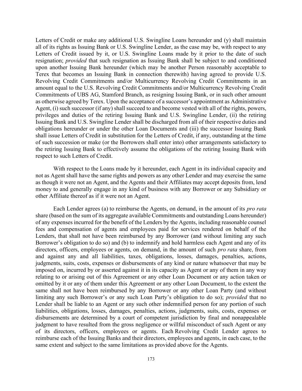 173 Letters of Credit or make any additional U.S. Swingline Loans hereunder and (y) shall maintain all of its rights as Issuing Bank or U.S. Swingline Lender, as the case may be, with respect to any Letters of Credit issued by it, or U.S. Swingline Loans made by it prior to the date of such resignation; provided that such resignation as Issuing Bank shall be subject to and conditioned upon another Issuing Bank hereunder (which may be another Person reasonably acceptable to Terex that becomes an Issuing Bank in connection therewith) having agreed to provide U.S. Revolving Credit Commitments and/or Multicurrency Revolving Credit Commitments in an amount equal to the U.S. Revolving Credit Commitments and/or Multicurrency Revolving Credit Commitments of UBS AG, Stamford Branch, as resigning Issuing Bank, or in such other amount as otherwise agreed by Terex. Upon the acceptance of a successor’s appointment as Administrative Agent, (i) such successor (if any) shall succeed to and become vested with all of the rights, powers, privileges and duties of the retiring Issuing Bank and U.S. Swingline Lender, (ii) the retiring Issuing Bank and U.S. Swingline Lender shall be discharged from all of their respective duties and obligations hereunder or under the other Loan Documents and (iii) the successor Issuing Bank shall issue Letters of Credit in substitution for the Letters of Credit, if any, outstanding at the time of such succession or make (or the Borrowers shall enter into) other arrangements satisfactory to the retiring Issuing Bank to effectively assume the obligations of the retiring Issuing Bank with respect to such Letters of Credit. With respect to the Loans made by it hereunder, each Agent in its individual capacity and not as Agent shall have the same rights and powers as any other Lender and may exercise the same as though it were not an Agent, and the Agents and their Affiliates may accept deposits from, lend money to and generally engage in any kind of business with any Borrower or any Subsidiary or other Affiliate thereof as if it were not an Agent. Each Lender agrees (a) to reimburse the Agents, on demand, in the amount of its pro rata share (based on the sum of its aggregate available Commitments and outstanding Loans hereunder) of any expenses incurred for the benefit of the Lenders by the Agents, including reasonable counsel fees and compensation of agents and employees paid for services rendered on behalf of the Lenders, that shall not have been reimbursed by any Borrower (and without limiting any such Borrower’s obligation to do so) and (b) to indemnify and hold harmless each Agent and any of its directors, officers, employees or agents, on demand, in the amount of such pro rata share, from and against any and all liabilities, taxes, obligations, losses, damages, penalties, actions, judgments, suits, costs, expenses or disbursements of any kind or nature whatsoever that may be imposed on, incurred by or asserted against it in its capacity as Agent or any of them in any way relating to or arising out of this Agreement or any other Loan Document or any action taken or omitted by it or any of them under this Agreement or any other Loan Document, to the extent the same shall not have been reimbursed by any Borrower or any other Loan Party (and without limiting any such Borrower’s or any such Loan Party’s obligation to do so); provided that no Lender shall be liable to an Agent or any such other indemnified person for any portion of such liabilities, obligations, losses, damages, penalties, actions, judgments, suits, costs, expenses or disbursements are determined by a court of competent jurisdiction by final and nonappealable judgment to have resulted from the gross negligence or willful misconduct of such Agent or any of its directors, officers, employees or agents. Each Revolving Credit Lender agrees to reimburse each of the Issuing Banks and their directors, employees and agents, in each case, to the same extent and subject to the same limitations as provided above for the Agents.