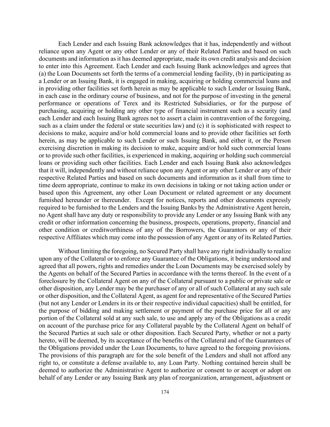 174 Each Lender and each Issuing Bank acknowledges that it has, independently and without reliance upon any Agent or any other Lender or any of their Related Parties and based on such documents and information as it has deemed appropriate, made its own credit analysis and decision to enter into this Agreement. Each Lender and each Issuing Bank acknowledges and agrees that (a) the Loan Documents set forth the terms of a commercial lending facility, (b) in participating as a Lender or an Issuing Bank, it is engaged in making, acquiring or holding commercial loans and in providing other facilities set forth herein as may be applicable to such Lender or Issuing Bank, in each case in the ordinary course of business, and not for the purpose of investing in the general performance or operations of Terex and its Restricted Subsidiaries, or for the purpose of purchasing, acquiring or holding any other type of financial instrument such as a security (and each Lender and each Issuing Bank agrees not to assert a claim in contravention of the foregoing, such as a claim under the federal or state securities law) and (c) it is sophisticated with respect to decisions to make, acquire and/or hold commercial loans and to provide other facilities set forth herein, as may be applicable to such Lender or such Issuing Bank, and either it, or the Person exercising discretion in making its decision to make, acquire and/or hold such commercial loans or to provide such other facilities, is experienced in making, acquiring or holding such commercial loans or providing such other facilities. Each Lender and each Issuing Bank also acknowledges that it will, independently and without reliance upon any Agent or any other Lender or any of their respective Related Parties and based on such documents and information as it shall from time to time deem appropriate, continue to make its own decisions in taking or not taking action under or based upon this Agreement, any other Loan Document or related agreement or any document furnished hereunder or thereunder. Except for notices, reports and other documents expressly required to be furnished to the Lenders and the Issuing Banks by the Administrative Agent herein, no Agent shall have any duty or responsibility to provide any Lender or any Issuing Bank with any credit or other information concerning the business, prospects, operations, property, financial and other condition or creditworthiness of any of the Borrowers, the Guarantors or any of their respective Affiliates which may come into the possession of any Agent or any of its Related Parties. Without limiting the foregoing, no Secured Party shall have any right individually to realize upon any of the Collateral or to enforce any Guarantee of the Obligations, it being understood and agreed that all powers, rights and remedies under the Loan Documents may be exercised solely by the Agents on behalf of the Secured Parties in accordance with the terms thereof. In the event of a foreclosure by the Collateral Agent on any of the Collateral pursuant to a public or private sale or other disposition, any Lender may be the purchaser of any or all of such Collateral at any such sale or other disposition, and the Collateral Agent, as agent for and representative of the Secured Parties (but not any Lender or Lenders in its or their respective individual capacities) shall be entitled, for the purpose of bidding and making settlement or payment of the purchase price for all or any portion of the Collateral sold at any such sale, to use and apply any of the Obligations as a credit on account of the purchase price for any Collateral payable by the Collateral Agent on behalf of the Secured Parties at such sale or other disposition. Each Secured Party, whether or not a party hereto, will be deemed, by its acceptance of the benefits of the Collateral and of the Guarantees of the Obligations provided under the Loan Documents, to have agreed to the foregoing provisions. The provisions of this paragraph are for the sole benefit of the Lenders and shall not afford any right to, or constitute a defense available to, any Loan Party. Nothing contained herein shall be deemed to authorize the Administrative Agent to authorize or consent to or accept or adopt on behalf of any Lender or any Issuing Bank any plan of reorganization, arrangement, adjustment or