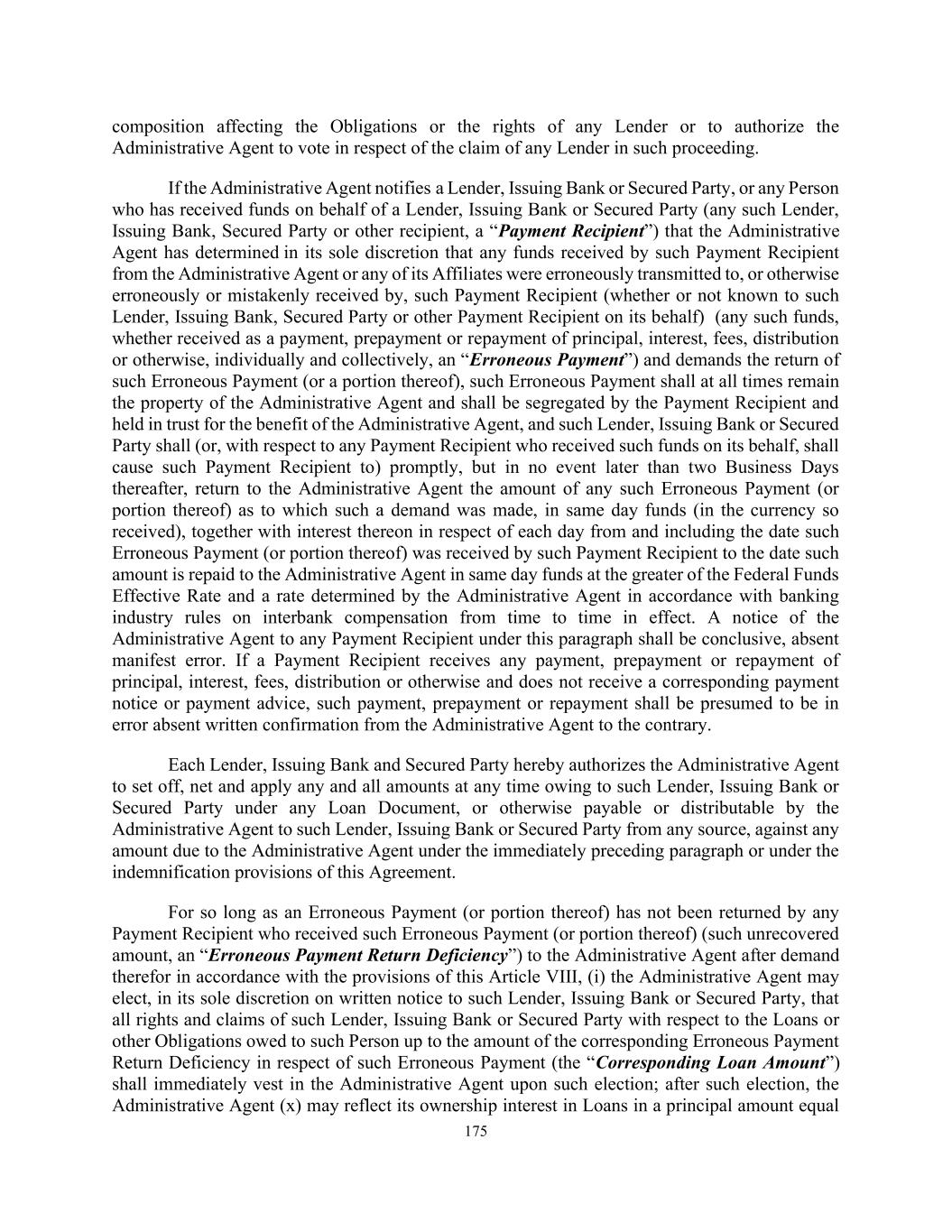 175 composition affecting the Obligations or the rights of any Lender or to authorize the Administrative Agent to vote in respect of the claim of any Lender in such proceeding. If the Administrative Agent notifies a Lender, Issuing Bank or Secured Party, or any Person who has received funds on behalf of a Lender, Issuing Bank or Secured Party (any such Lender, Issuing Bank, Secured Party or other recipient, a “Payment Recipient”) that the Administrative Agent has determined in its sole discretion that any funds received by such Payment Recipient from the Administrative Agent or any of its Affiliates were erroneously transmitted to, or otherwise erroneously or mistakenly received by, such Payment Recipient (whether or not known to such Lender, Issuing Bank, Secured Party or other Payment Recipient on its behalf) (any such funds, whether received as a payment, prepayment or repayment of principal, interest, fees, distribution or otherwise, individually and collectively, an “Erroneous Payment”) and demands the return of such Erroneous Payment (or a portion thereof), such Erroneous Payment shall at all times remain the property of the Administrative Agent and shall be segregated by the Payment Recipient and held in trust for the benefit of the Administrative Agent, and such Lender, Issuing Bank or Secured Party shall (or, with respect to any Payment Recipient who received such funds on its behalf, shall cause such Payment Recipient to) promptly, but in no event later than two Business Days thereafter, return to the Administrative Agent the amount of any such Erroneous Payment (or portion thereof) as to which such a demand was made, in same day funds (in the currency so received), together with interest thereon in respect of each day from and including the date such Erroneous Payment (or portion thereof) was received by such Payment Recipient to the date such amount is repaid to the Administrative Agent in same day funds at the greater of the Federal Funds Effective Rate and a rate determined by the Administrative Agent in accordance with banking industry rules on interbank compensation from time to time in effect. A notice of the Administrative Agent to any Payment Recipient under this paragraph shall be conclusive, absent manifest error. If a Payment Recipient receives any payment, prepayment or repayment of principal, interest, fees, distribution or otherwise and does not receive a corresponding payment notice or payment advice, such payment, prepayment or repayment shall be presumed to be in error absent written confirmation from the Administrative Agent to the contrary. Each Lender, Issuing Bank and Secured Party hereby authorizes the Administrative Agent to set off, net and apply any and all amounts at any time owing to such Lender, Issuing Bank or Secured Party under any Loan Document, or otherwise payable or distributable by the Administrative Agent to such Lender, Issuing Bank or Secured Party from any source, against any amount due to the Administrative Agent under the immediately preceding paragraph or under the indemnification provisions of this Agreement. For so long as an Erroneous Payment (or portion thereof) has not been returned by any Payment Recipient who received such Erroneous Payment (or portion thereof) (such unrecovered amount, an “Erroneous Payment Return Deficiency”) to the Administrative Agent after demand therefor in accordance with the provisions of this Article VIII, (i) the Administrative Agent may elect, in its sole discretion on written notice to such Lender, Issuing Bank or Secured Party, that all rights and claims of such Lender, Issuing Bank or Secured Party with respect to the Loans or other Obligations owed to such Person up to the amount of the corresponding Erroneous Payment Return Deficiency in respect of such Erroneous Payment (the “Corresponding Loan Amount”) shall immediately vest in the Administrative Agent upon such election; after such election, the Administrative Agent (x) may reflect its ownership interest in Loans in a principal amount equal